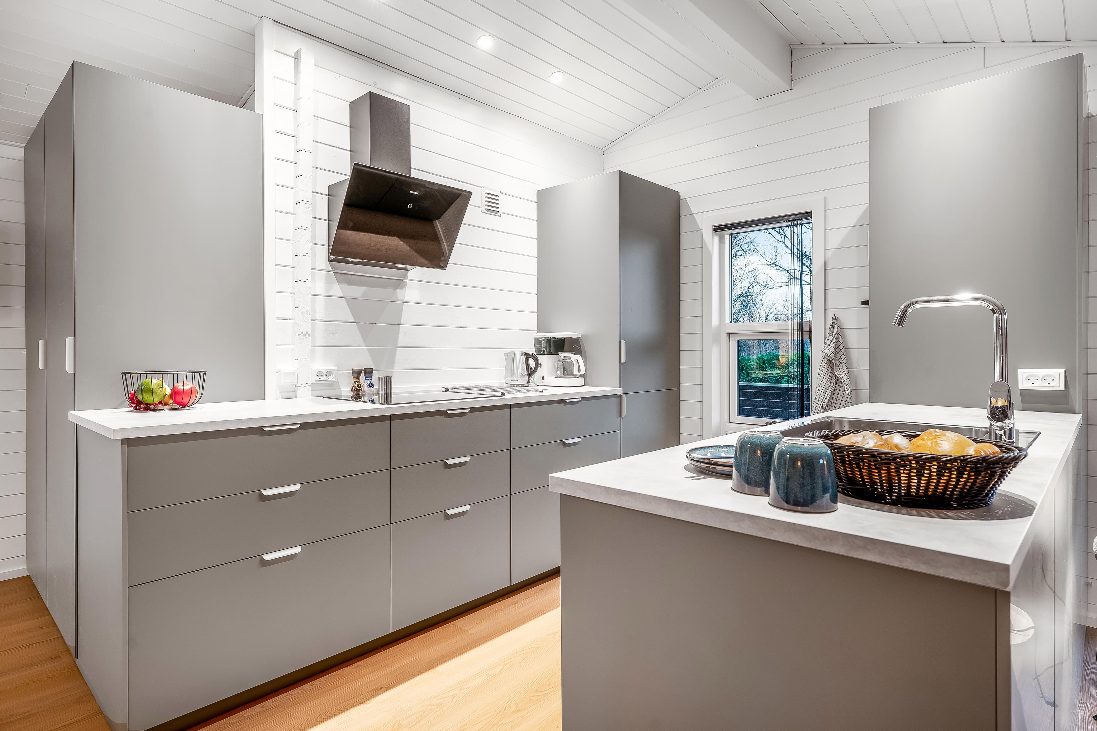 Die moderne Küche ist mit allem Notwendigen ausgestattet, darunter ein Induktionskochfeld, ein Backofen, eine Mikrowelle, ein Geschirrspüler, ein Kühlschrank und ein Gefrierschrank mit 60 Litern Fassungsvermögen. So lassen sich im Handumdrehen köstliche Mahlzeiten zubereiten, die Sie auf der schönen Terrasse genießen können. Dort steht Ihnen auch ein Grill für gemütliche Kochabende im Freien zur Verfügung.
