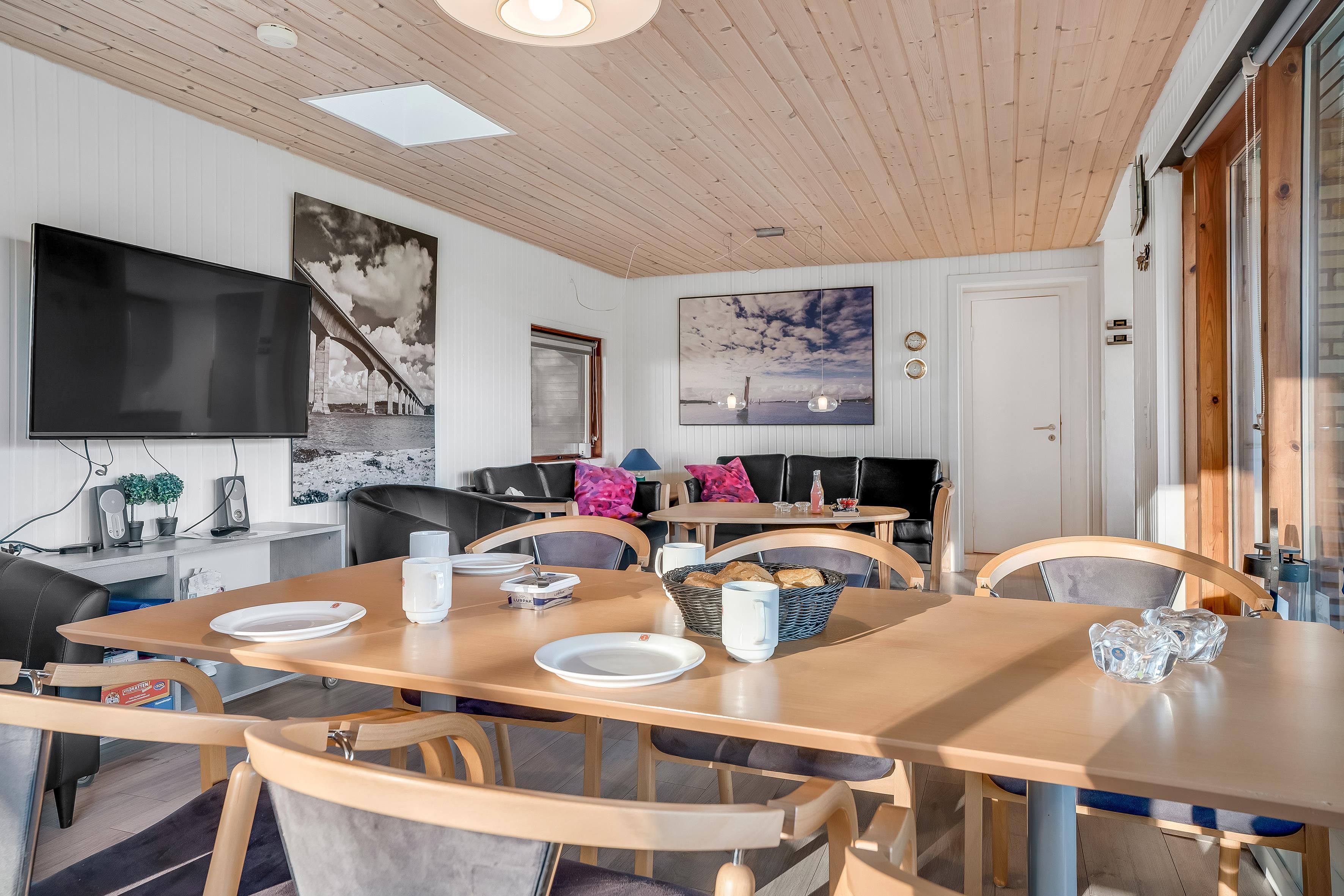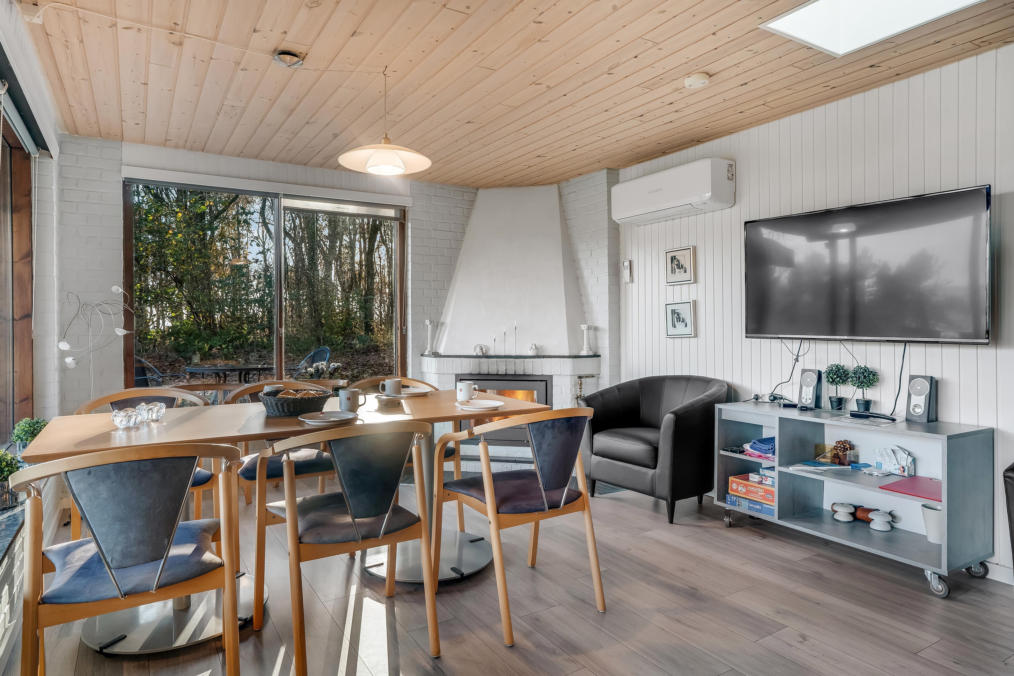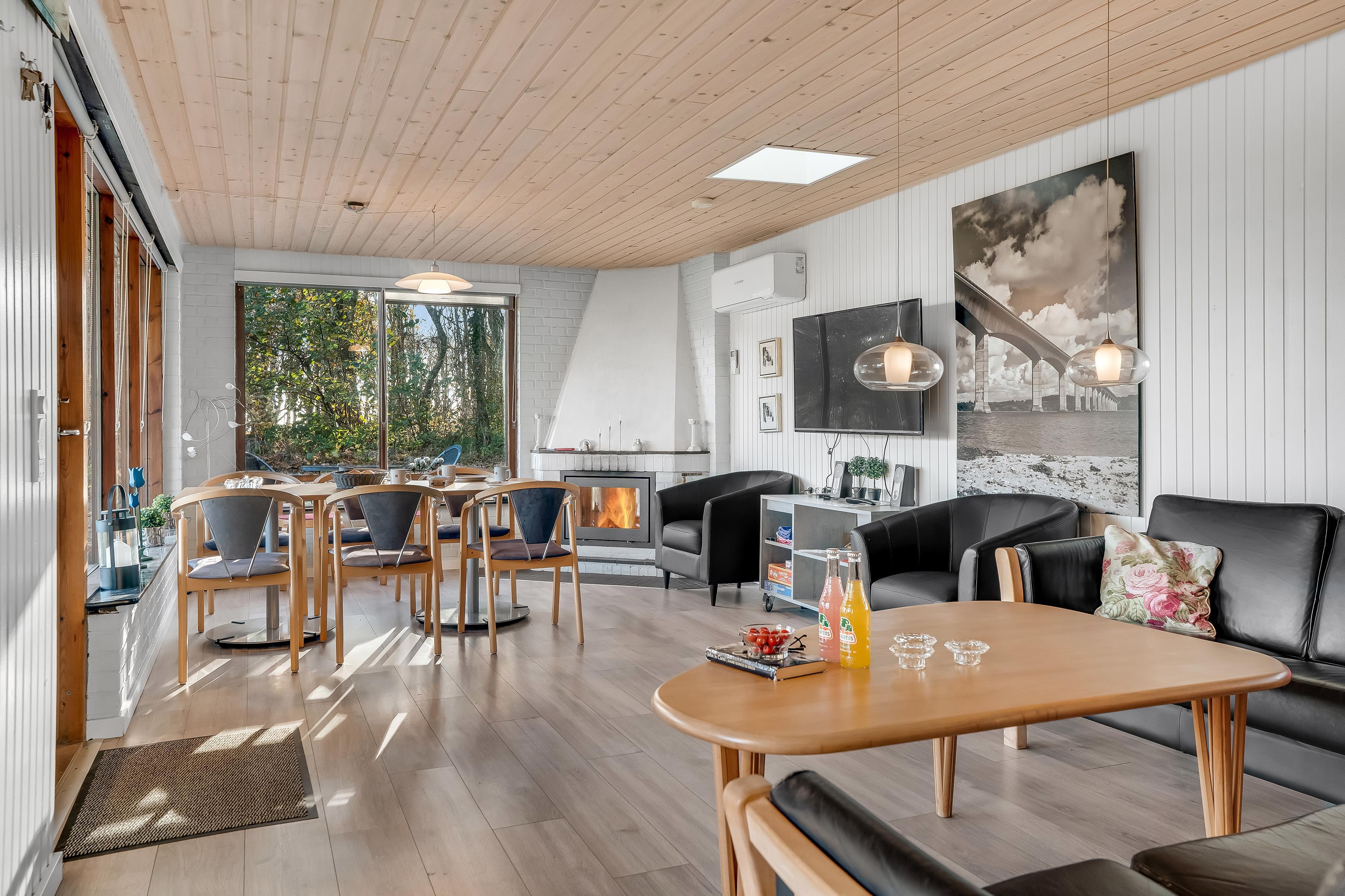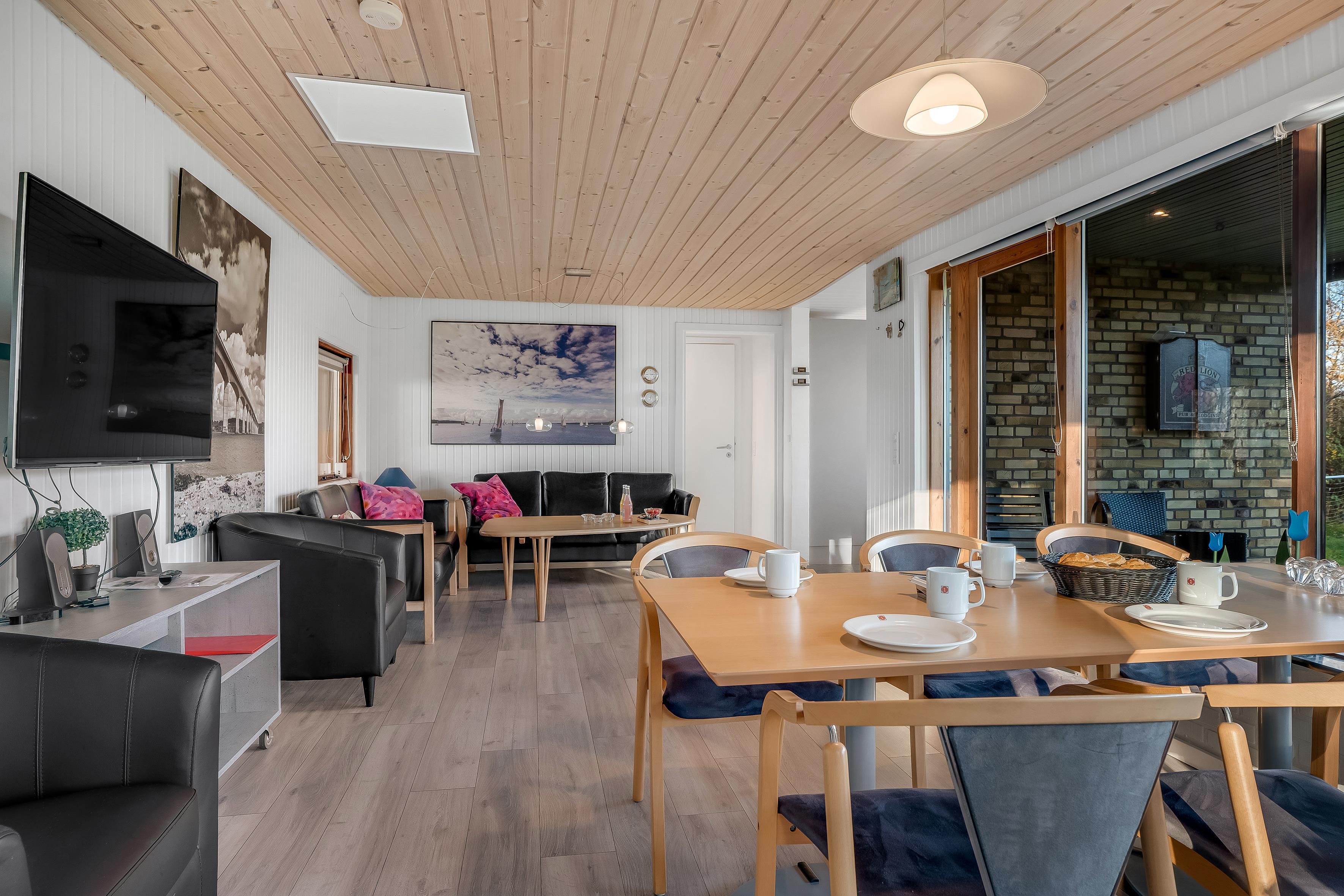 Beim Betreten des Hauses werden Sie sich sofort wie zu Hause fühlen. Der offene Wohnbereich verfügt über einen Kaminofen, der an kühleren Abenden für eine warme und gemütliche Atmosphäre sorgt. Hier können Sie sich bei einem guten Programm auf dem Flachbildfernseher entspannen, der sowohl dänisches als auch deutsches Fernsehen sowie Chromecast zum Streamen Ihrer Lieblingsfilme bietet. WLAN steht Ihnen ebenfalls zur Verfügung, sodass Sie bei Bedarf in Verbindung bleiben können.