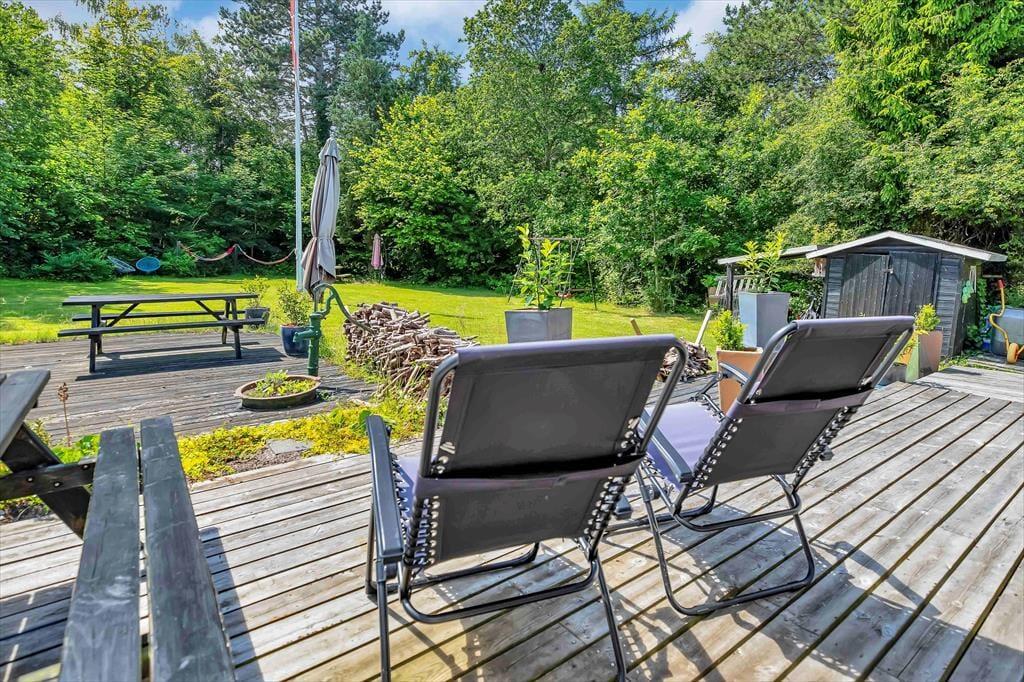 Auf der großen Terrasse, die sich in unterschiedliche Bereiche unterteilt, kannst du es dir ganz nach persönlicher Vorliebe im Schatten oder in der Sonne gemütlich machen. Sonnige Aufenthaltsplätze findest du von morgens bis abends. Während du in aller Ruhe die Seele baumeln lässt, spielen deine Kinder vergnügt Fußball oder die von euch mitgebrachten Gartenspiele. Dein Ferienhausgrundstück wirkt aufgrund der dichten Randbepflanzung wie eine kleine, private Oase, in der du dich vollends entspannst und mit bester Urlaubsstimmung verwöhnt wirst.