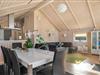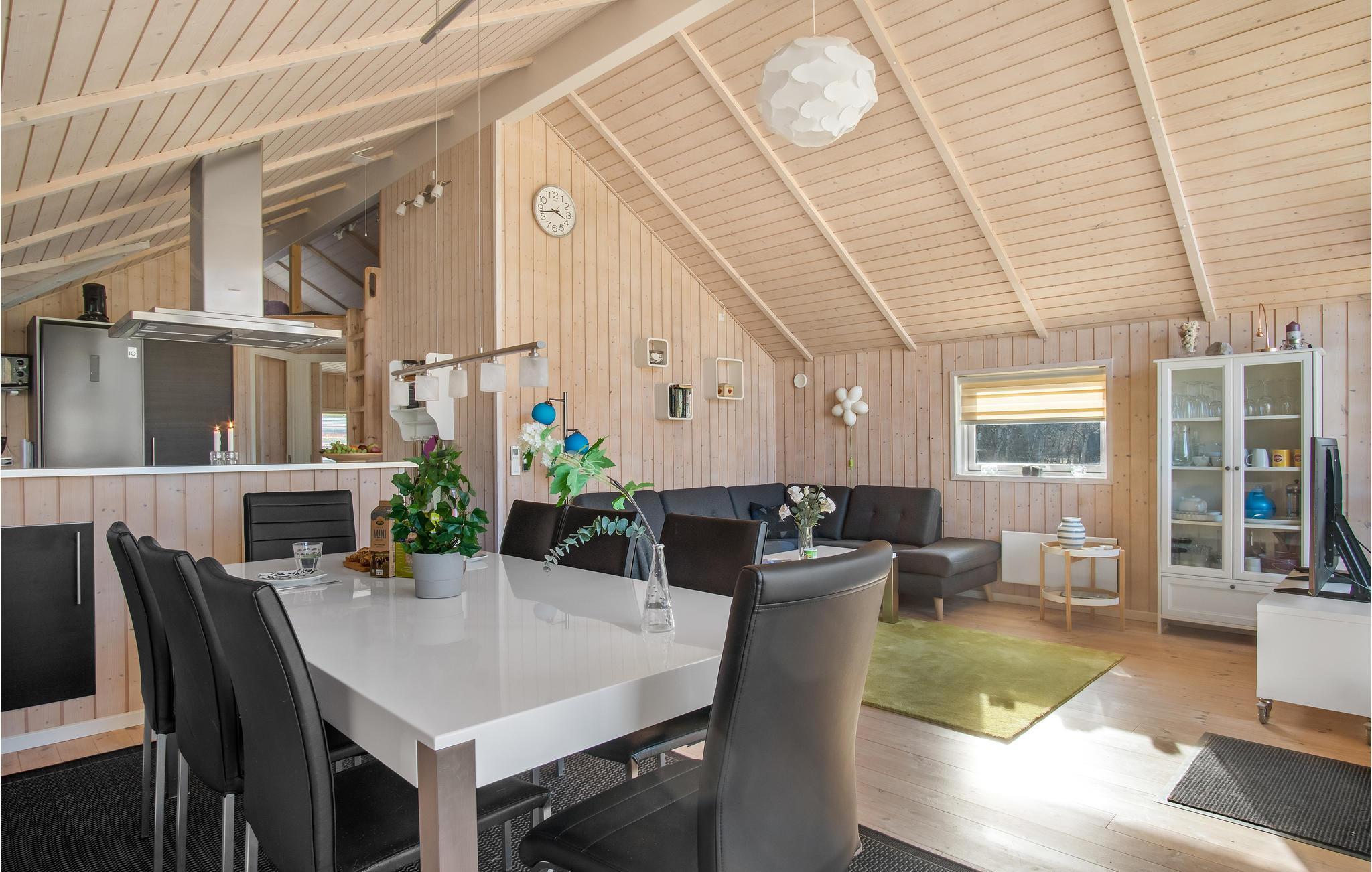 In den hellen Räumen des komfortablen Hauses können Sie mit der ganzen Familie herrlich entspannen. Die Holzverkleidung und moderne Einrichtung sorgt für eine wohnliche Atmosphäre, die Glasfront lässt viel Tageslicht ins Innere des Hauses. Kochen Sie hier mit Blick in den Garten, genießen Sie die Mahlzeiten gemeinsam am langen Esstisch, ebenfalls mit einem wunderbaren Blick in den Garten. Machen Sie es sich später auf dem Sofa bequem, nach einem herrlichen Urlaubstag, den Sie am Strand oder mit einem Ausflug verbracht haben, können Sie abends im Kaminofen anfeuern und noch lange gemütlich zusammensitzen.
