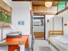 Ihr funktional gestaltetes Ferienhaus bietet eine solide Grundlage für entspannte Tage in naturnaher Umgebung. Genießen Sie die Nähe zur Ostsee und freuen Sie sich auf den hellen Wohnbereich Ihres Ferienhauses, der mit zweckmäßigen Möbeln ausgestattet ist. Nutzen Sie die Sitzecke für eine Tasse Tee oder ein Gesellschaftsspiel und bereiten Sie Ihre Mahlzeiten in der offenen Küche mit Blick in den Garten zu. Der zentrale Holzofen sorgt an kühleren Tagen für angenehme Wärme. Durch die großen Fenster fällt viel Licht in die Räume, was die Atmosphäre freundlich und offen wirken lässt.