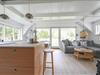 Der offene Wohn- und Küchenbereich mit sichtbaren Holzbalken und Kaminofen bildet das Herz des Hauses – perfekt für gemeinsame Stunden und erholsame Abende.