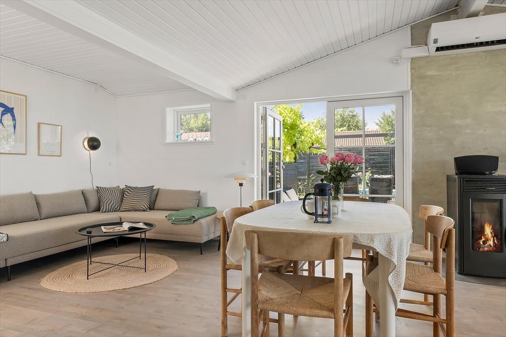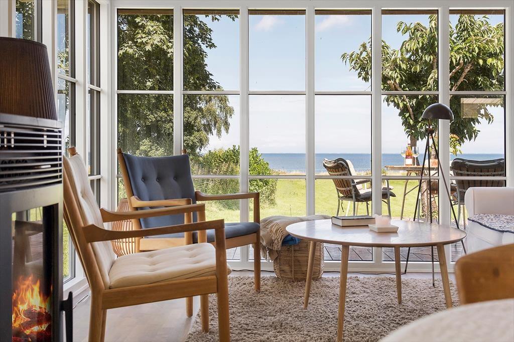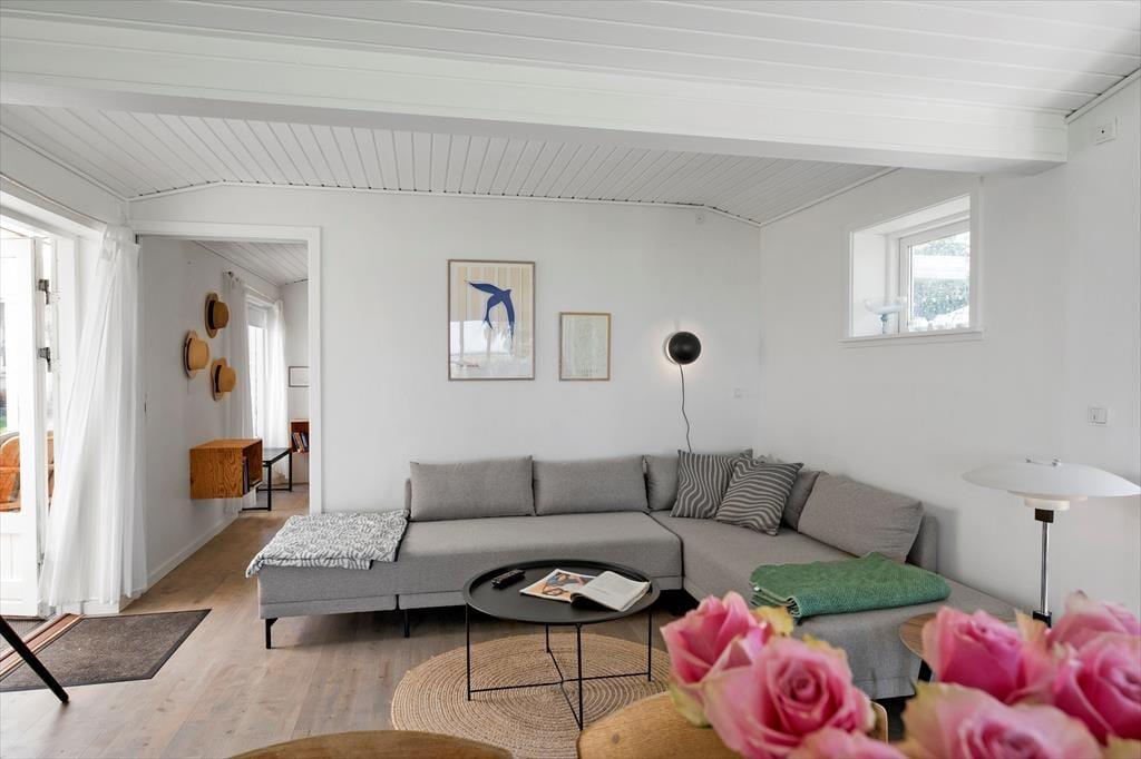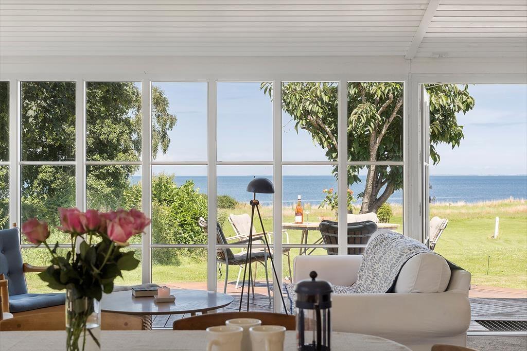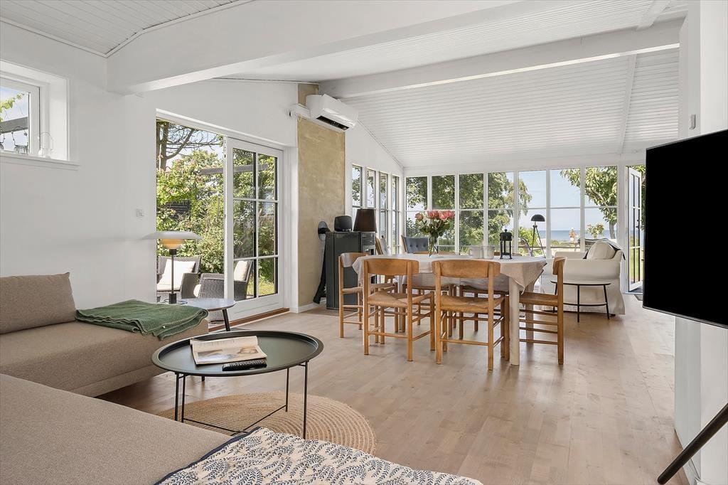 Das Wohnzimmer ist hell und einladend, die großen Fenster bieten nicht nur viel Licht, sondern auch einen atemberaubenden Meerblick. Von hier aus gelangt man direkt auf die Terrasse. Der Raum verfügt über einen Essbereich, komfortable Sofas und Sessel sowie ein Smart-TV mit dänischen DR-Sendern und More TV-Paket über App.