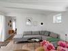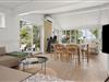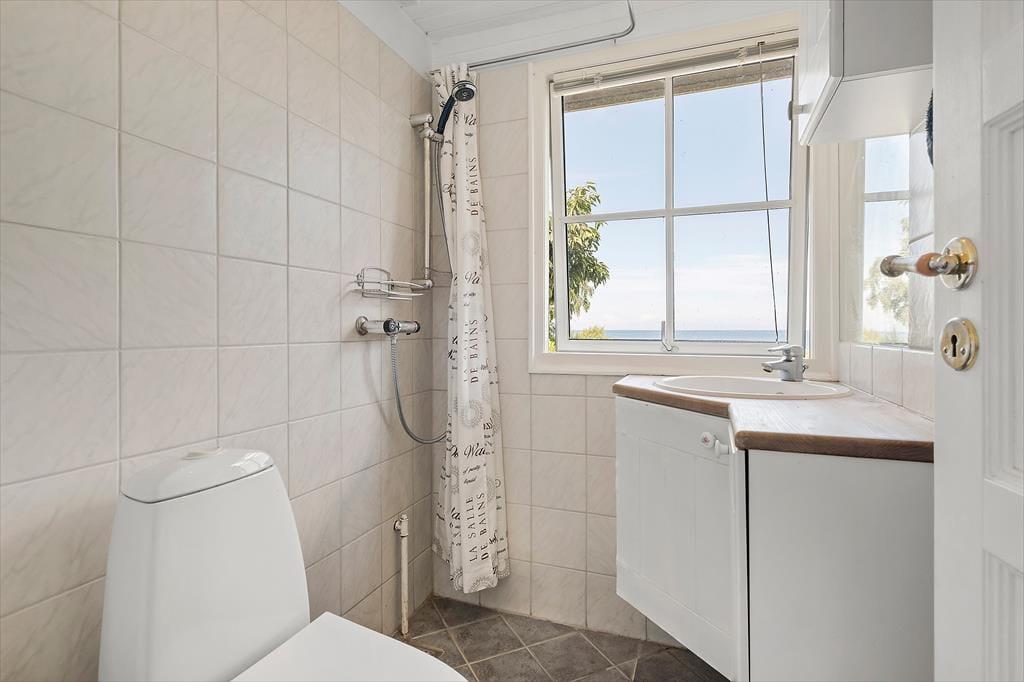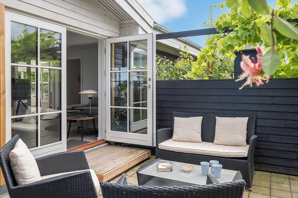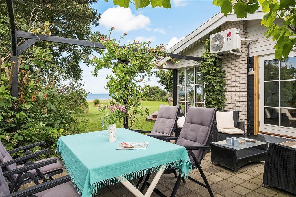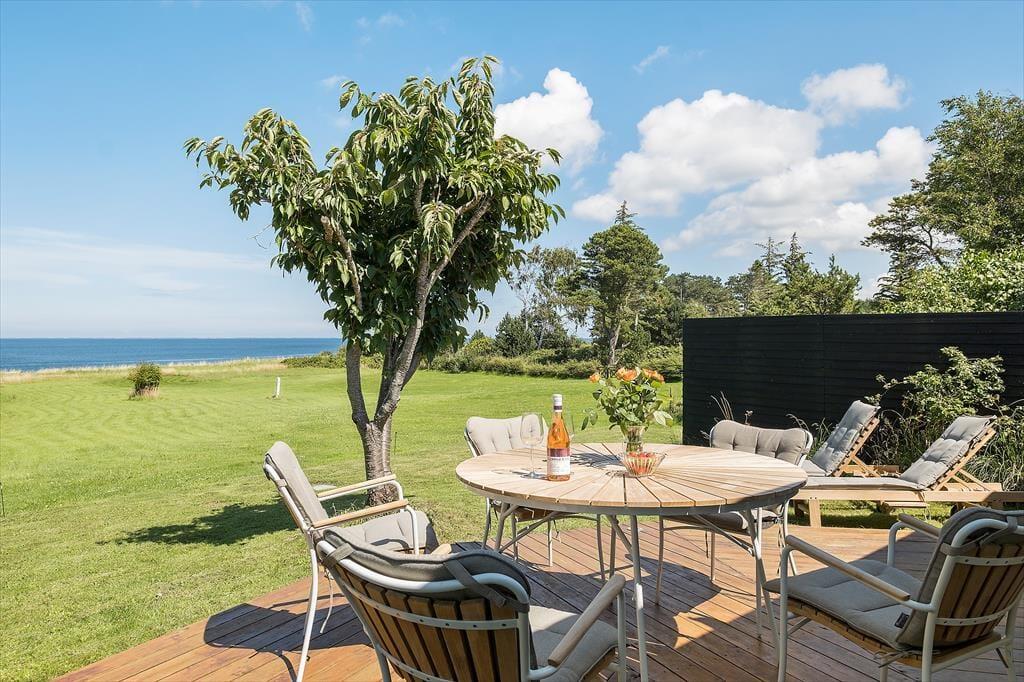 Das Wohnzimmer ist hell und einladend, die großen Fenster bieten nicht nur viel Licht, sondern auch einen atemberaubenden Meerblick. Von hier aus gelangt man direkt auf die Terrasse. Der Raum verfügt über einen Essbereich, komfortable Sofas und Sessel sowie ein Smart-TV mit dänischen DR-Sendern und More TV-Paket über App.