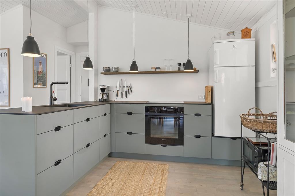 Willkommen in deinem Ferienhaus: Dieses helle und charmante Ferienhaus besticht durch das große Fenster im Wohnzimmer, das für viel Tageslicht sorgt. Das Haus verfügt über einen offenen Küchen- und Wohnbereich mit einer neuen Kvik-Küche aus dem Jahr 2024, ausgestattet mit Einbauofen, Kochfeld, Mikrowelle, Geschirrspüler und Kühl-/Gefrierschrank.
