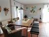 Zum Essen sitzen Sie bequem an einem großen Esstisch. Geschirr ist großzügig 16x vorhanden. Der gesamte Wohn- und Essbereich ist individuell mit Massivholzmöbeln ausgestattet. Im Erdgeschoss befindet sich auch ein Hauswirtschaftsraum für die kleine Wäsche mit Waschmaschine und Trockner sowie Wäscheständer, Bügelbrett und -eisen. Vom hellen Wohnbereich aus gehen zwei große Flügeltüren auf die Terrasse, die sich auf zwei Seiten des Hauses erstreckt. Diese ist großzügig möbliert mit Holzmöbeln, einem Strandkorb, gr. Marktschirm und gemauerten Grill.