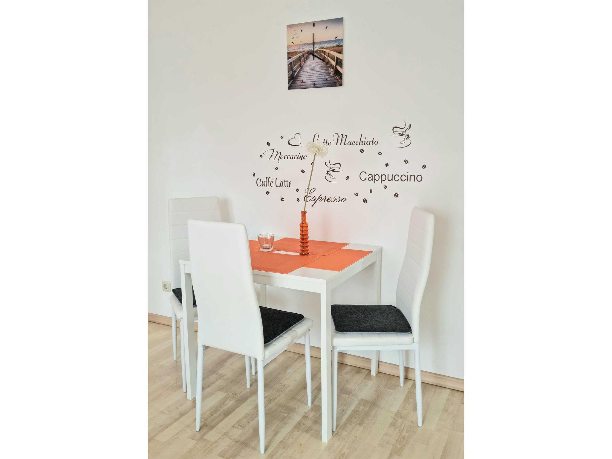 Die moderne 32 qm große Ferienwohnung verfügt über einen gemütlichen Wohn-/Essbereich mit einem Schlafsofa, TV (48 Zoll), DVD-Player, Couchtisch, Esstisch und Stühle. Die moderne Küchenzeile ist mit einen 2 Platten Herd, Mikrowelle, Wasserkocher, Toaster, Kaffeemaschine und Kühlschrank mit Gefrierfach ausgestattet.