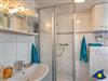 Das Badezimmer mit Fenster hält neben Handwaschbecken und WC eine Dusche bereit.