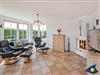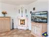 Das Wohnzimmer, mit einem Kamin für kuschelige Stunden, ist mit einer Sitzgruppe und integrierter Schlafcouch ausgestattet.