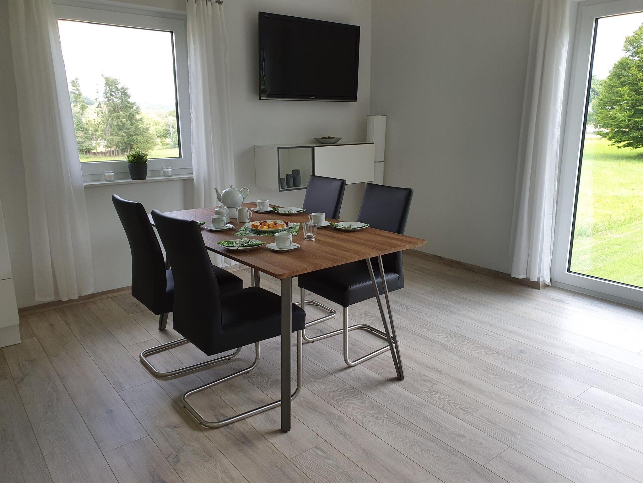 • einem geräumigen Wohn-/Esszimmer mit Platz für 4 Personen, eingerichtet mit einem großen Fernseher (SatFarb TV), Panoramafenster Südseite mit herrlichem Ausblick