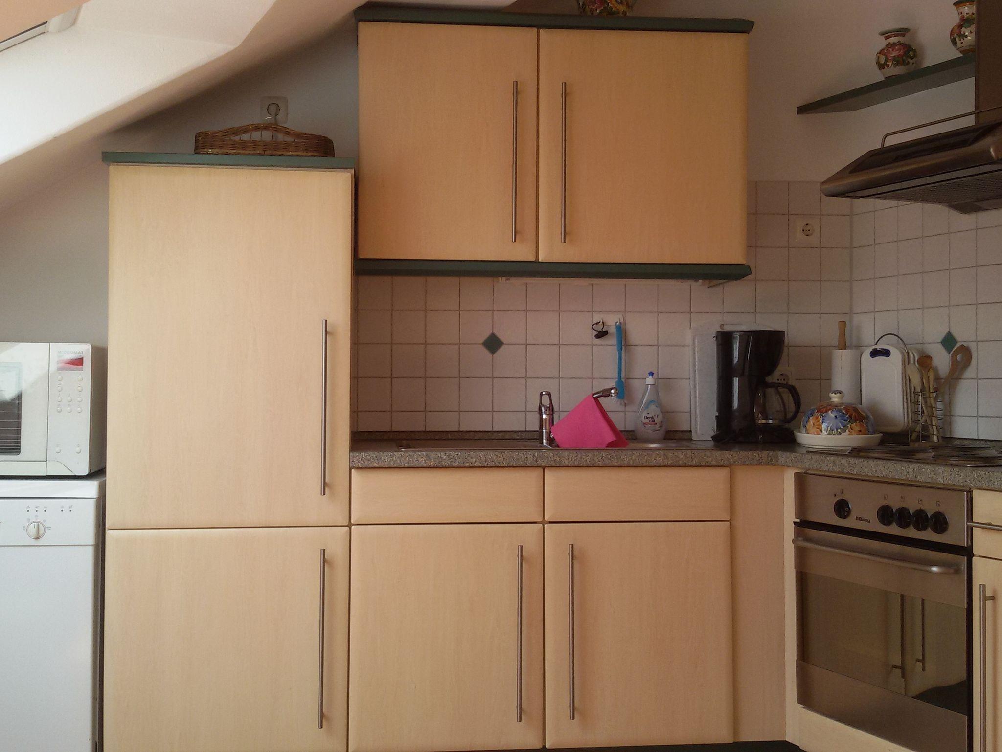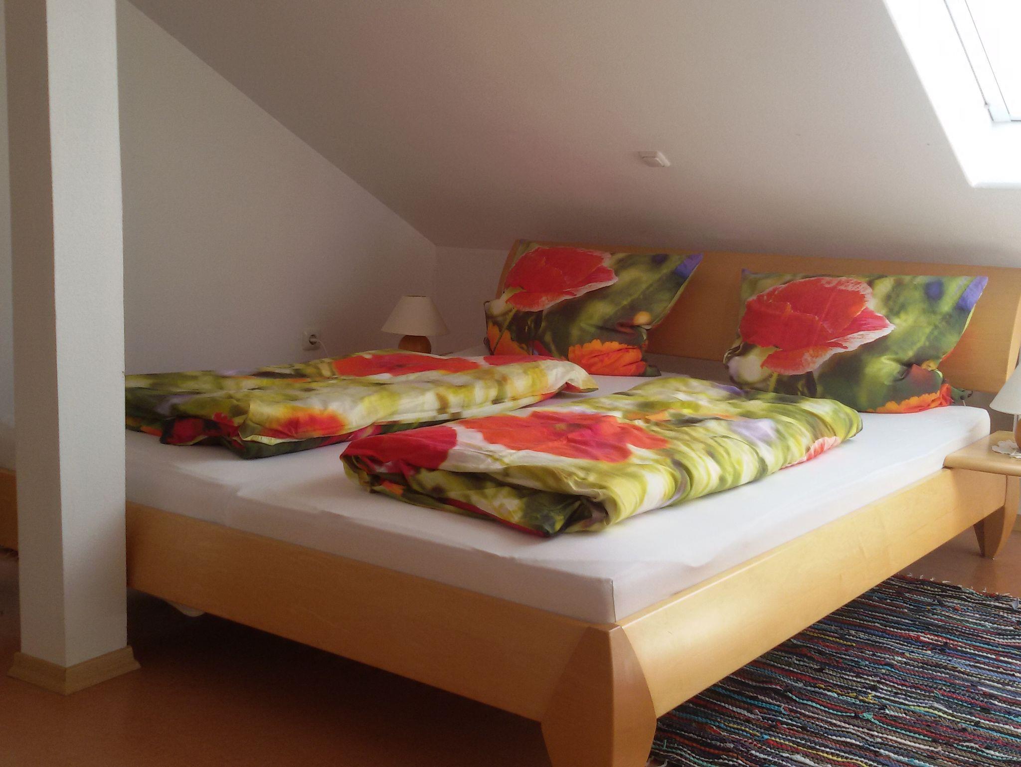 Unsere Ferienwohnung Klatschmohn im DG (ca. 59 qm) mit 2 Schlafräumen, 1 Wohnzimmer mit gut ausgestatteter Küchenzeile und Südbalkon, DU/WC, ist für bis zu 4 Personen geeignet.