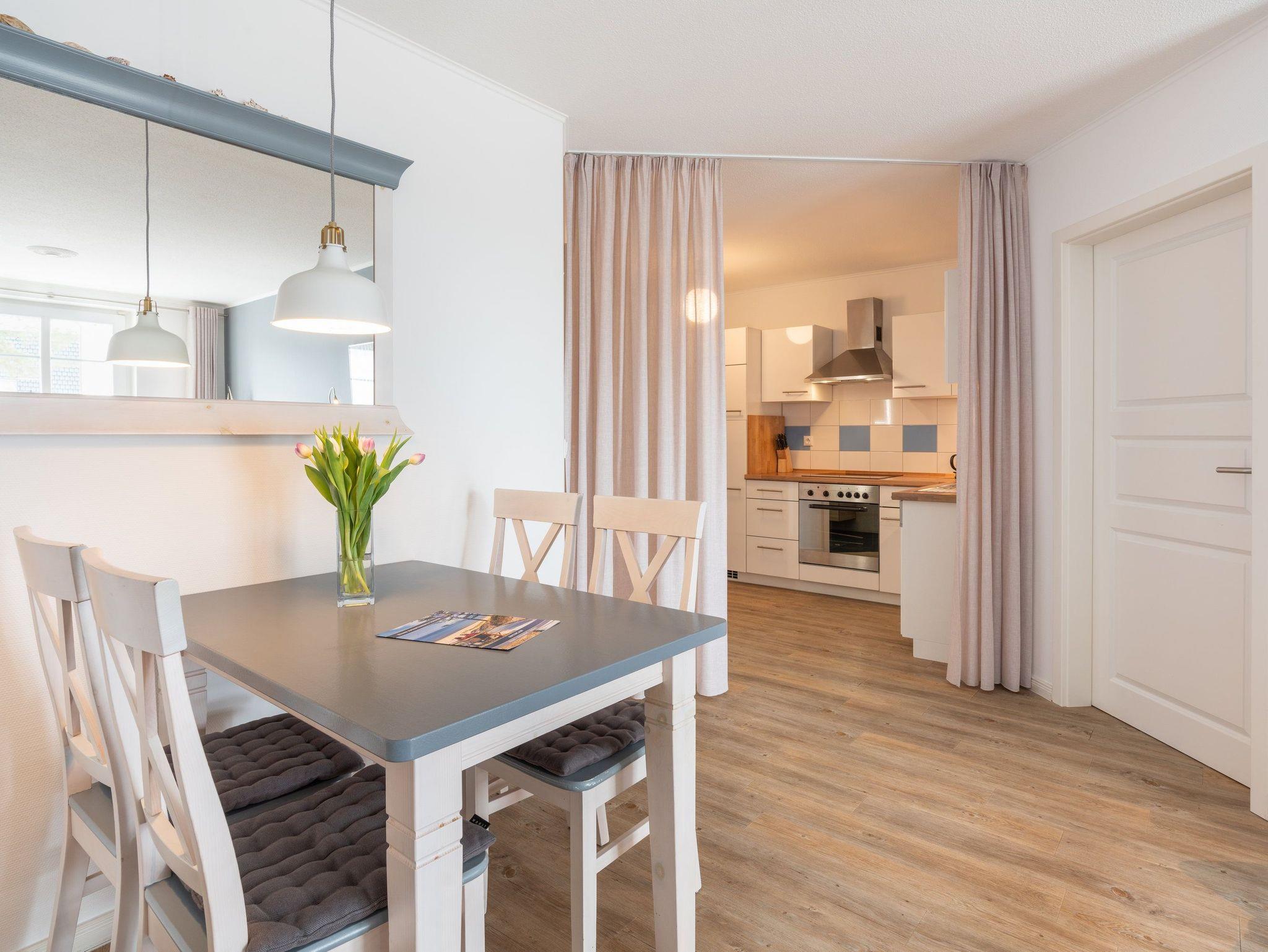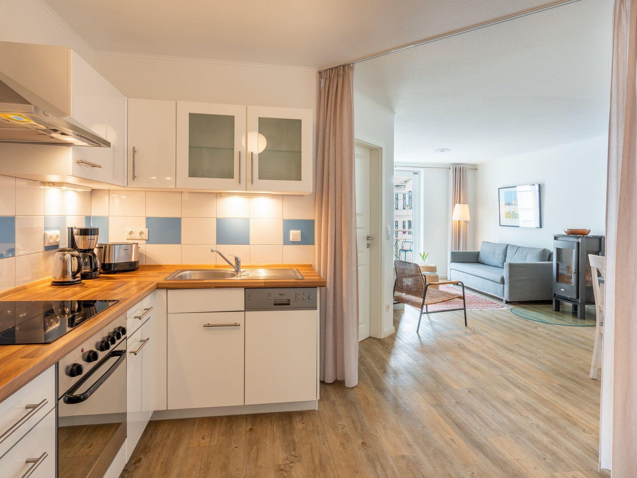 Ein Lift hebt Sie in den 1. Stock der Weißen Düne - direkt zu Ihrem exklusiven Urlaubsquartier. Das 2-Zimmer-Appartement Nr. 6 mit einer Größe von 47 Quadratmetern, welches durch seine Individualität und Behaglichkeit besticht, garantiert einen erholsamem Urlaub zu jeder Jahreszeit, wobei keine Wünsche offen bleiben. Die gemütliche Couch im Wohnbereich, die sich im Handumdrehen in eine Schlafstätte für einen dritten Gast verwandeln lässt, bietet bequemen Sitzkomfort.