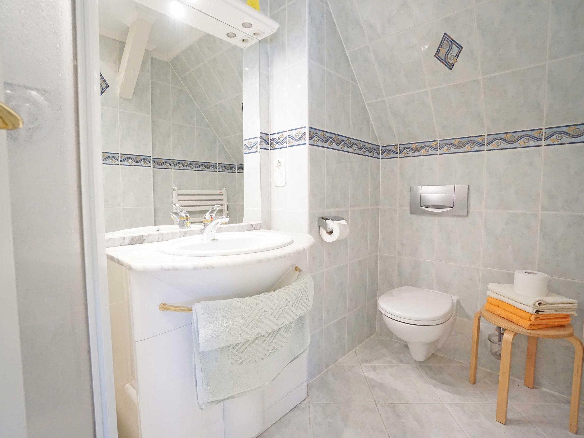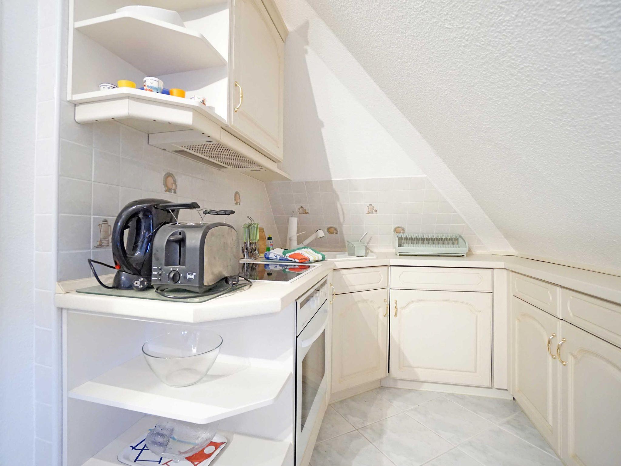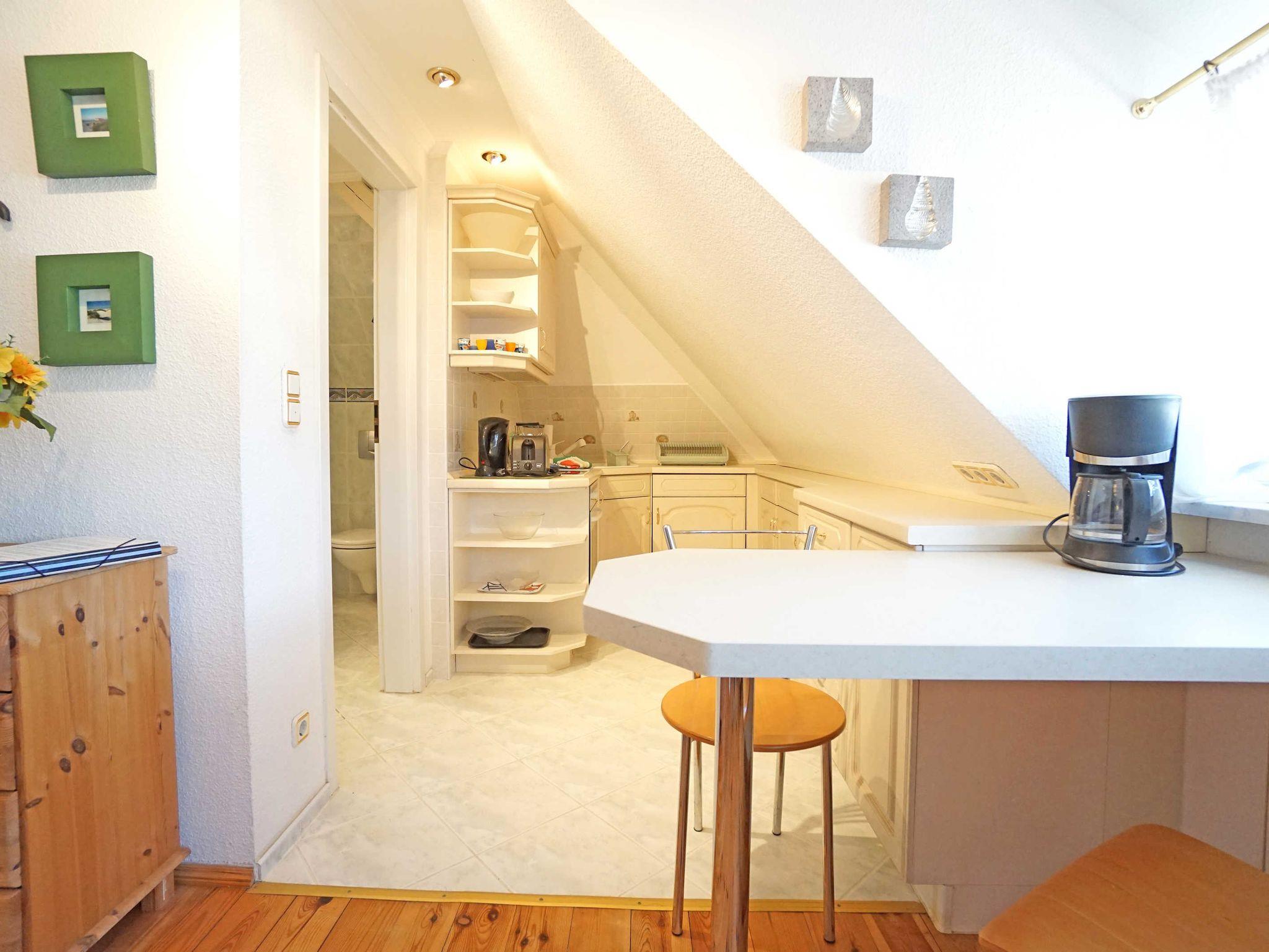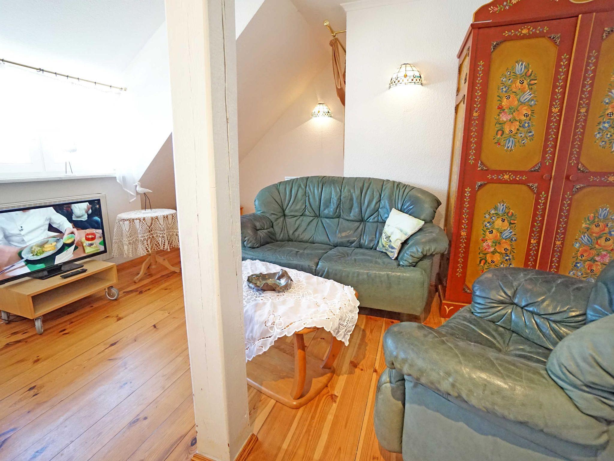 Die gemütlich eingerichtete, helle 2-Zimmer-Ferienwohnung (36m²) befindet sich im zweiten Obergeschoss des Hauses. Die Nichtraucherwohnung verfügt über ein Wohnzimmer mit offener Küche (Herd, Ofen, Kühlschrank mit Gefrierfach), einem kleinen Esstisch, Flachbildfernseher und einer gemütlichen Sitzecke. Das Schlafzimmer ist mit einem Doppelbett (160x200cm) und einem Einzelbett ausgestattet. Ein Duschbad ist vorhanden.