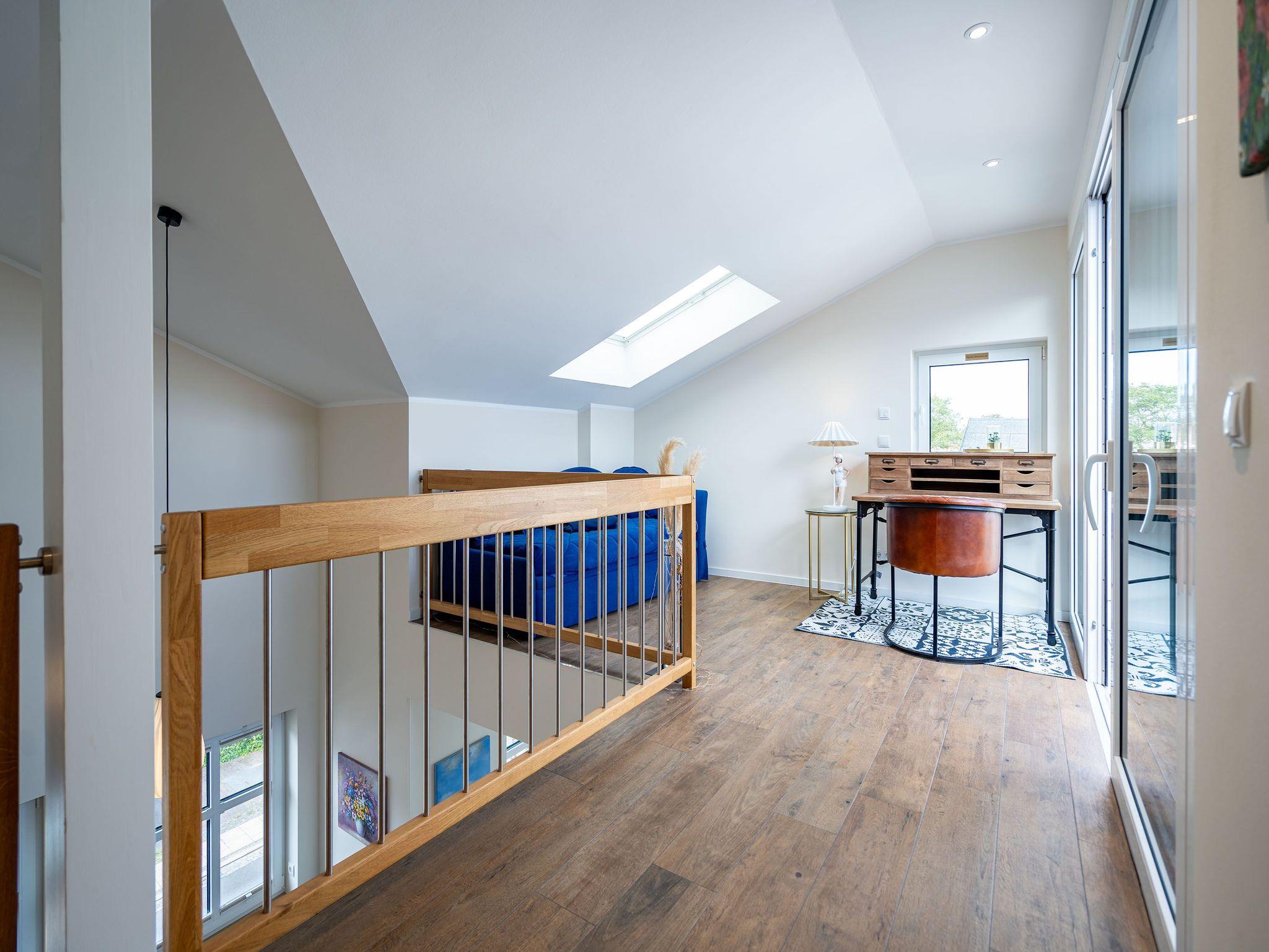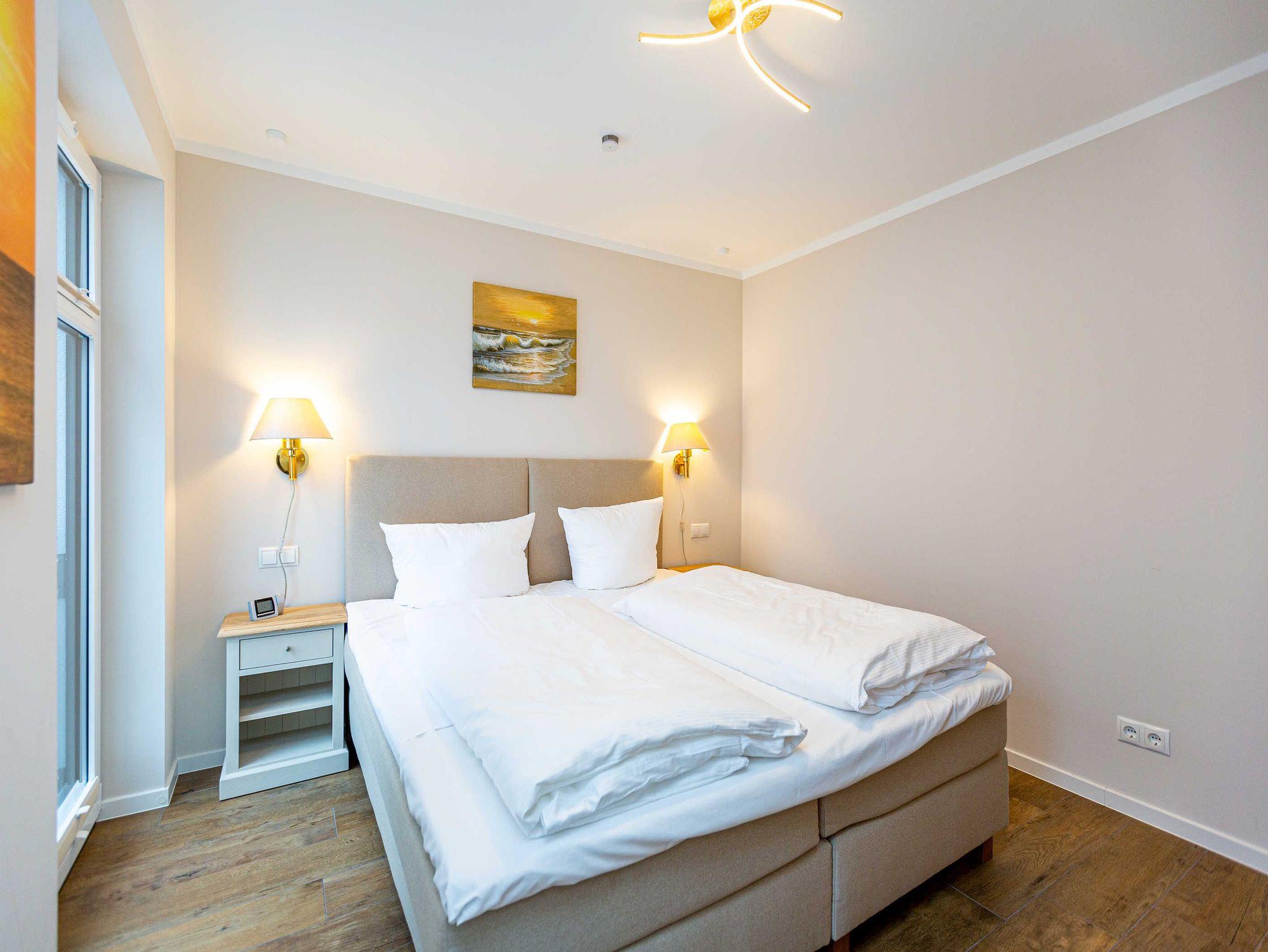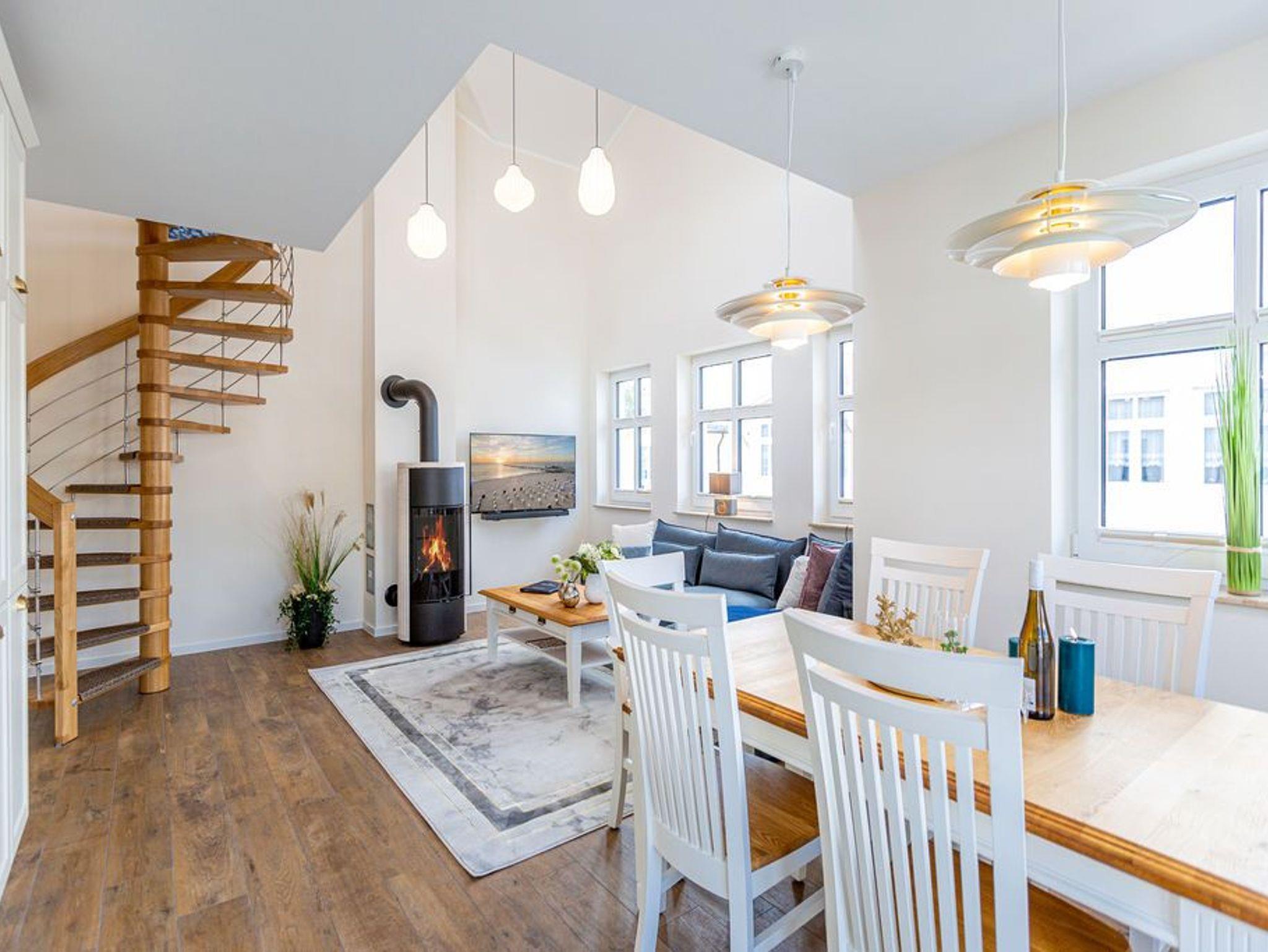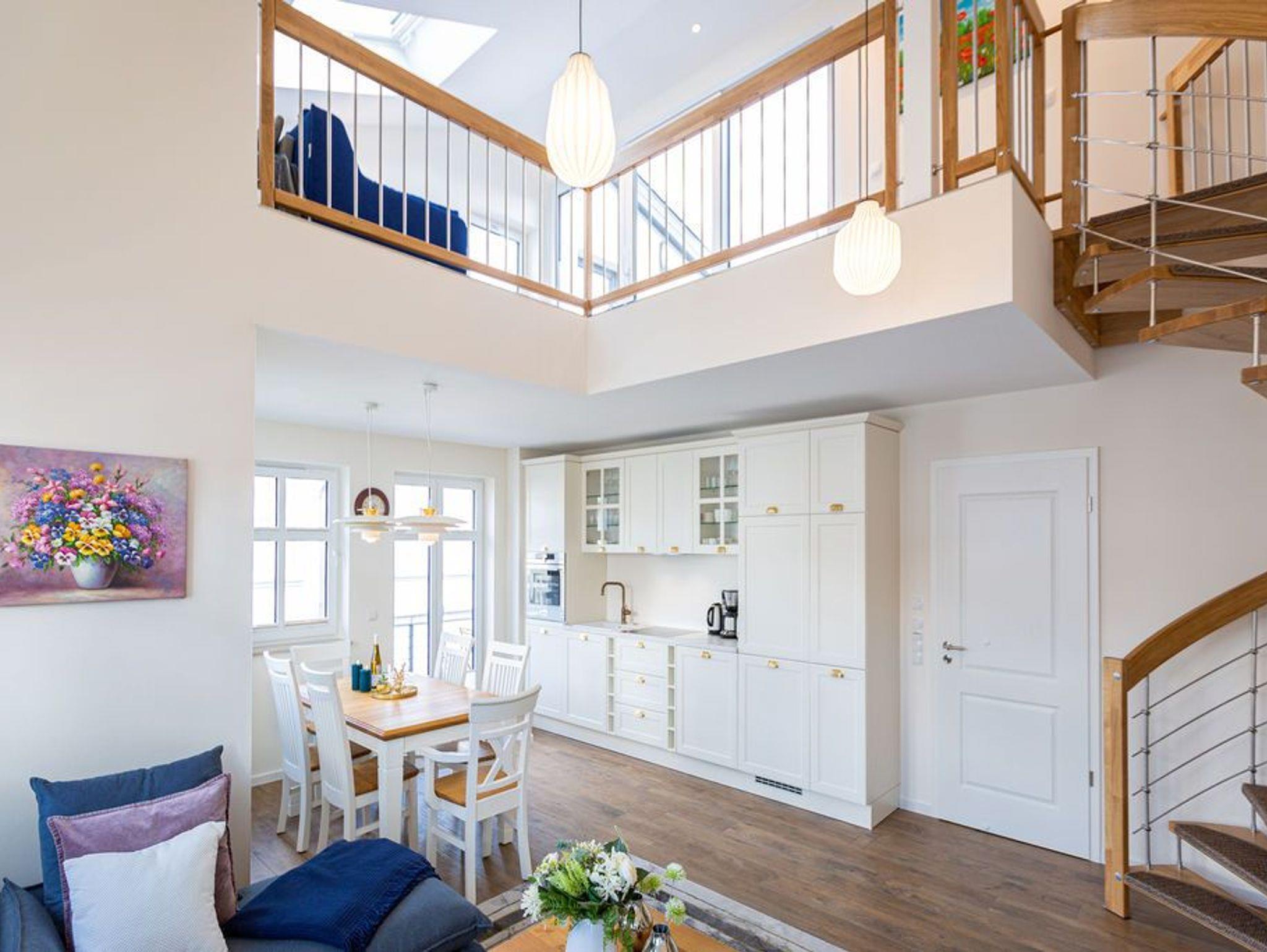 Ein außergewöhnliches Appartement erwartet Sie im ersten Obergeschoss in der Nummer 9a. Offen, großzügig und mit einer lichten Galerie bietet es auf 96 Quadratmetern vier Personen und einem Kleinkind (im Kinderreisebett) viel Platz und ein wunderschönes Ambiente zum Ausspannen. Das Highlight dieses Urlaubsdomizils ist die offene Galerie mit Zugang zur 12 Quadratmeter großen Dachterrasse. Unter freiem Himmel essen oder es sich dort auf den Gartenmöbeln gemütlich machen ? Was will man mehr im Urlaub? Das Appartementinterieur besticht durch elegante Möbel. Skandinavischer Landhausstil trifft auf liebevoll ausgesuchte Kunst und Accessoires. Das schöne, große Wohnzimmer verfügt über eine bequeme Sitzlandschaft, einen Kaminofen und einen Flat-TV. Ein kleiner West-Balkon (5 Quadratmeter) lädt zum Durchatmen ein. Augen zu und genießen. Das Wohnzimmer geht in eine offene Wohnküche mit schönem Esstisch über. In der Küchenzeile finden Sie alles Notwendige. Moderne und hochwertige Geräte erleichtern die Zubereitung der Mahlzeiten und das anschließende Saubermachen. Geschirrspüler, Herd, Kühlschrank mit Gefrierfach, Kaffeemaschine, Wasserkocher, Töpfe und Geschirr ? alles ist da. Die beiden Schlafzimmer sind mit komfortablen Boxspringdoppelbetten (1,80 m x 2,00 m), einem Kleiderschrank und einem Flat-TV ausgestattet. Eines der Zimmer hat ebenfalls Zugang zu dem kleinen Wohnzimmer-Balkon. Bei Anreise sind Ihre Betten bereits bezogen. Das WLAN ist kostenfrei nutzbar. Zwei Tageslicht-Badezimmer sorgen dafür, dass es morgens nicht zum Duschstau kommt. Handtücher liegen bereit. Freuen Sie sich auf die kleine Finnische Sauna im Masterbad. Die kleine Wellnessoase wird Ihnen an kühlen Tagen wohlige Wärme schenken. In der Tiefgarage sind zwei hintereinander befindliche Stellplätze für Sie reserviert. Es gibt einen wohnungseigenen Fahrradkeller.
