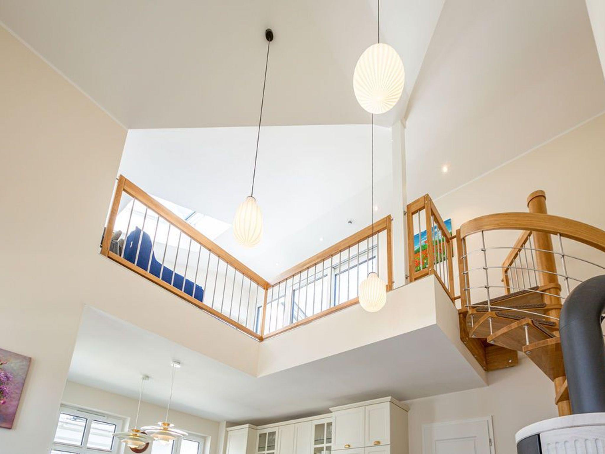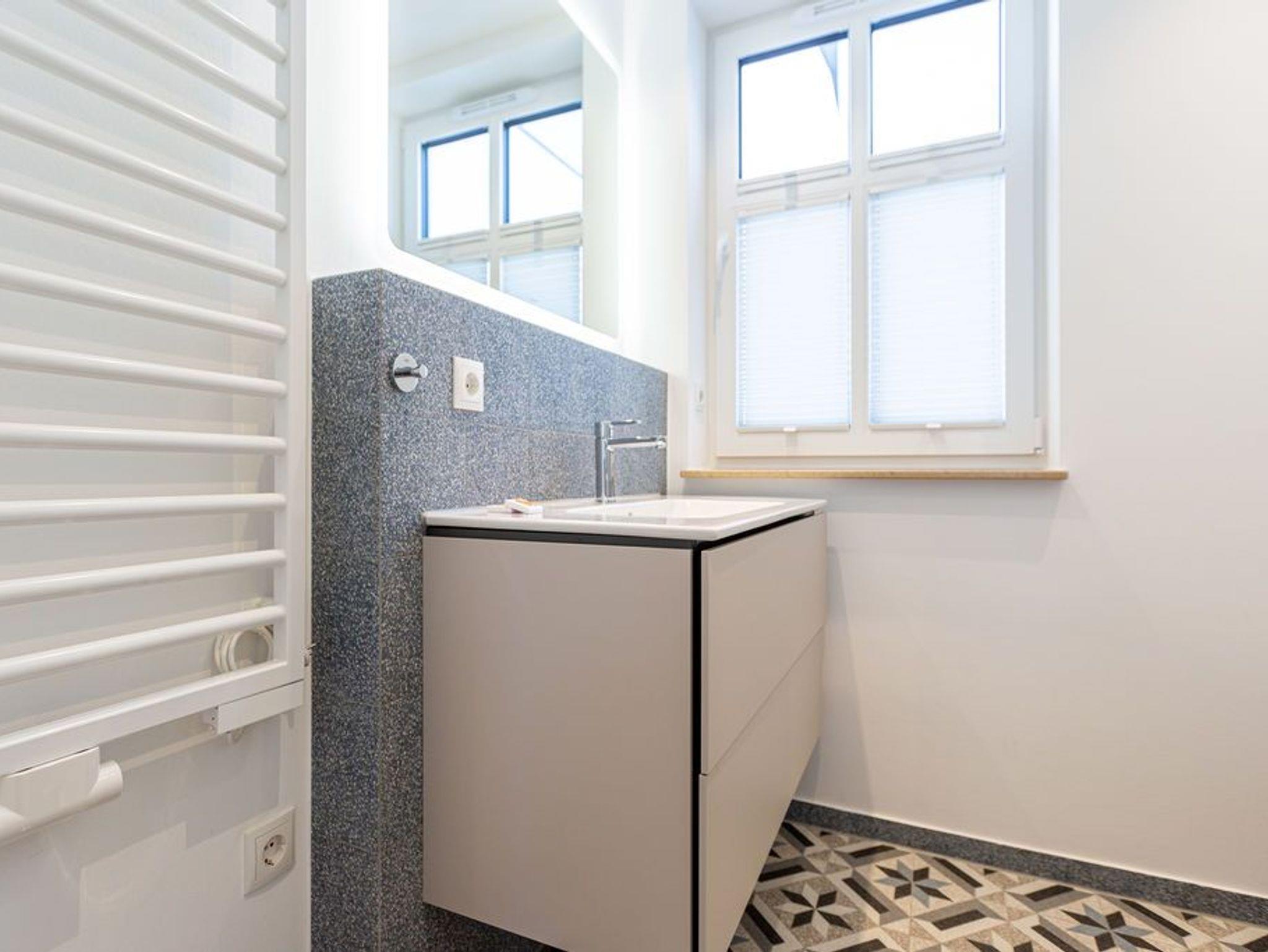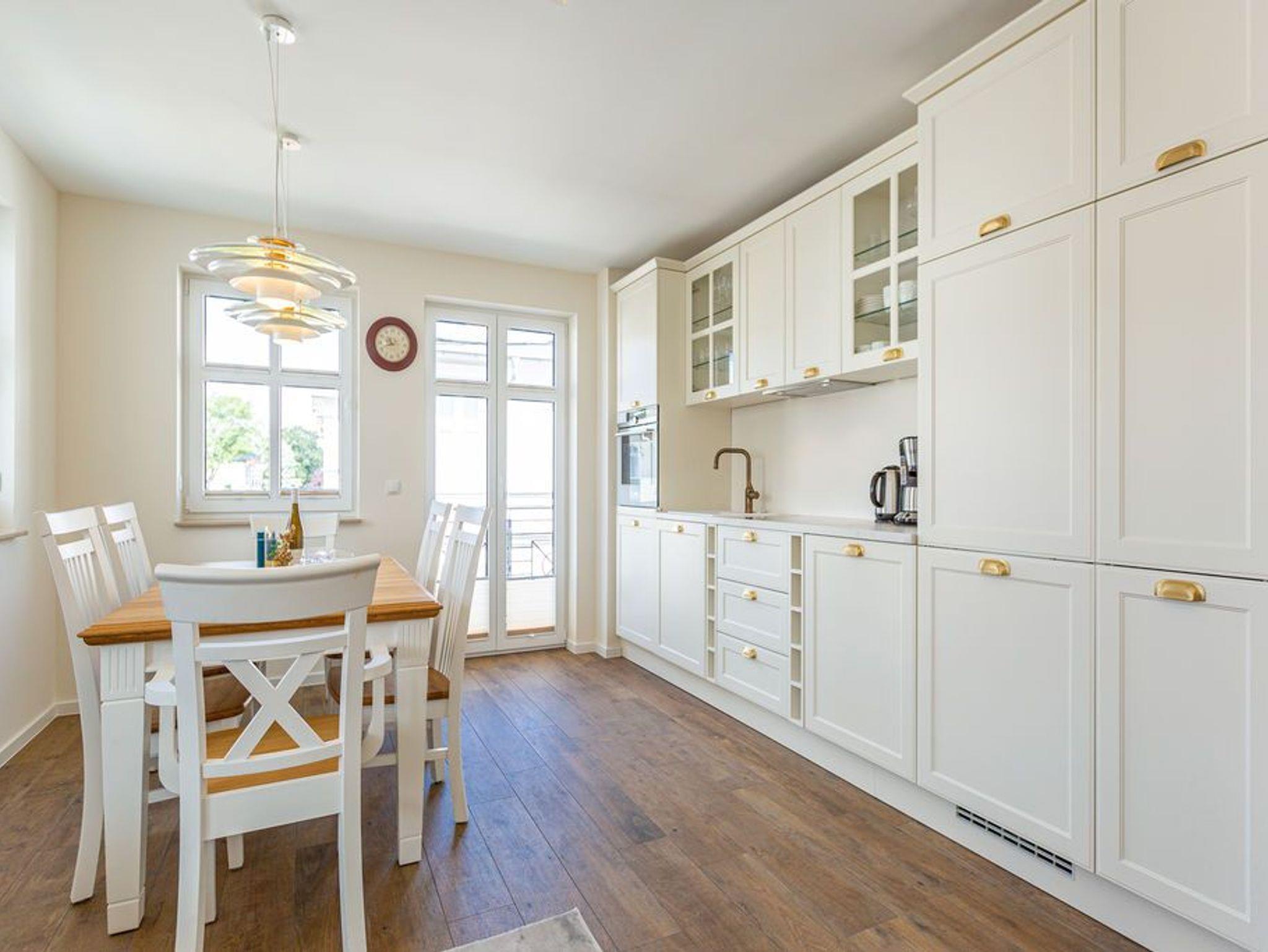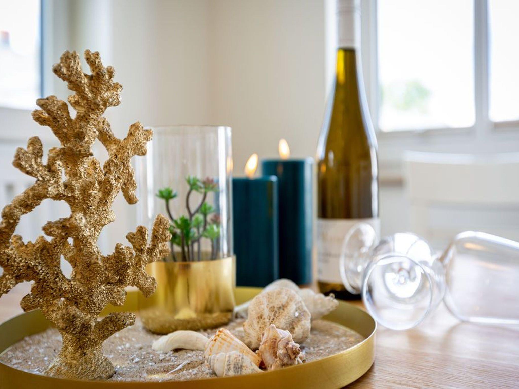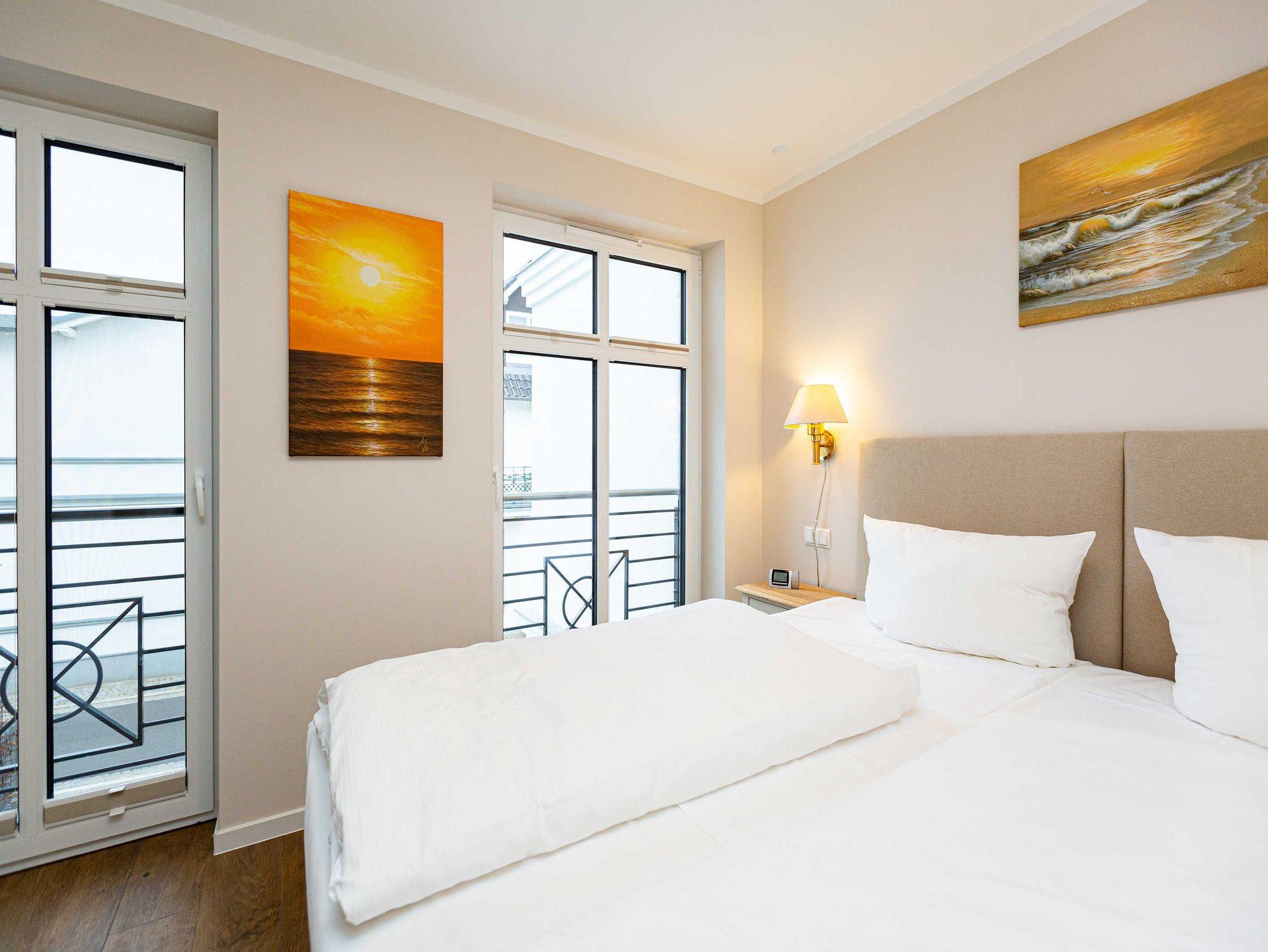 Ein außergewöhnliches Appartement erwartet Sie im ersten Obergeschoss in der Nummer 9a. Offen, großzügig und mit einer lichten Galerie bietet es auf 96 Quadratmetern vier Personen und einem Kleinkind (im Kinderreisebett) viel Platz und ein wunderschönes Ambiente zum Ausspannen. Das Highlight dieses Urlaubsdomizils ist die offene Galerie mit Zugang zur 12 Quadratmeter großen Dachterrasse. Unter freiem Himmel essen oder es sich dort auf den Gartenmöbeln gemütlich machen ? Was will man mehr im Urlaub? Das Appartementinterieur besticht durch elegante Möbel. Skandinavischer Landhausstil trifft auf liebevoll ausgesuchte Kunst und Accessoires. Das schöne, große Wohnzimmer verfügt über eine bequeme Sitzlandschaft, einen Kaminofen und einen Flat-TV. Ein kleiner West-Balkon (5 Quadratmeter) lädt zum Durchatmen ein. Augen zu und genießen. Das Wohnzimmer geht in eine offene Wohnküche mit schönem Esstisch über. In der Küchenzeile finden Sie alles Notwendige. Moderne und hochwertige Geräte erleichtern die Zubereitung der Mahlzeiten und das anschließende Saubermachen. Geschirrspüler, Herd, Kühlschrank mit Gefrierfach, Kaffeemaschine, Wasserkocher, Töpfe und Geschirr ? alles ist da. Die beiden Schlafzimmer sind mit komfortablen Boxspringdoppelbetten (1,80 m x 2,00 m), einem Kleiderschrank und einem Flat-TV ausgestattet. Eines der Zimmer hat ebenfalls Zugang zu dem kleinen Wohnzimmer-Balkon. Bei Anreise sind Ihre Betten bereits bezogen. Das WLAN ist kostenfrei nutzbar. Zwei Tageslicht-Badezimmer sorgen dafür, dass es morgens nicht zum Duschstau kommt. Handtücher liegen bereit. Freuen Sie sich auf die kleine Finnische Sauna im Masterbad. Die kleine Wellnessoase wird Ihnen an kühlen Tagen wohlige Wärme schenken. In der Tiefgarage sind zwei hintereinander befindliche Stellplätze für Sie reserviert. Es gibt einen wohnungseigenen Fahrradkeller.
