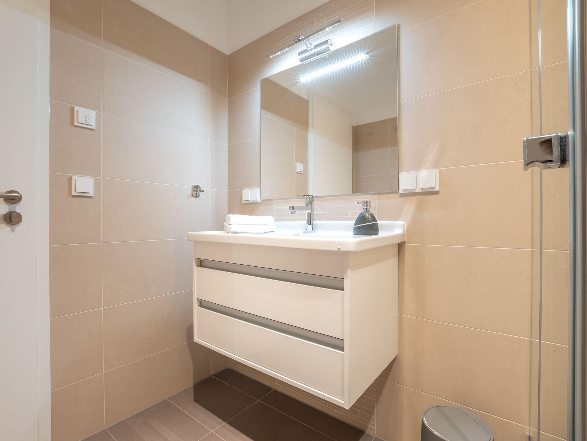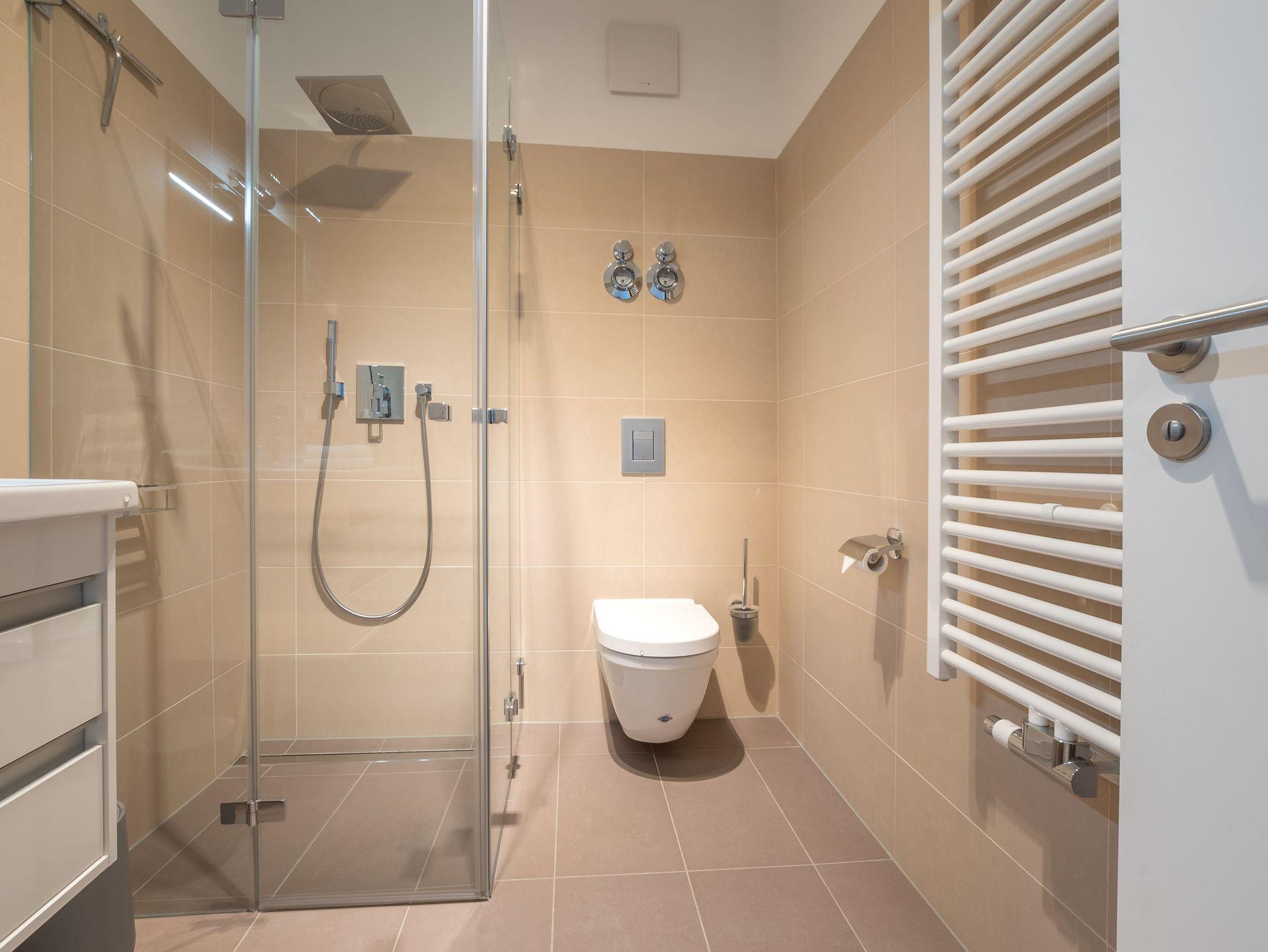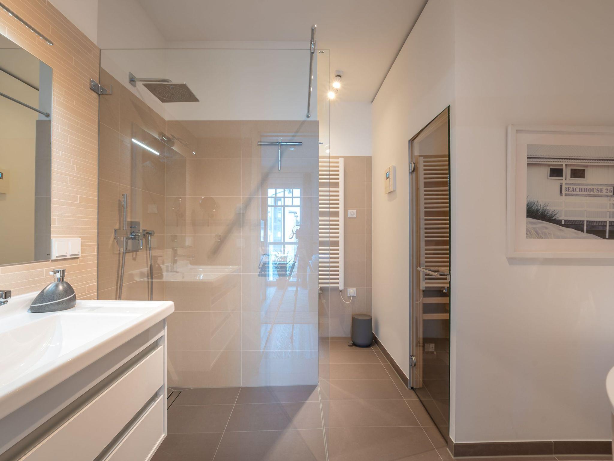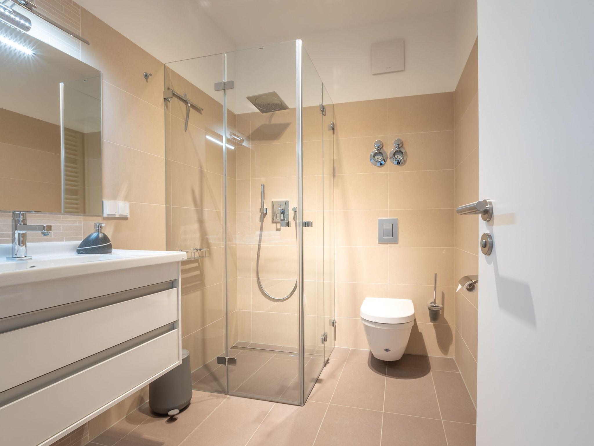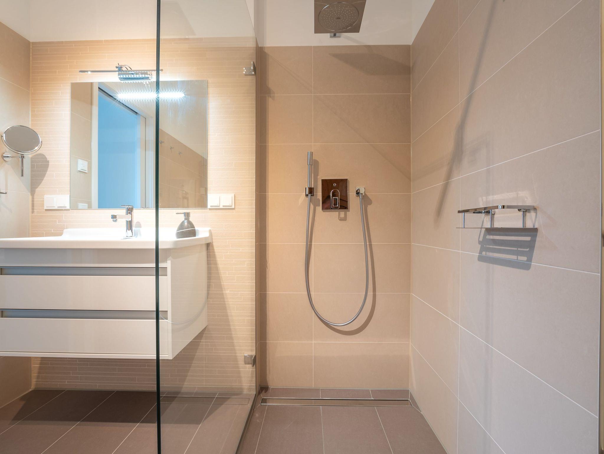 • Zwei moderne Badezimmer, eines mit Dusche und WC, das andere mit einer großzügigen Eckbadewanne, WC und einer entspannenden Sauna.