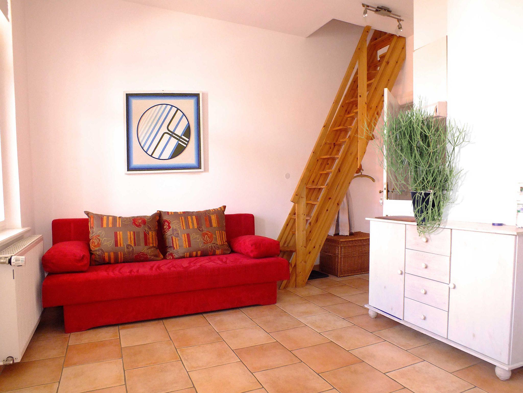 Das moderne, kleine Appartement ist 25 qm groß, liegt im 1. Obergeschoß und verfügt über einen TV, einer Veranda mit einem Einzelbett 0,80 m x 1,90 m, einem kombinierten Wohn- und Schlafraum mit Esstisch + Stühlen, einem Kleiderschrank, einer ausklappbaren, komfortablen Schlafcouch mit einer Liegefläche von 1,60 x 2,00 m.
