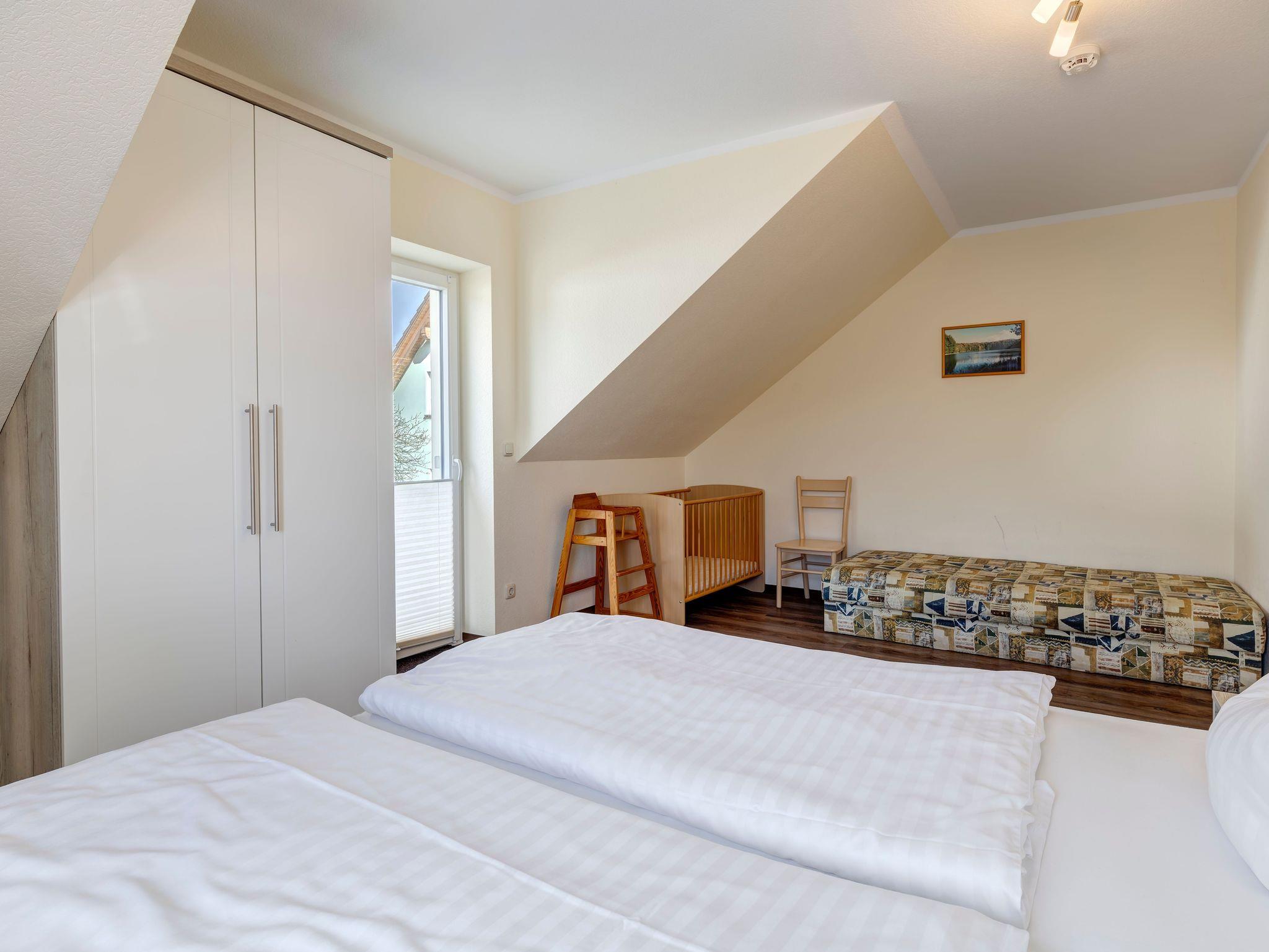Die komfortable Nichtraucher-Ferienwohnung mit Balkon ist ca. 50m² und befindet sich in der 1. Etage des Hauses. Das gemütliche Wohnzimmer ist mit einer Couch, einem Fernseher und einem Radio mit CD-Player ausgestattet. Die Kochzeile, die sich ebenfalls im Wohnzimmer befindet ist mit allen notwendigen Utensilien, sowie Wasserkocher, Toaster, Eierkocher, Mikrowelle und Kaffeemaschine ausgestattet. Das Schlafzimmer verfügt über ein Doppelbett. Das Badezimmer ist mit einer Dusche, einem Kosmetikspiegel und mit einem Fön ausgestattet. Über eine Leiter vom Flur sind die beiden Schlafplätze im kuscheligen, verschließbaren Spitzboden (mit Dachfenster) der Ferienwohnung zu erreichen. Diese Schlafplätze können auf Anfrage gebucht werden.