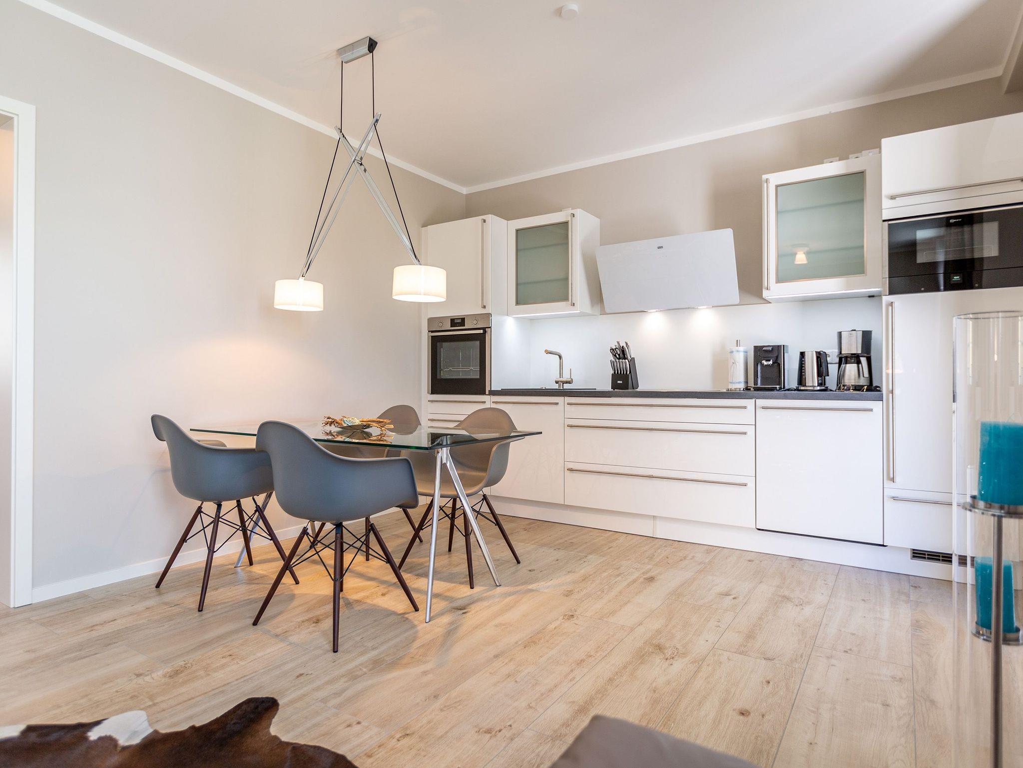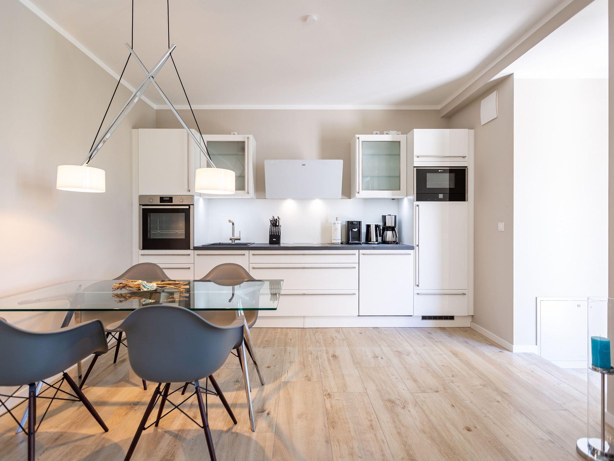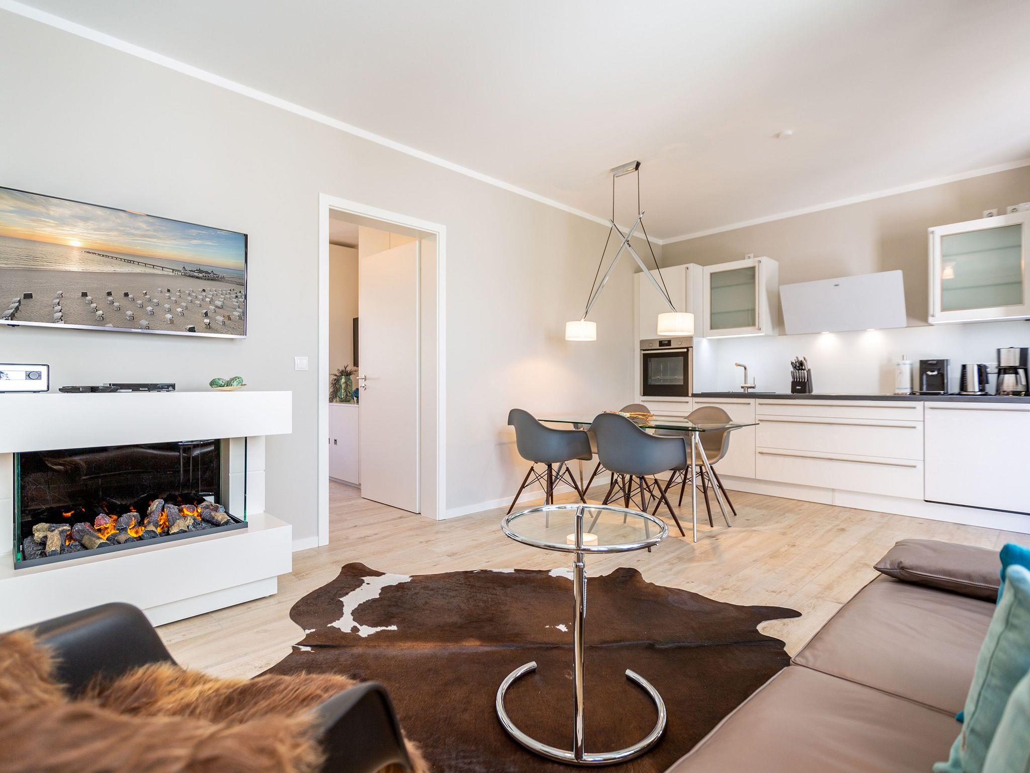 Wunderbar hell ist es in diesem 53 Quadratmeter großen Urlaubsparadies. Denn die Fenster lassen viel Licht in die Zwei-Zimmer-Wohnung hinein. Das verleiht ihr eine luftig leichte Atmosphäre. Für zwei Personen plus Kleinkind (im Kinderreisebett) und Vierbeiner ist dieses Domizil im Erdgeschoss das ideale Wohlfühlzuhause für eine entspannte Ostseeauszeit. Das Interieur wurde von einem Innenarchitekten konzipiert. Ausgewählte Designmöbel wie das Cassina-Sofa von Le Corbusier oder der Schalen-Schaukelstuhl sorgen im Wohnzimmer für stilvolle Eleganz. Ein großer Elektrokamin per Fernbedienung versprüht ein ein gemütliches Ambiente. Kalte Füße gehören Dank einer Fußbodenheizung der Vergangenheit an. Es gibt einen Flat-TV ( 43 Zoll). Das WLAN kann kostenfrei genutzt werden. Zum Wohnzimmer gehört außerdem eine offene Küche. Sie ist topmodern und mit allem ausgestattet, was Sie brauchen: Mikrowelle, Induktionsherd, Geschirrspüler, Senseo Kaffeemaschine… Töpfe, Pfannen und Geschirr finden Sie in den Schränken. Vom Wohnzimmer aus können Sie auf eine sonnenüberflutete Terrasse hinaustreten. Hier können Sie es sich beim Sonnenbaden auf der Liege oder beim Open Air-Frühstück im Strandkorb so richtig gut gehen lassen. Auch das Schlafzimmer besitzt viel Gemütlichkeit. Ein bequemes Boxspringdoppelbett schenkt Ihnen erholsame Träume. In den Schränken gibt es reichlich Ablageflächen. Das Bad verfügt über Dusche und WC. Natürlich ist ein Föhn vorhanden. Handtücher liegen bereit und das Bett ist bei Anreise bezogen. Im Keller befindet sich ein Fahrradraum und für Ihr Auto ist in der Tiefgarage ein Stellplatz reserviert.