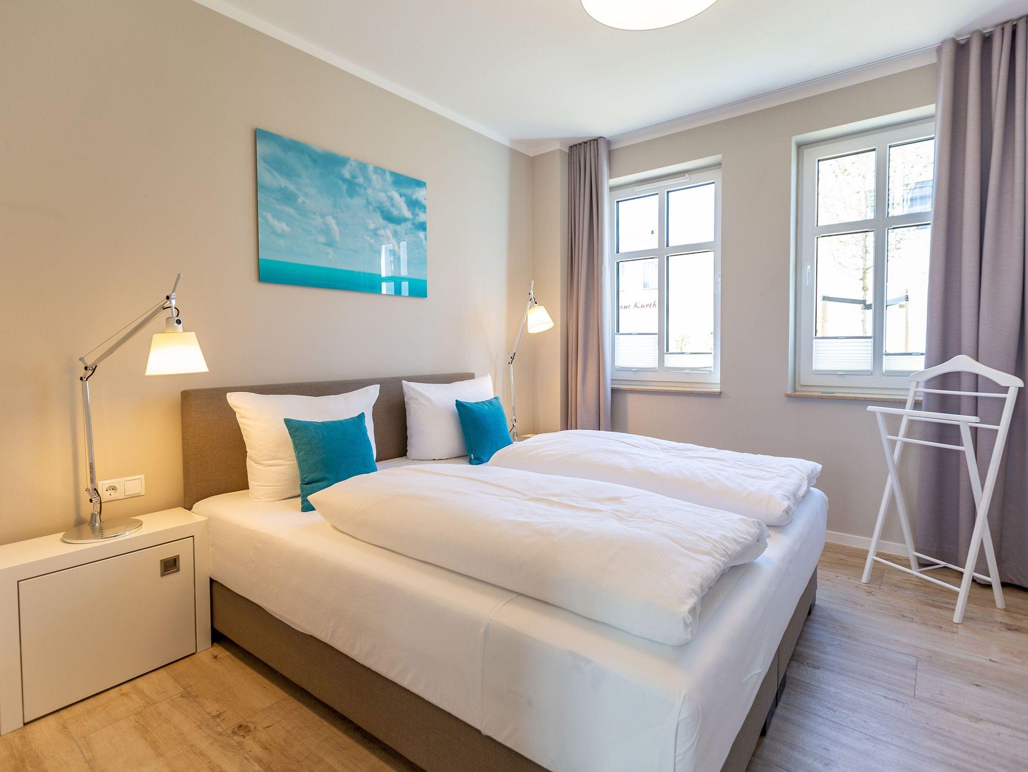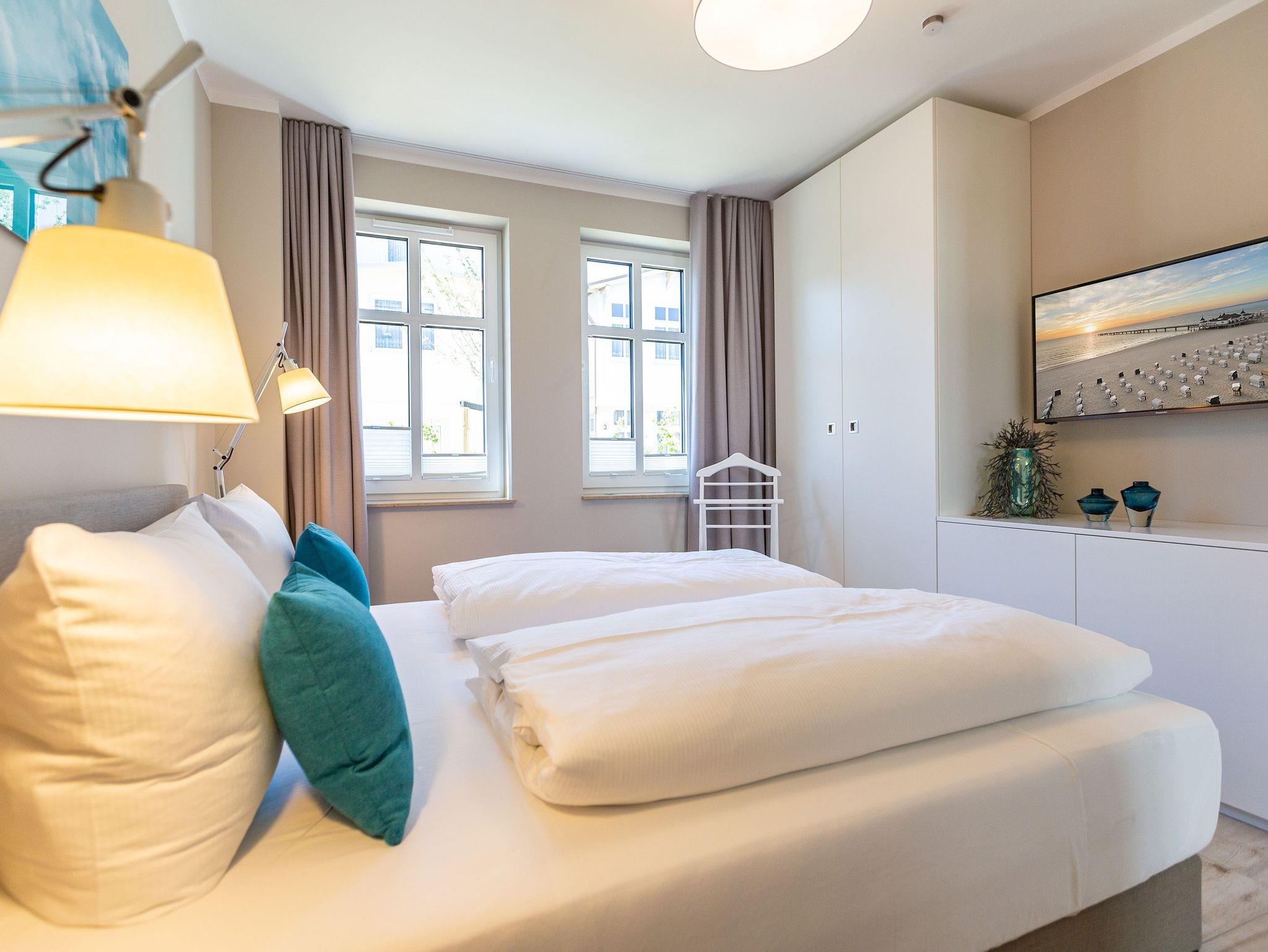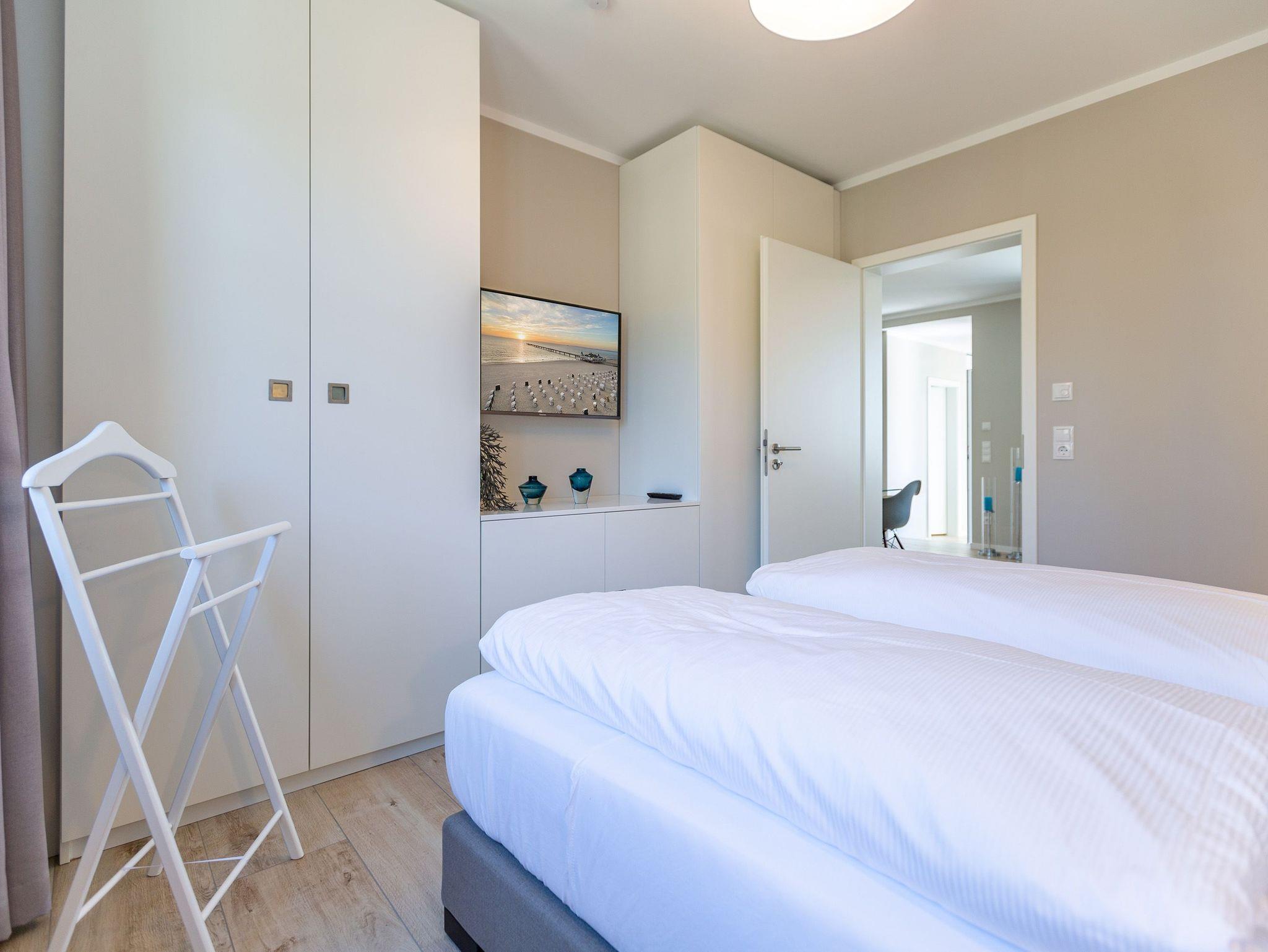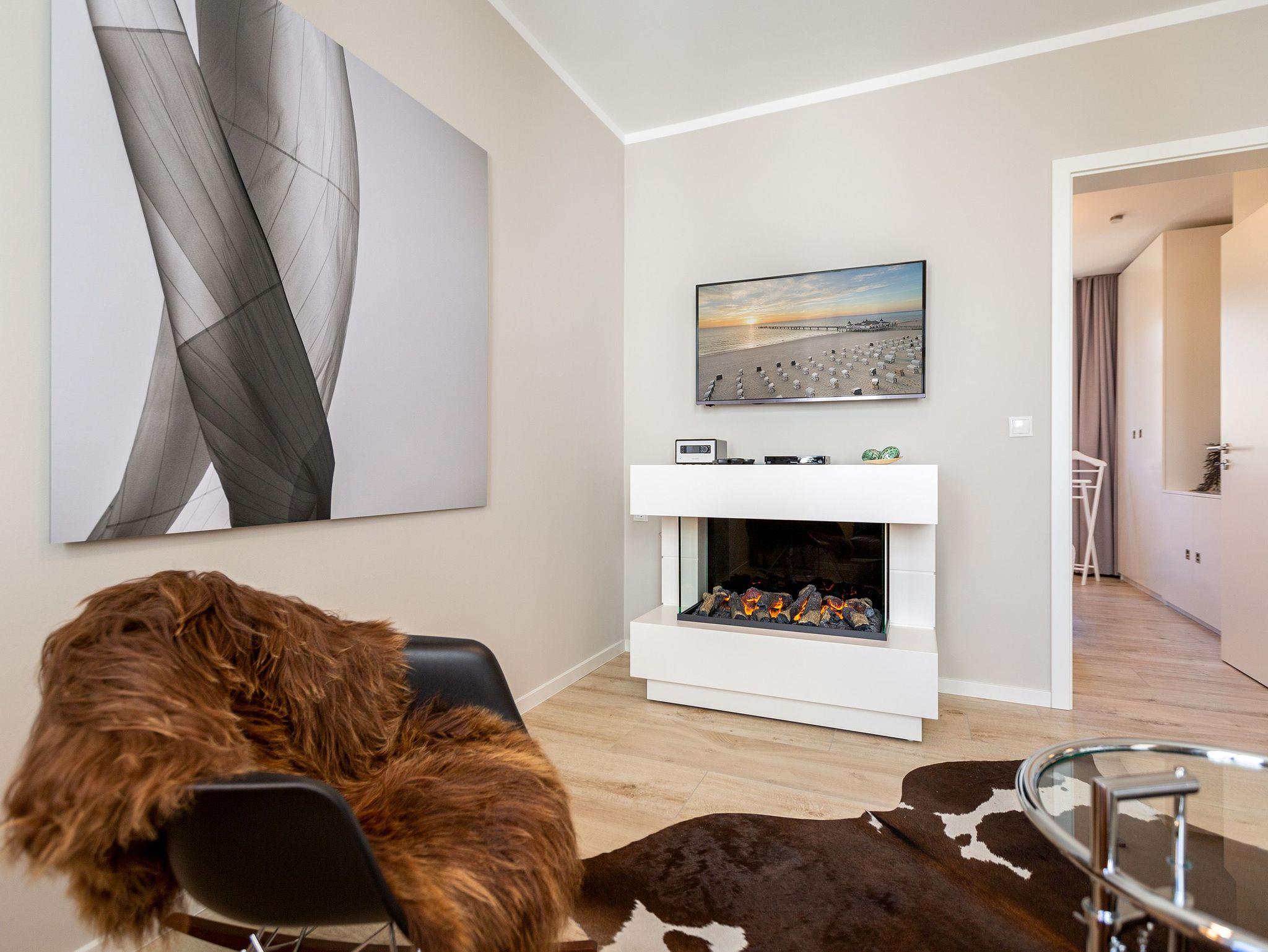 Wunderbar hell ist es in diesem 53 Quadratmeter großen Urlaubsparadies. Denn die Fenster lassen viel Licht in die Zwei-Zimmer-Wohnung hinein. Das verleiht ihr eine luftig leichte Atmosphäre. Für zwei Personen plus Kleinkind (im Kinderreisebett) und Vierbeiner ist dieses Domizil im Erdgeschoss das ideale Wohlfühlzuhause für eine entspannte Ostseeauszeit. Das Interieur wurde von einem Innenarchitekten konzipiert. Ausgewählte Designmöbel wie das Cassina-Sofa von Le Corbusier oder der Schalen-Schaukelstuhl sorgen im Wohnzimmer für stilvolle Eleganz. Ein großer Elektrokamin per Fernbedienung versprüht ein ein gemütliches Ambiente. Kalte Füße gehören Dank einer Fußbodenheizung der Vergangenheit an. Es gibt einen Flat-TV ( 43 Zoll). Das WLAN kann kostenfrei genutzt werden. Zum Wohnzimmer gehört außerdem eine offene Küche. Sie ist topmodern und mit allem ausgestattet, was Sie brauchen: Mikrowelle, Induktionsherd, Geschirrspüler, Senseo Kaffeemaschine… Töpfe, Pfannen und Geschirr finden Sie in den Schränken. Vom Wohnzimmer aus können Sie auf eine sonnenüberflutete Terrasse hinaustreten. Hier können Sie es sich beim Sonnenbaden auf der Liege oder beim Open Air-Frühstück im Strandkorb so richtig gut gehen lassen. Auch das Schlafzimmer besitzt viel Gemütlichkeit. Ein bequemes Boxspringdoppelbett schenkt Ihnen erholsame Träume. In den Schränken gibt es reichlich Ablageflächen. Das Bad verfügt über Dusche und WC. Natürlich ist ein Föhn vorhanden. Handtücher liegen bereit und das Bett ist bei Anreise bezogen. Im Keller befindet sich ein Fahrradraum und für Ihr Auto ist in der Tiefgarage ein Stellplatz reserviert.