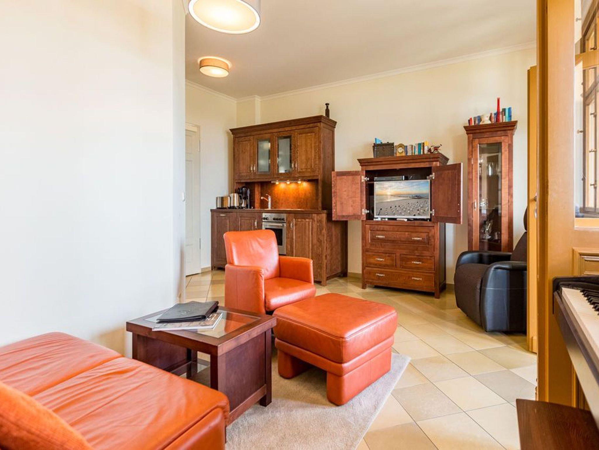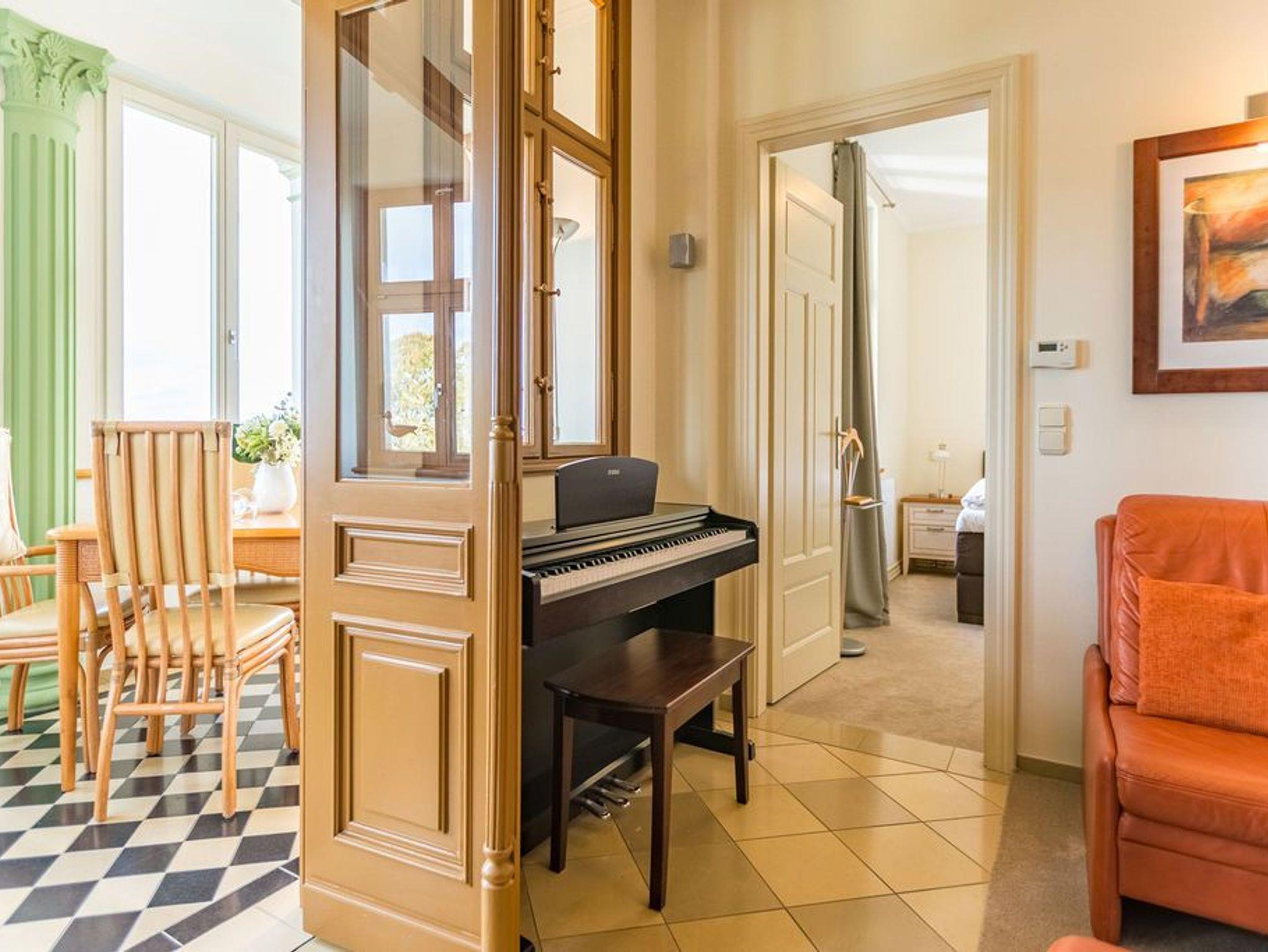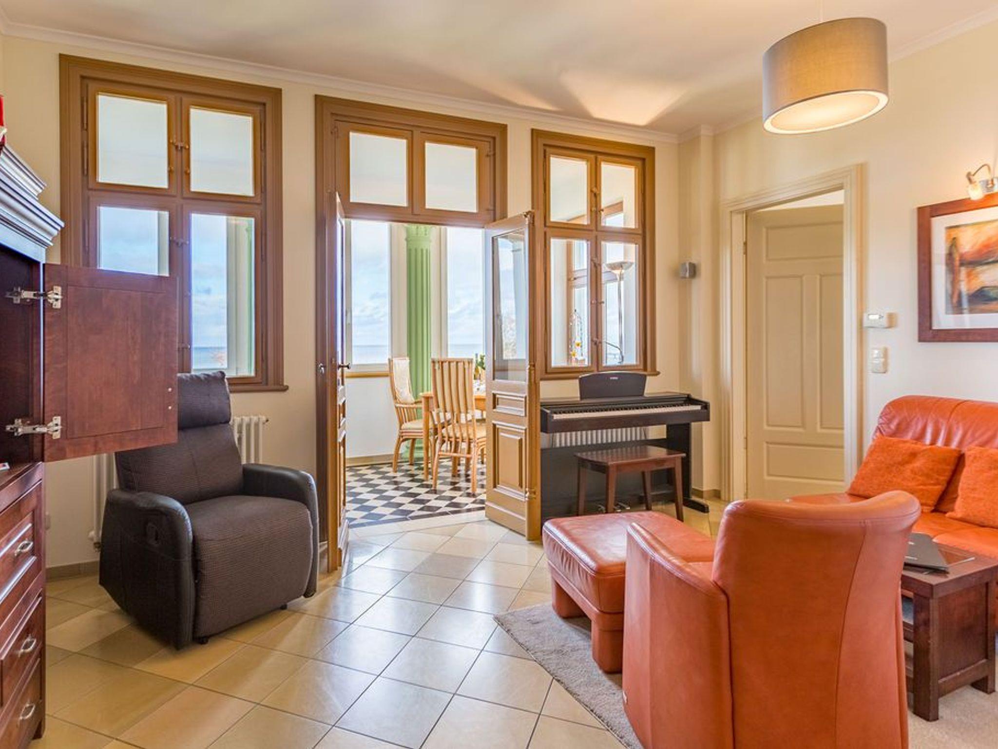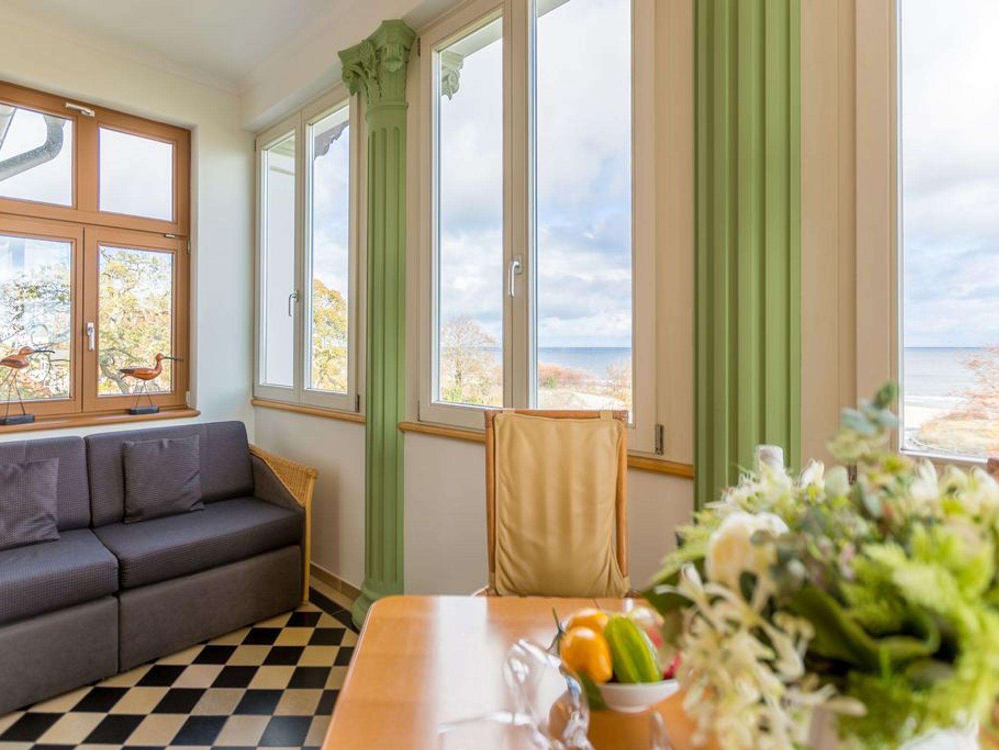 Genießen Sie den fantastischen Meerblick. Entspannen Sie in Räumen mit geschmackvoller Möblierung. Zur Wohnung gehören ein gemütlicher Wohnbereich mit TV und E-Klavier, eine komplett ausgestattete Küchenzeile, eine verglaste Veranda mit Essplatz und bequemer Couch, von der Sie durch die großen Fensterfronten direkten Blick auf die Ostsee genießen. Ein Schlafzimmer mit Doppelbett bietet Platz für zwei Personen und ein Kleinkind. Auf Wunsch stellen wir für unsere kleinen Gäste ein Kinderreisebett (ohne zusätzliche Matratze [&] Bettzeug) und einen Kinderhochstuhl ( gegen einen Aufpreis) zur Verfügung. Für Ihren Komfort sind die Betten bei der Anreise bezogen und Handtücher liegen bereit (Erstausstattung). Das WLAN-Netz kann kostenfrei genutzt werden.