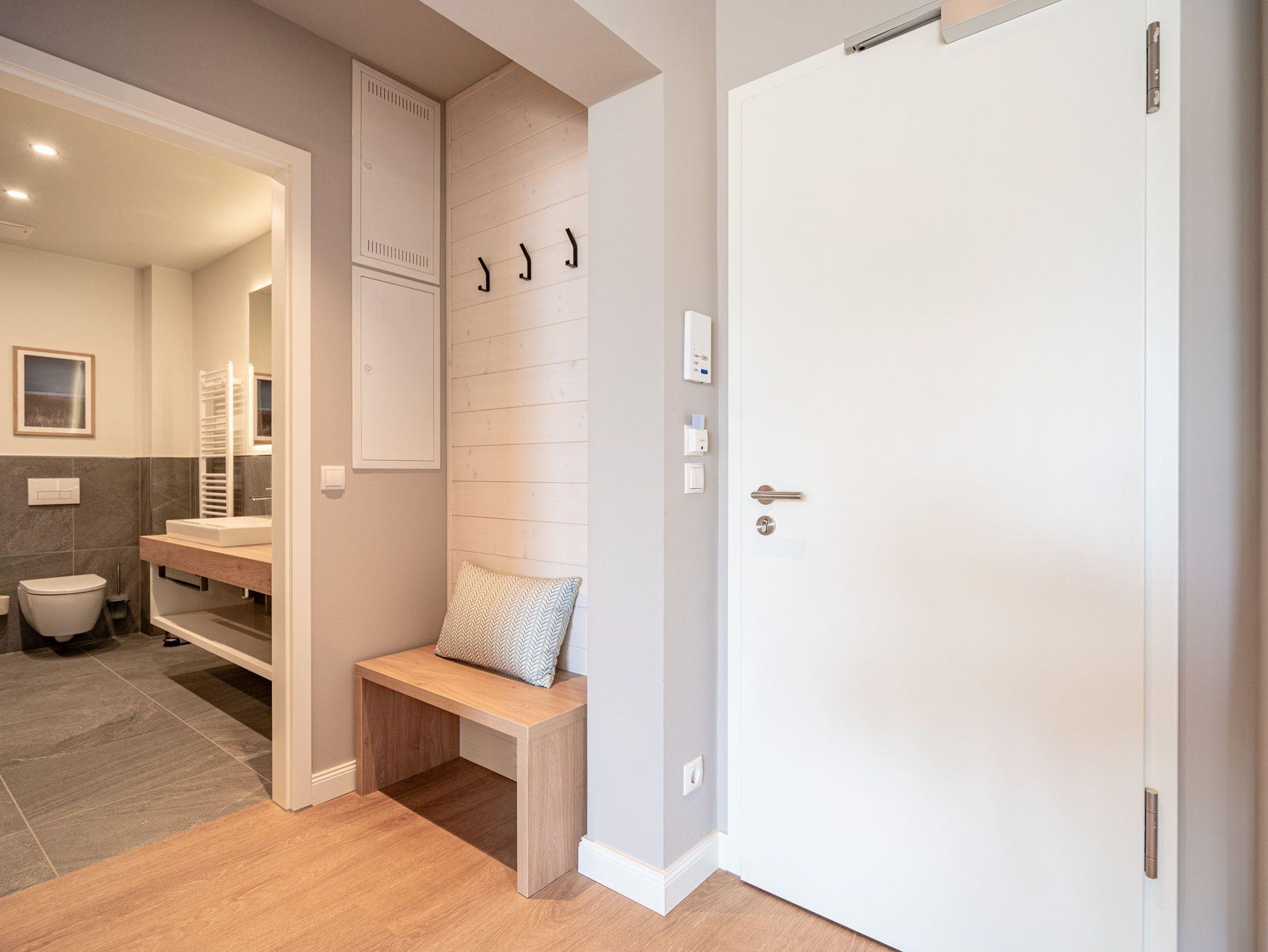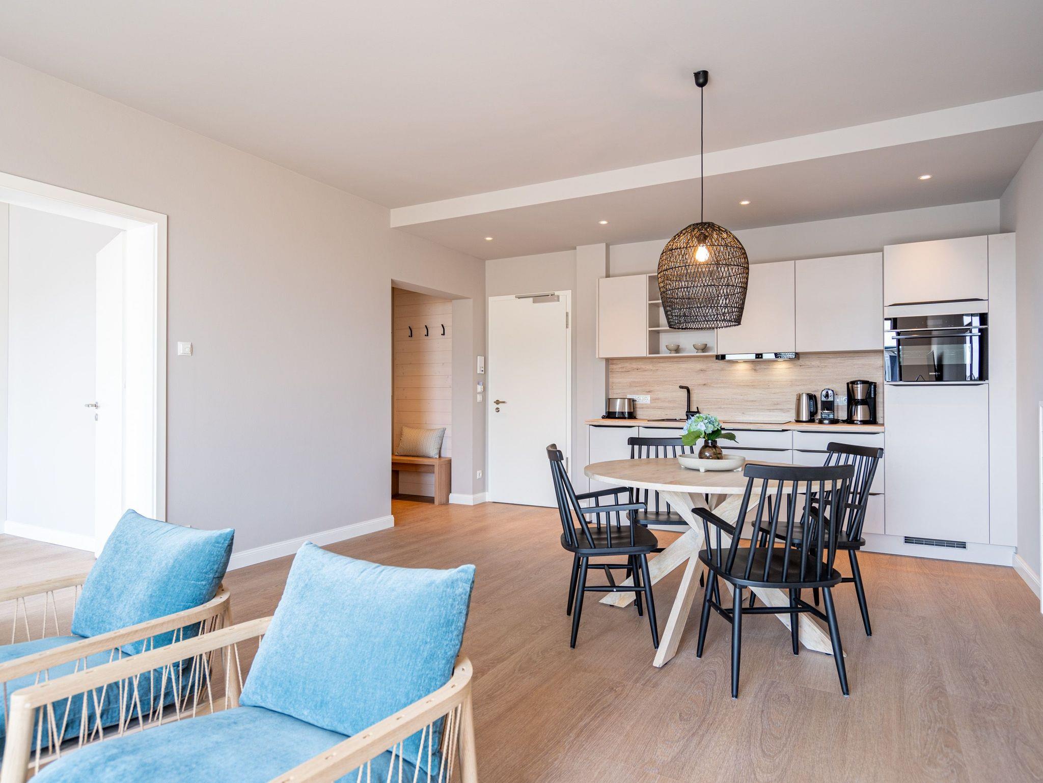Herzlich willkommen im 2-Raum-Appartement B 3.3 (Haus B) in der 3. Etage der Strandterrasse. Die 77 Quadratmeter dieser großzügigen und modern eingerichteten Wohnung sind für 2 Personen und ein Kleinkind im Babybett ein idealer Rückzugsort direkt an der Ostsee. Sie lieben das Meer? Dann können Sie sich hier auf viel Meerblick freuen. Von gleich zwei Balkonen haben Sie aus dieser Wohnung eine herrliche Aussicht auf die Ostsee. Die Balkone sind nach Osten hin ausgerichtet. Dadurch können Sie schon morgens die Sonne aufgehen sehen. Genießen Sie die Zeit an der frischen Ostseeluft, ganz gleich, ob beim Essen am Balkontisch oder auf der Sonnenliege. Das Wohn-Esszimmer lädt zu entspannten Stunden auf der Sofa-Sitzgruppe ein. Ein Elektrokamin (ohne Wärmeabgabe) sorgt für eine romantische Atmosphäre und der große Flat-TV (50 Zoll) für spannende Unterhaltung. Kochen können Sie in der offenen Küche an hochwertigen Elektrogeräten. Vom Backofen über einen 3-Platten-Induktionsherd, eine Geschirrspülmaschine, Kaffeemaschine und sogar eine Nespresso-Kapselmaschine ist alles vorhanden, was man braucht. Essen können Sie am schönen, großen Tisch mit 4 Stühlen. Sie werden herrlich schlafen, denn das bequeme und äußerst große Boxspringdoppelbett (2,00m x 2,00m) im Schlafzimmer wird Ihnen zu himmlischen Träumen verhelfen. Zudem ist es mit einem geräumigen Kleiderschrank, einem festen Babybett und einem Flat-TV (50 Zoll) ausgestattet. Das Schlafzimmer verfügt über einen Zugang zu einem der beiden Balkone. Das Wohnzimmer gewährt Zutritt zum anderen Balkon. Das Badezimmer verfügt über eine Dusche, einen Waschtisch und ein WC. Als zusätzliches Wellness-Gimmick gibt es eine Infrarotsaunakabine. Zur Wohnung gehört in der Tiefgarage ein PKW-Stellplatz. Sie brauchen als nur noch Ankommen und Reinspringen in Ihre Meerauszeit. Viel Vergnügen!