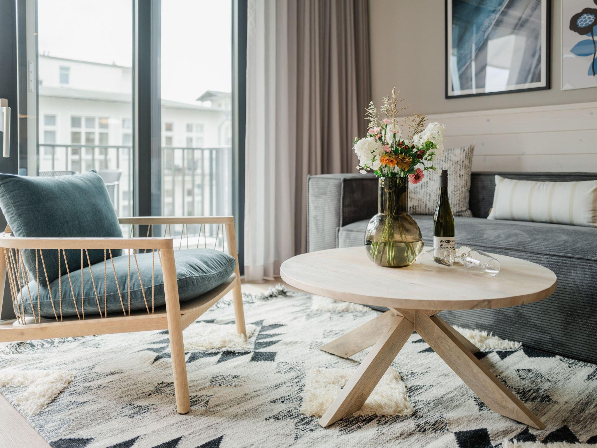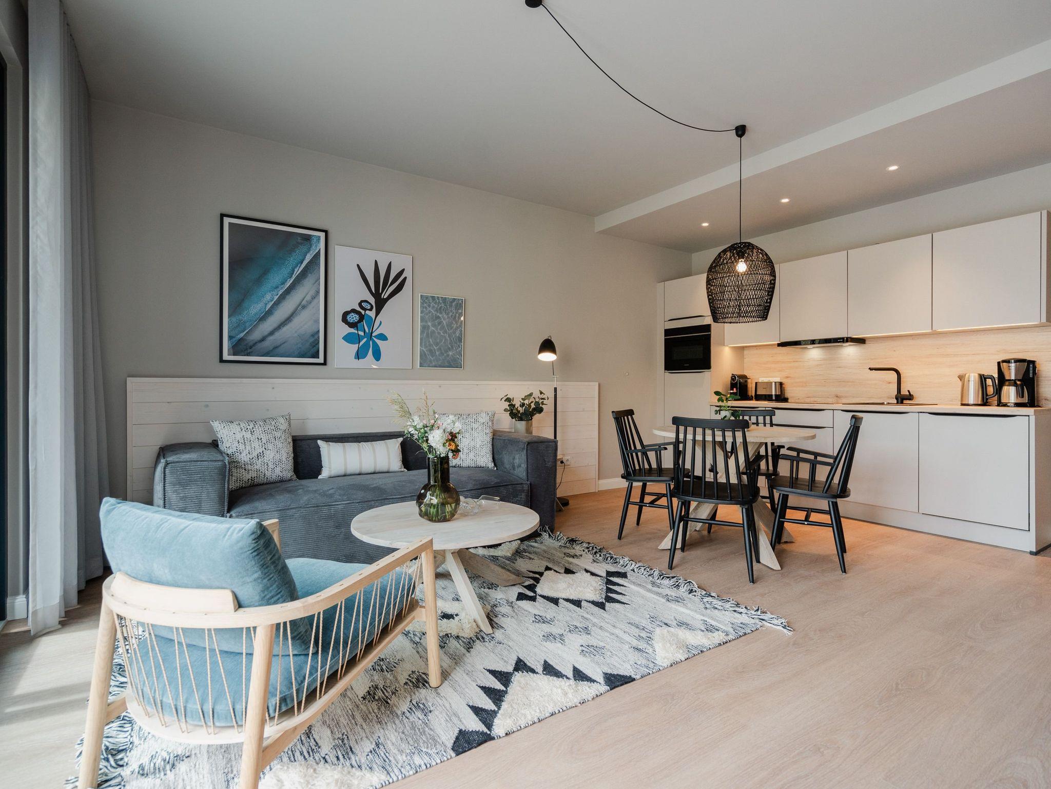 Eine lichtdurchflutete und großzügige 3-Raum-Wohnung erwartet Sie im Appartement B 1.2 in der 1. Etage der Strandterrasse im Haus B. Freuen Sie sich auf viel Gemütlichkeit und ein modernes Design. Die 78 Quadratmeter sind von unserer Inneneinrichterin mit viel Liebe und dem Händchen fürs nordisch Noble eingerichtet worden. Bis zu 4 Personen bietet das Appartement ein stilvolles Zuhause auf Zeit direkt an der Ostsee. Von gleich zwei Balkonen können Sie die frische Ostseebrise genießen und das Rauschen der Wellen vom nur 80 Meter entfernten Strand hören. Der geräumige Wohn-Essbereich ist mit einem schönen Esstisch und einem gemütlichen Sofa mit Sessel ausgestattet. Das elegante Grau kombiniert mit Weiß und den Farben der Ostsee sorgt für eine außergewöhnliche Designnote. Zum Wohnzimmer gehört eine offene Küche, die mit einem Backofen, einem 4-Platten-Induktionsherd und einer Nespresso-Kapselmaschine bestens bestückt ist. Hier macht das Zubereiten der Mahlzeiten Spaß. An einer kleinen Workingstation können Sie alles auf eine Karte schreiben, was Sie in Ihrer Auszeit erlebt haben. Ein nostalgisches Hobby, das zunehmend wieder in Mode kommt. Ein großer Flat-TV (50 Zoll) verwandelt das Wohnzimmer in ein privates Kino. Romantische Akzente setzt der Elektrokamin (ohne Wärmeabgabe). So kann man sich auch im Sommer im wunderbaren Flackern verlieren. Die beiden Balkone bieten einen seitlichen Ausblick Richtung Ostsee und sind mit einem Gartentisch, 4 Stühlen und einer Gartenliege ausgestattet. Das Wohnzimmer hat einen Zugang und eines der beiden Schlafzimmer hat einen weiteren Zugang zu den Balkonen. Beiden Schlafzimmern gleichermaßen eigen ist ein bequemes Boxspringdoppelbett (1,80m x 2,00m) und ein Kleiderschrank. Ein Schlafzimmer verfügt über einen 43 Zoll Flat-TV, das zweite Schlafzimmer über einen 32 Zoll Flat-TV. Ihr Domizil besitzt zwei moderne Duschbäder mit Waschtisch und WC. In einem Bad befindet sich eine Infrarotsaunakabine für entspannende Auszeitmomente. Zu dem Appartement gehört in der Tiefgarage ein PKW-Stellplatz. Nun müssen Sie nur noch heil und gesund in ihrer Unterkunft ankommen und der Urlaub kann beginnen. Meer geht eben immer!