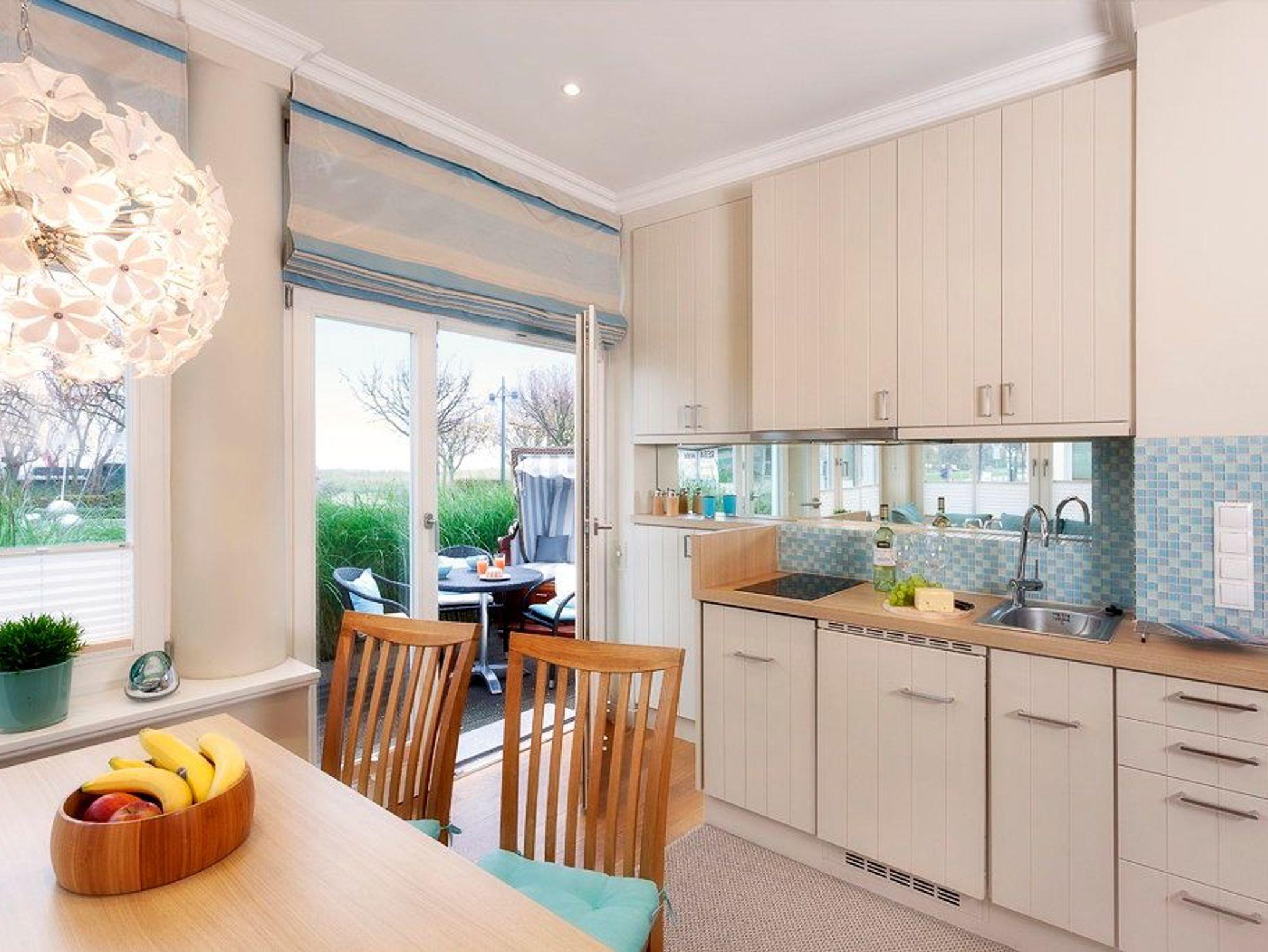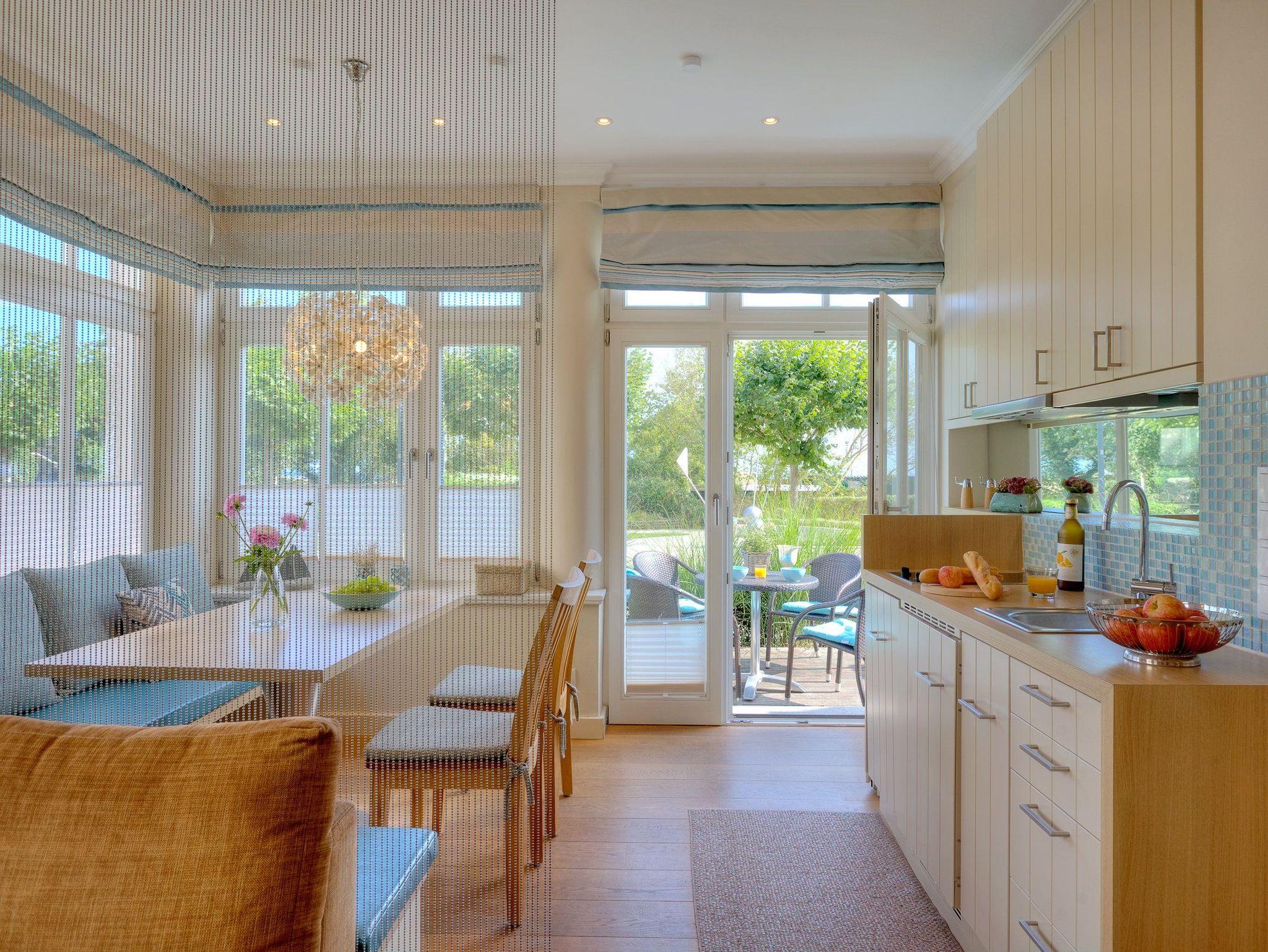 Die gut ausgestattete Küche befindet sich in der Loggia und verfügt über Ceranfeld, Mikrowelle mit Grillfunktion, Kühlschrank mit Gefrierfach sowie Geschirrspüler. Vom Wohnbereich gelangen Sie auf Ihre private Nordost-Terrasse mit Strandkorb, von der aus Sie einen schönen Blick auf die Ostsee und die Ahlbecker Promenade genießen.