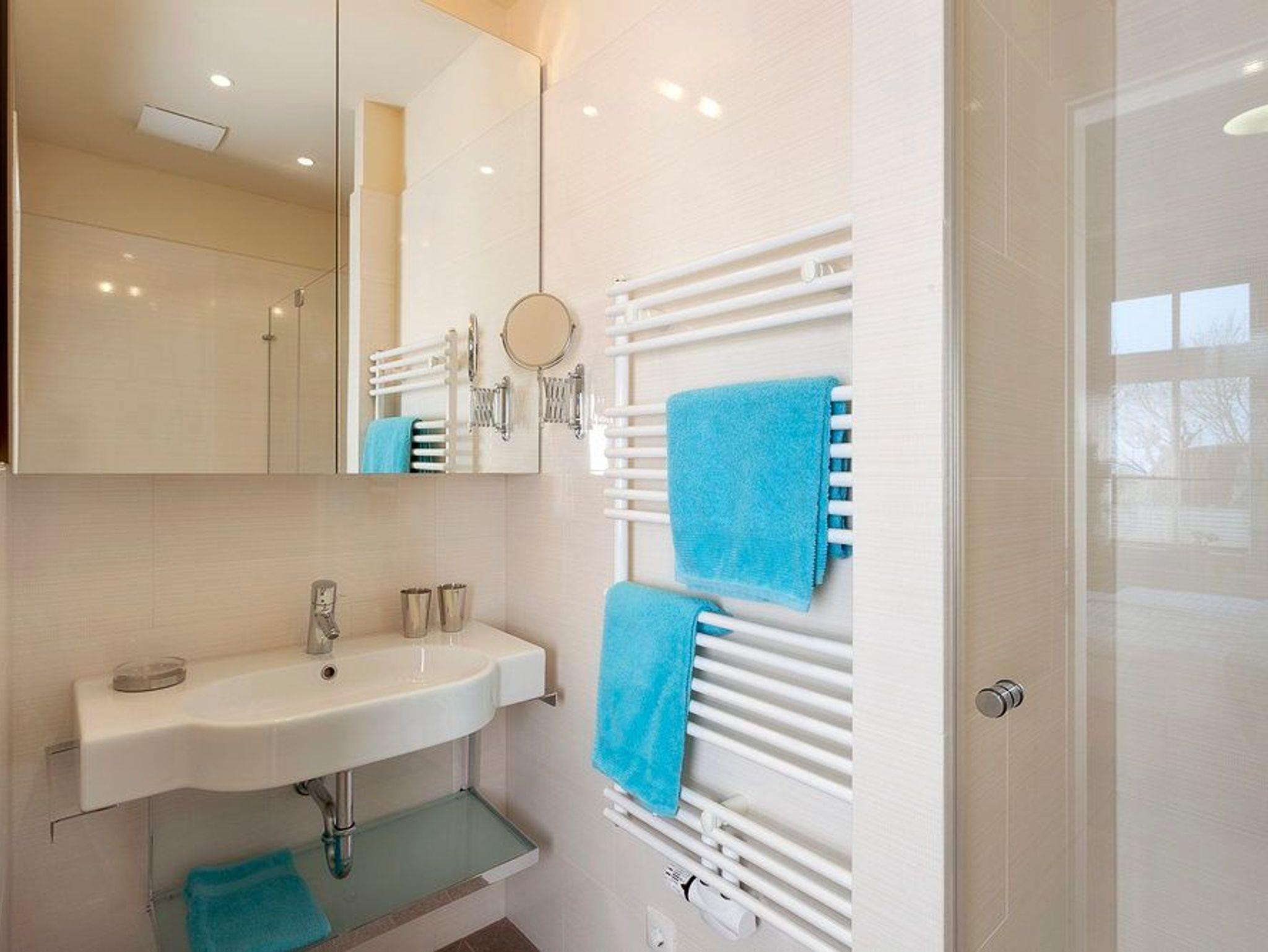 Ein echter Vorteil ? gerade bei mehreren Personen: Das Appartement verfügt über zwei moderne Badezimmer, eines direkt am Schlafzimmer als Bad en Suite, das zweite vom Flur aus erreichbar. Beide sind mit bodengleicher Dusche, Regenbrause, Handbrause, WC, großzügigen Spiegelschränken und Haarfön ausgestattet.