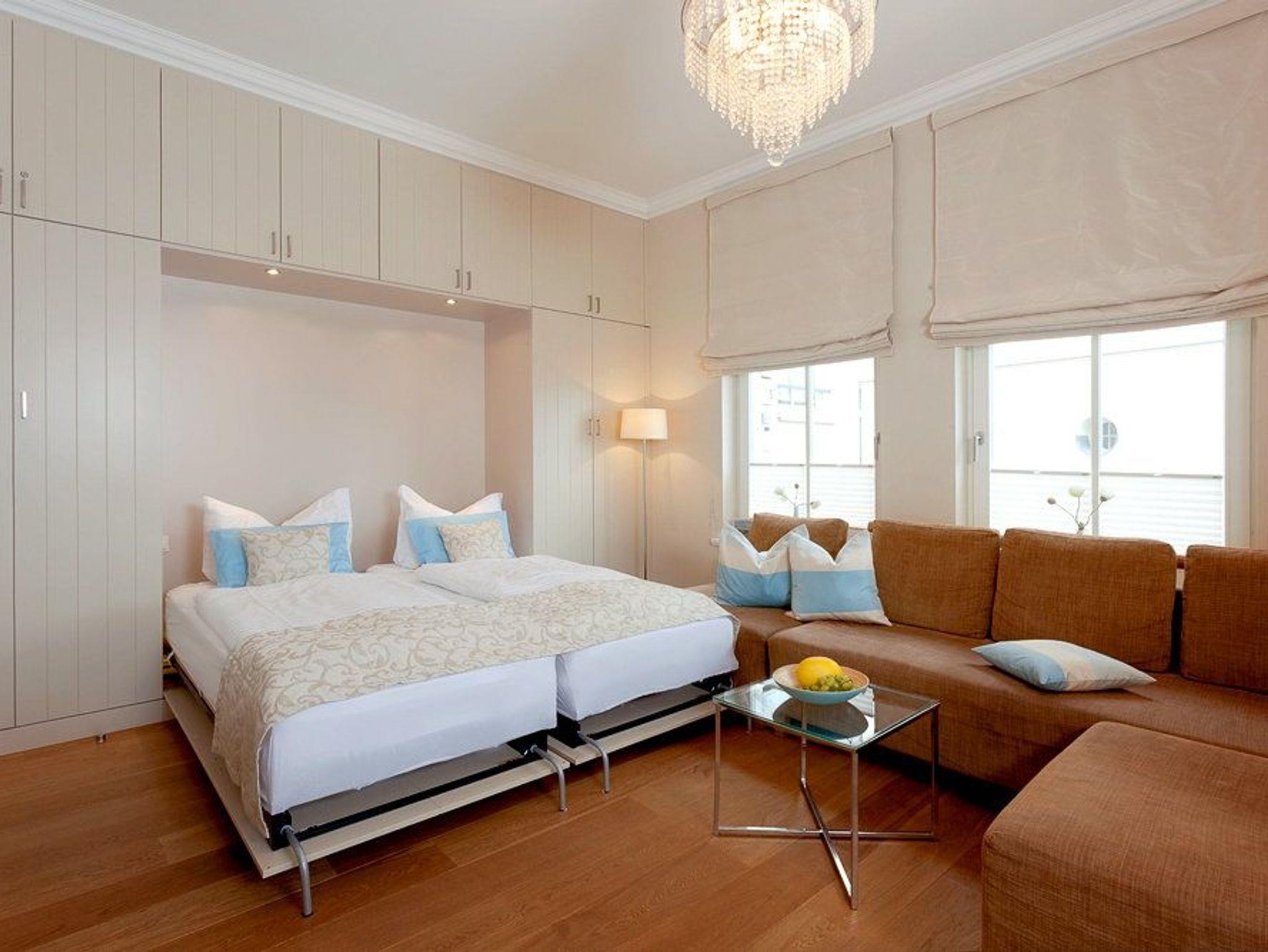 Der Wohnbereich lädt mit einer gemütlichen Polstersitzecke zum Entspannen ein. Ein Flachbildfernseher ist vorhanden. Im Wohnraum befindet sich zudem ein hochwertiges Schrankbett (180 x 200 cm, zwei getrennte Matratzen), das sich im Handumdrehen in eine komfortable Schlafmöglichkeit für zwei Personen verwandeln lässt und tagsüber platzsparend verschwindet.