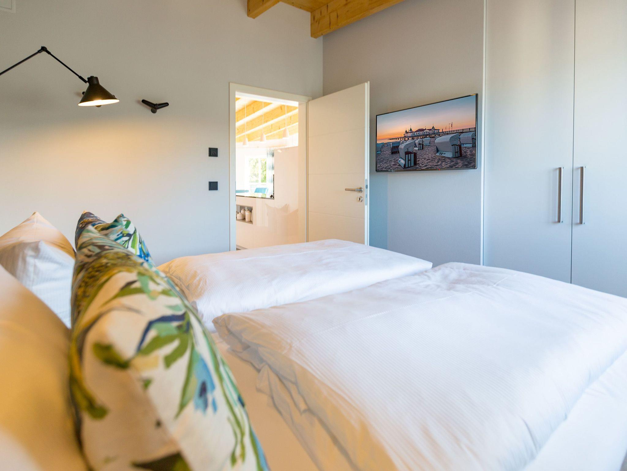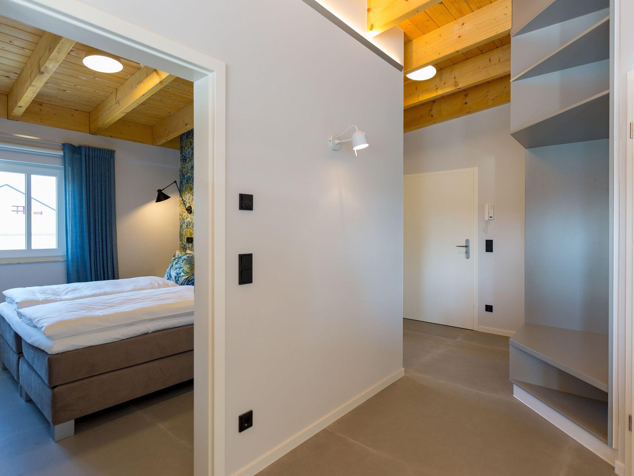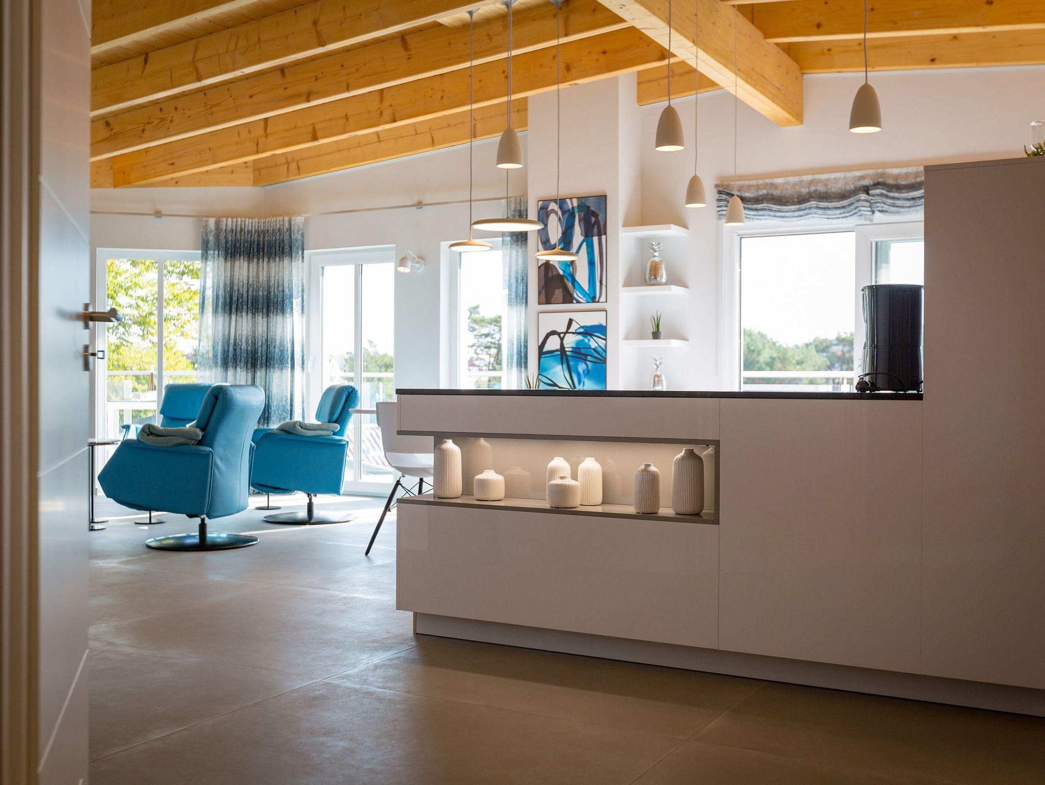 Exklusives und modernes Wohnflair mit Meerblick bietet dieses 84 Quadratmeter große barrierefreie Urlaubsparadies in seinen drei Räumen im Penthouse des Domizils Düne 8. Entspannen Sie hier mit bis zu 4 Personen und einem Kleinkind bis 3 Jahre (im Kinderreisebett). Eine hohe, offene Holzbalkendecke, stylische Designmöbel, ein moderner Gas-Kamin ? eine Wohlfühlwelt, in der man wunderbar abschalten kann. Eine umlaufende Sonnenterrasse mit Meerblick (ges. 33m²)lädt zum Verweilen ein. So entspannend sollte Urlaub sein! Im Inneren erwarten Sie lichte und hohe Räume. Die Ledersessel vor dem großen Flat-TV im offenen und großzügig geschnittenen Wohn-Ess-Zimmer lassen sich bequem in eine Liegeposition verstellen, so dass jeder seine eigene, kleine Relax-Area bekommt. Verbindungsglied zwischen dem Wohnbereich und der mit hochwertigen Markengeräten voll ausgestatteten Küche ist ein wunderschöner Essplatz mit stylischem Esstisch im Industriallook und bequemen Schalensesseln. Die Küche ist absolut modern mit einer freistehenden Kochinsel, High End-Kochfeld mit integriertem Dunstabzug und edlem Geschirr eingerichtet. Die beiden Schlafzimmer ? eines sogar mit Zugang zur großen Terrasse ? verwöhnen mit Behaglichkeit und viel Stauraum. Komfortable Boxspringdoppelbetten (1,80 m x 2,00 m) sorgen für Schlafvergnügen und die passgenauen Einbauschränke bieten ausreichend Ablagefläche. In beiden Zimmern gibt es einen Flat-TV. Die beiden Tageslicht-Bäder verfügen über eine Regendusche, einen Waschtisch und ein WC. Ein kleines Highlight wartet darüber hinaus zusätzlich in einem der Badezimmer auf Sie: Entspannen und genießen Sie Ihre Auszeit erst so richtig in der eigenen, Finnischen Sauna. Da freut man sich sogar auf kühlere Abende oder ungemütliche Herbst- oder Wintertage. Sie wollen auch im Urlaub im Internet surfen? Kein Problem! Das WLAN ist kostenfrei. Für Ihren Komfort sind die Betten bei Ihrer Anreise bezogen. Und auch für Ihr Auto ist gesorgt. Einen überdachten Pkw-Außenstellplatz gibt es am Haus. Außerdem gehört zu der Wohnung ein eigener Fahrradabstellraum.
