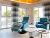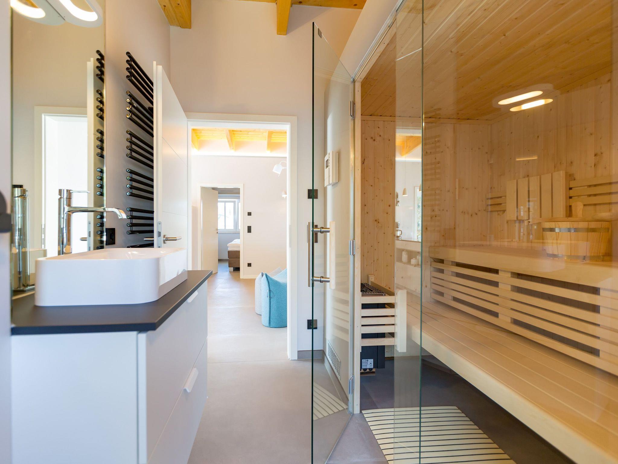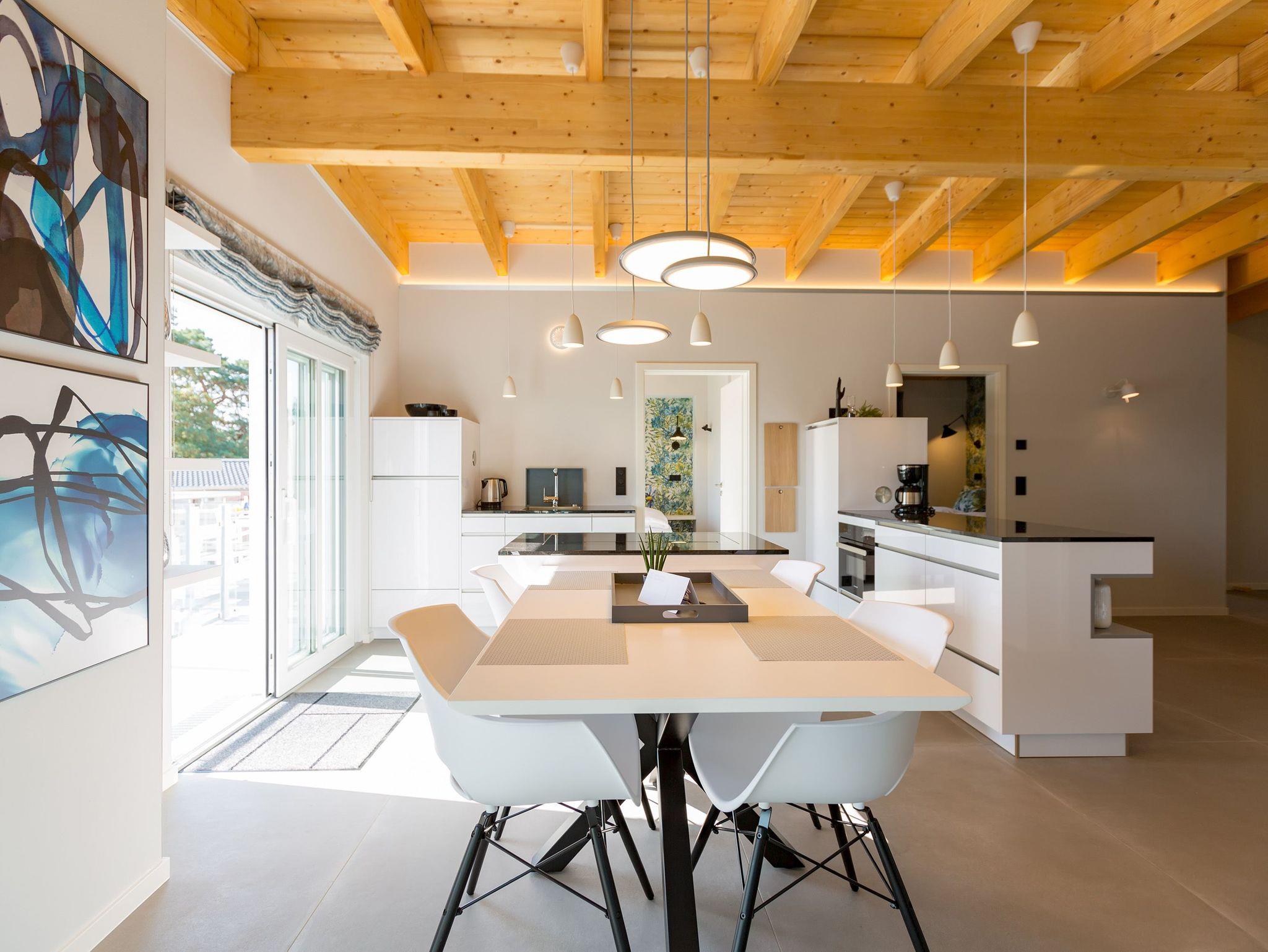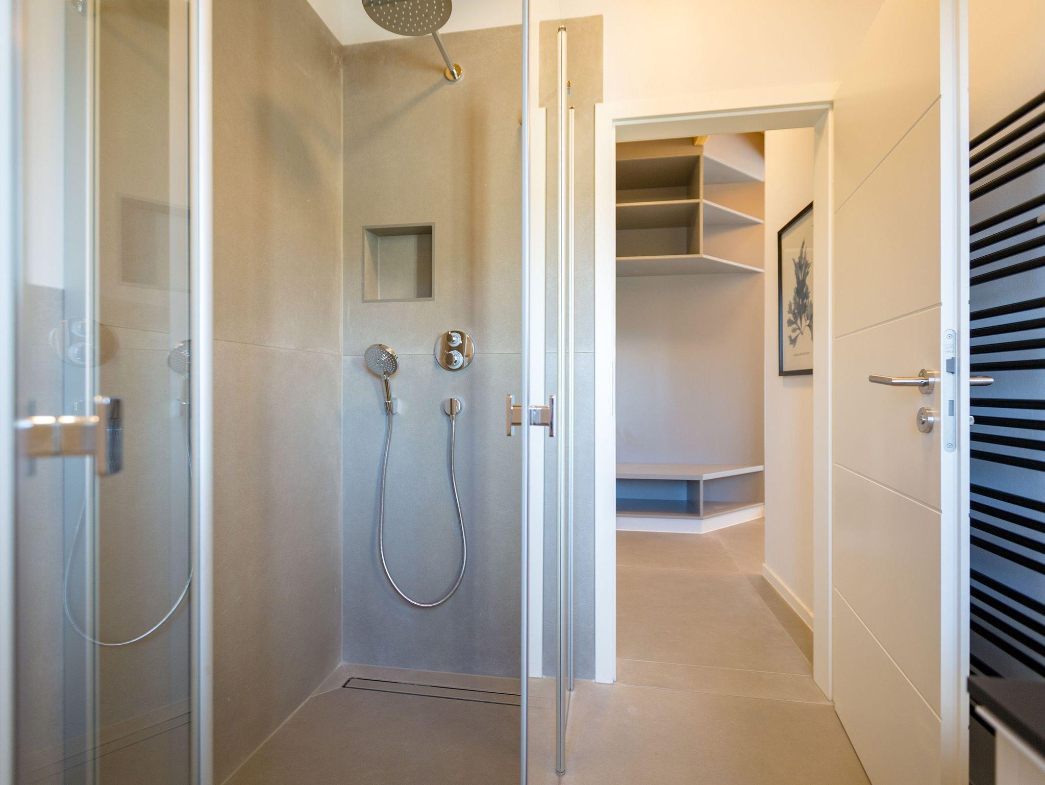 Exklusives und modernes Wohnflair mit Meerblick bietet dieses 84 Quadratmeter große barrierefreie Urlaubsparadies in seinen drei Räumen im Penthouse des Domizils Düne 8. Entspannen Sie hier mit bis zu 4 Personen und einem Kleinkind bis 3 Jahre (im Kinderreisebett). Eine hohe, offene Holzbalkendecke, stylische Designmöbel, ein moderner Gas-Kamin ? eine Wohlfühlwelt, in der man wunderbar abschalten kann. Eine umlaufende Sonnenterrasse mit Meerblick (ges. 33m²)lädt zum Verweilen ein. So entspannend sollte Urlaub sein! Im Inneren erwarten Sie lichte und hohe Räume. Die Ledersessel vor dem großen Flat-TV im offenen und großzügig geschnittenen Wohn-Ess-Zimmer lassen sich bequem in eine Liegeposition verstellen, so dass jeder seine eigene, kleine Relax-Area bekommt. Verbindungsglied zwischen dem Wohnbereich und der mit hochwertigen Markengeräten voll ausgestatteten Küche ist ein wunderschöner Essplatz mit stylischem Esstisch im Industriallook und bequemen Schalensesseln. Die Küche ist absolut modern mit einer freistehenden Kochinsel, High End-Kochfeld mit integriertem Dunstabzug und edlem Geschirr eingerichtet. Die beiden Schlafzimmer ? eines sogar mit Zugang zur großen Terrasse ? verwöhnen mit Behaglichkeit und viel Stauraum. Komfortable Boxspringdoppelbetten (1,80 m x 2,00 m) sorgen für Schlafvergnügen und die passgenauen Einbauschränke bieten ausreichend Ablagefläche. In beiden Zimmern gibt es einen Flat-TV. Die beiden Tageslicht-Bäder verfügen über eine Regendusche, einen Waschtisch und ein WC. Ein kleines Highlight wartet darüber hinaus zusätzlich in einem der Badezimmer auf Sie: Entspannen und genießen Sie Ihre Auszeit erst so richtig in der eigenen, Finnischen Sauna. Da freut man sich sogar auf kühlere Abende oder ungemütliche Herbst- oder Wintertage. Sie wollen auch im Urlaub im Internet surfen? Kein Problem! Das WLAN ist kostenfrei. Für Ihren Komfort sind die Betten bei Ihrer Anreise bezogen. Und auch für Ihr Auto ist gesorgt. Einen überdachten Pkw-Außenstellplatz gibt es am Haus. Außerdem gehört zu der Wohnung ein eigener Fahrradabstellraum.