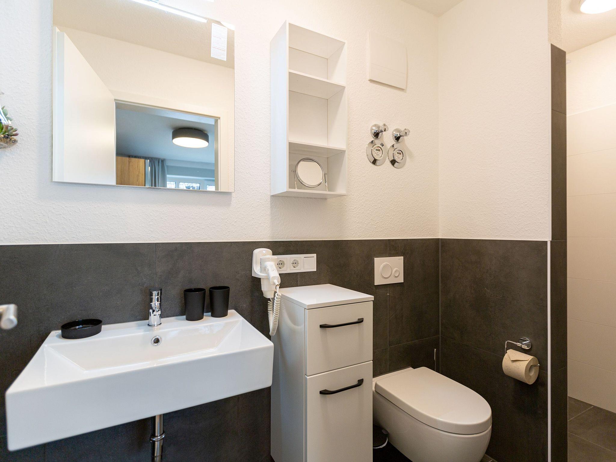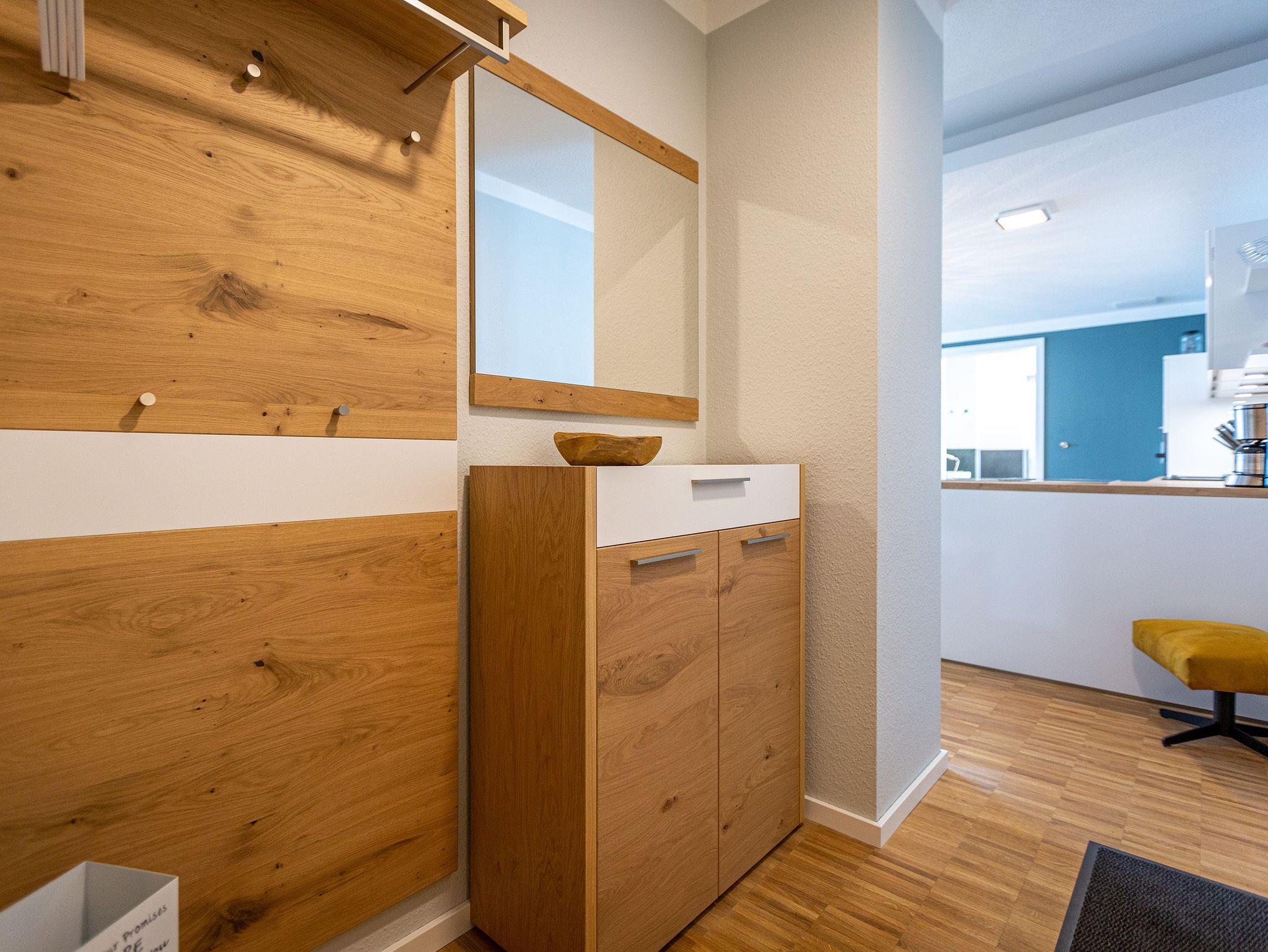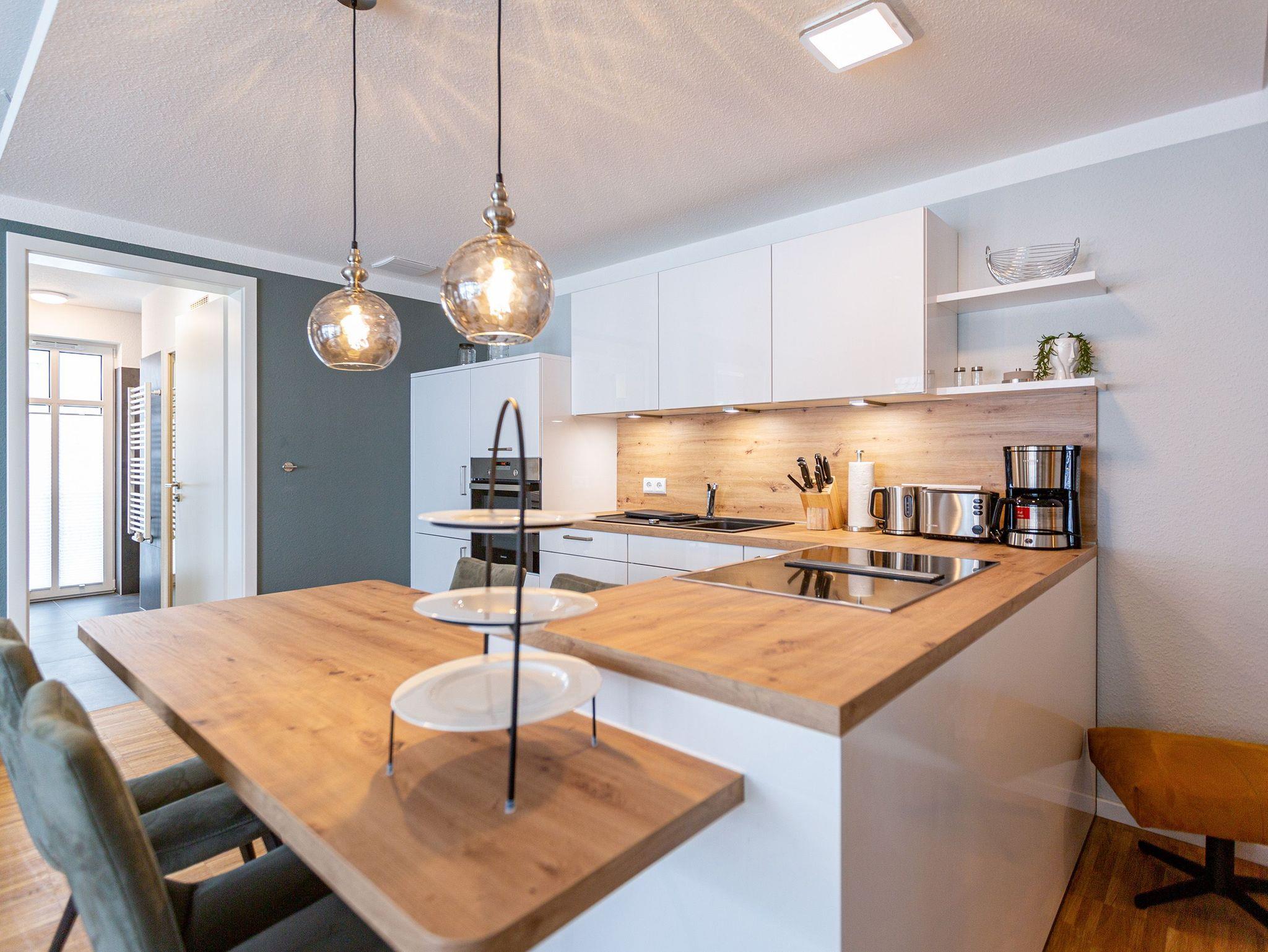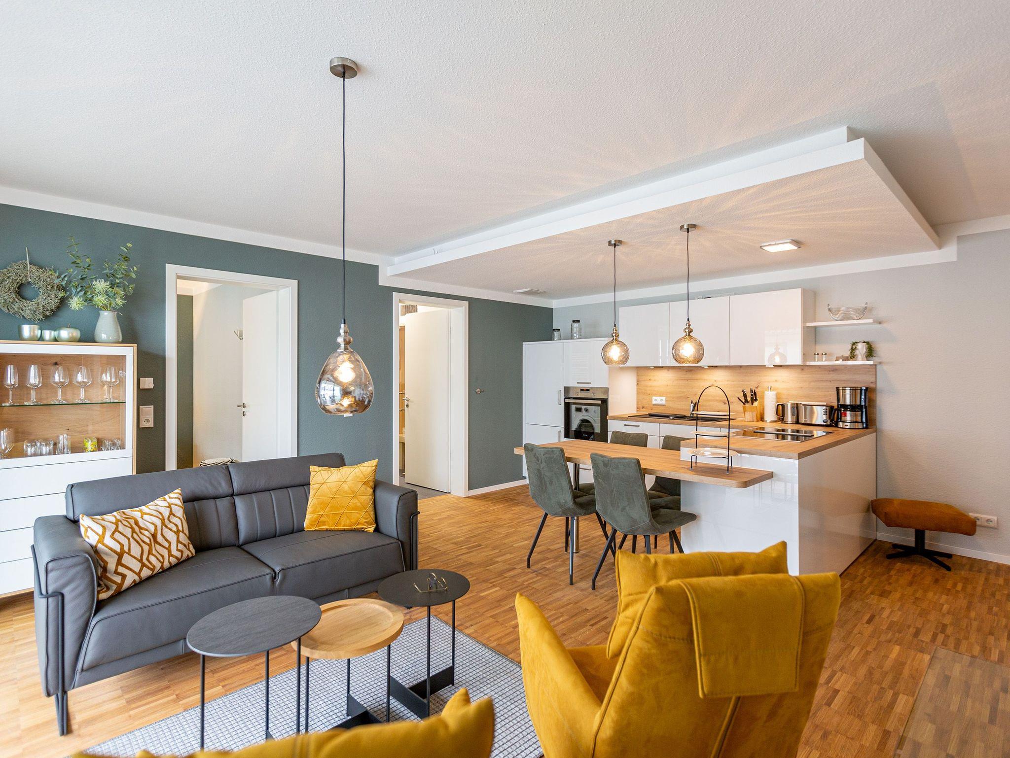 Bodentiefe Fenster lassen viel Licht in dieses moderne und gemütliche Drei-Zimmer-Appartement hinein. Die 76 Quadratmeter im ersten Obergeschoss bestechen mit stylischen Möbeln, mit viel Glas und Holz. Bis zu vier Personen und ein Kleinkind (im Babyreisebett) finden hier viel Platz für ihren Ostseeurlaub. Das Urlaubsdomizil hat ein offenes Wohn-Esszimmer mit einer bequemen Design-Landschaft aus Sofa und Sesseln, Smart-TV und einem Kaminofen. Vom Alltag abschalten? Das gelingt hier garantiert. Vom Wohnzimmer aus treten Sie auf einen West-Balkon mit Gartenmöbeln und zwei Sonnenliegen hinaus. Ob ein gemeinsames Essen unter freiem Himmel oder Entspannen in der Sonne ? hier geht beides. Sonne und Ostseeluft machen hungrig. Die Küche besitzt alles, was man sich für die Zubereitung eines ordentlichen Essens nur wünschen kann. Induktionsherd, Mikrowelle, Geschirrspüler? Alle Geräte sind hochwertig und auf dem neuesten Stand. Geschirr und Töpfe finden Sie in den Schränken. Die beiden Schlafzimmer sind identisch eingerichtet mit jeweils einem komfortablen Boxspringdoppelbett (1,80 m x 2,00 m), Smart-TVs und geräumigen Kleiderschränken. Es gibt zwei Bäder. Das Masterbad hat Tageslicht, Dusche, WC und eine kleine Finnische Sauna. Zudem ist es mit einer Waschmaschine ausgestattet. Das zweite Bad verfügt über eine Dusche und ein WC. Handtücher und Bettwäsche sind im Preis inbegriffen. Auch das WLAN ist kostenfrei. In der Tiefgarage ist für Sie ein Stellplatz reserviert. Im Keller gibt es einen separaten Fahrradraum.