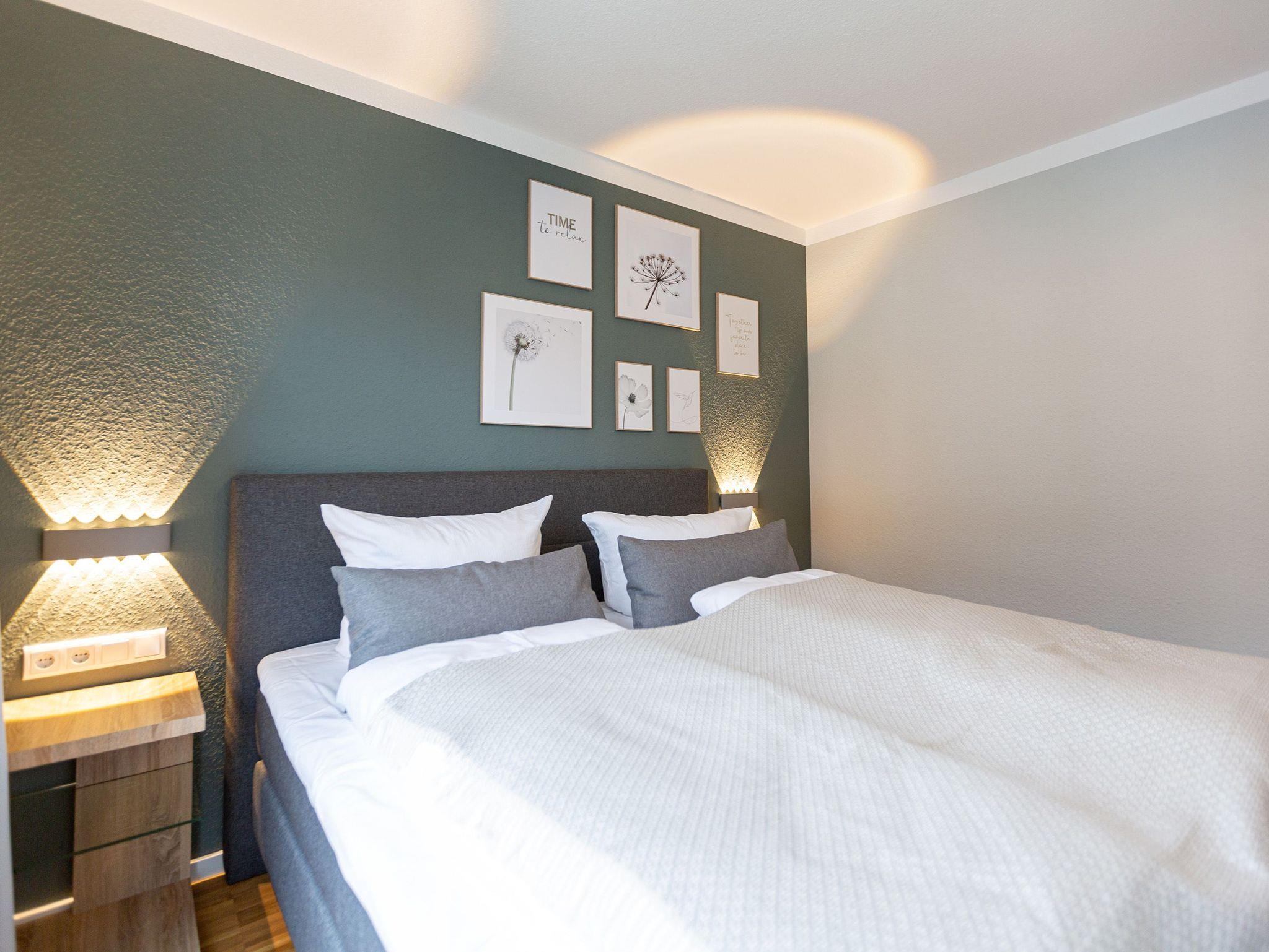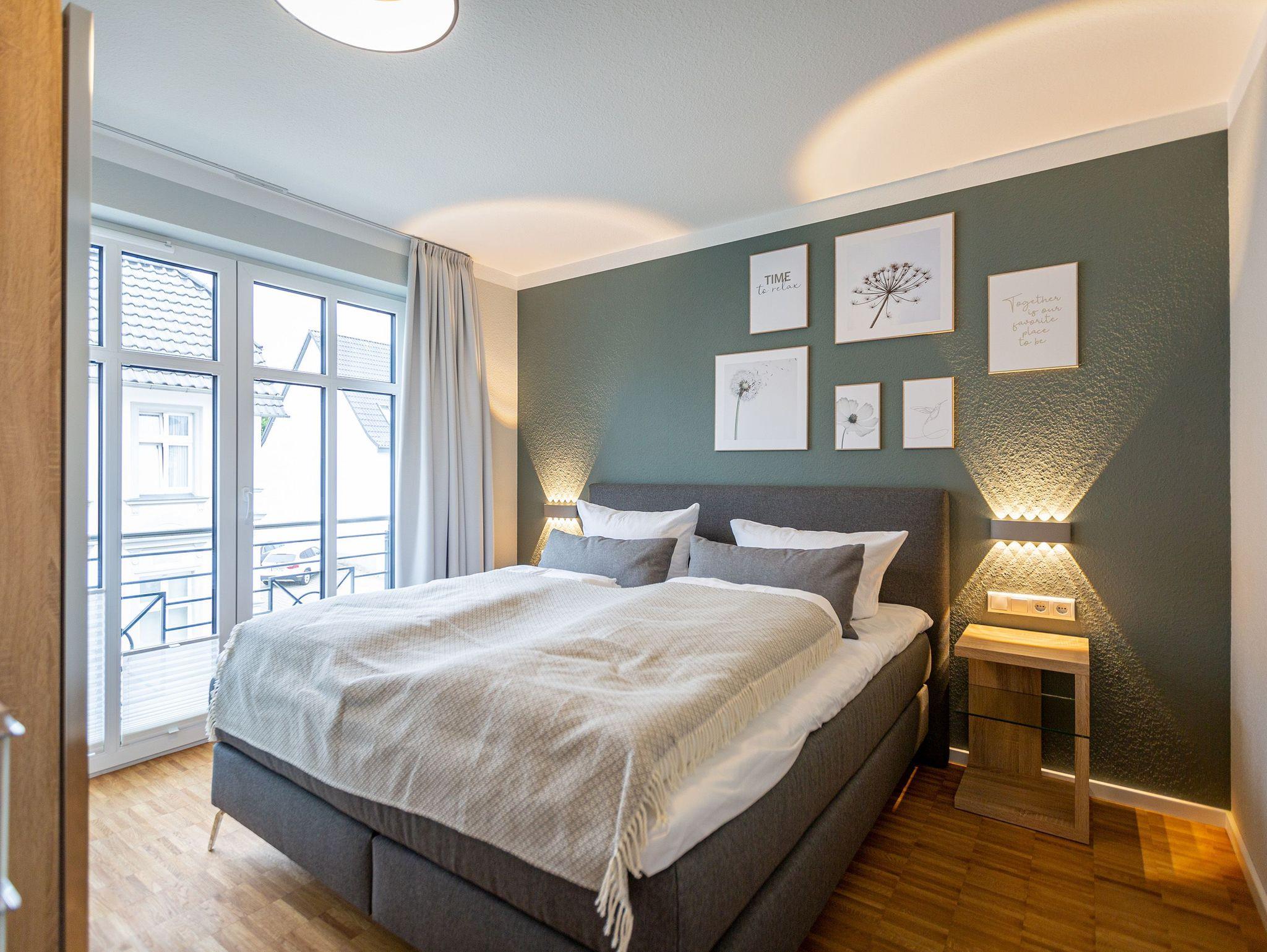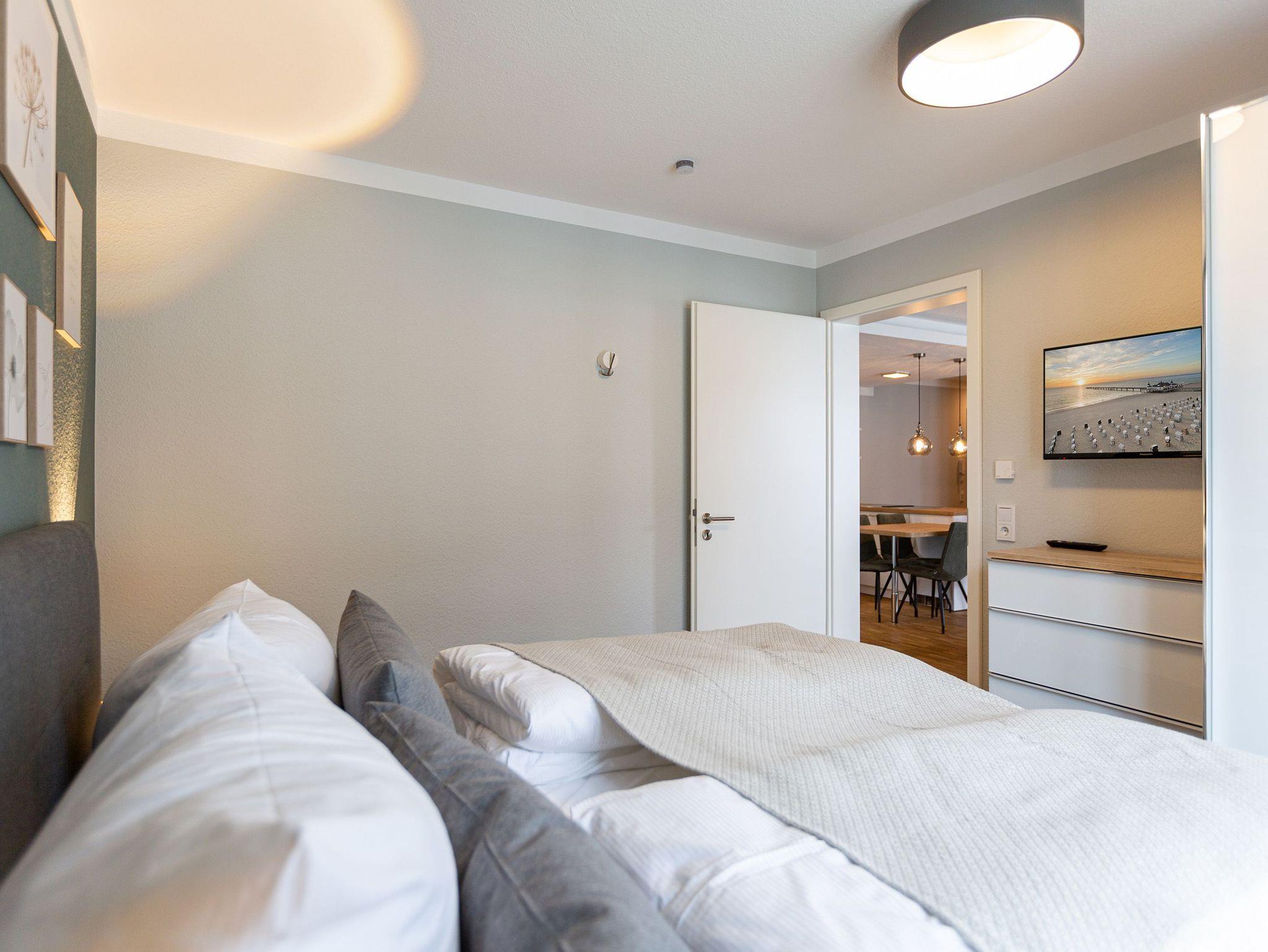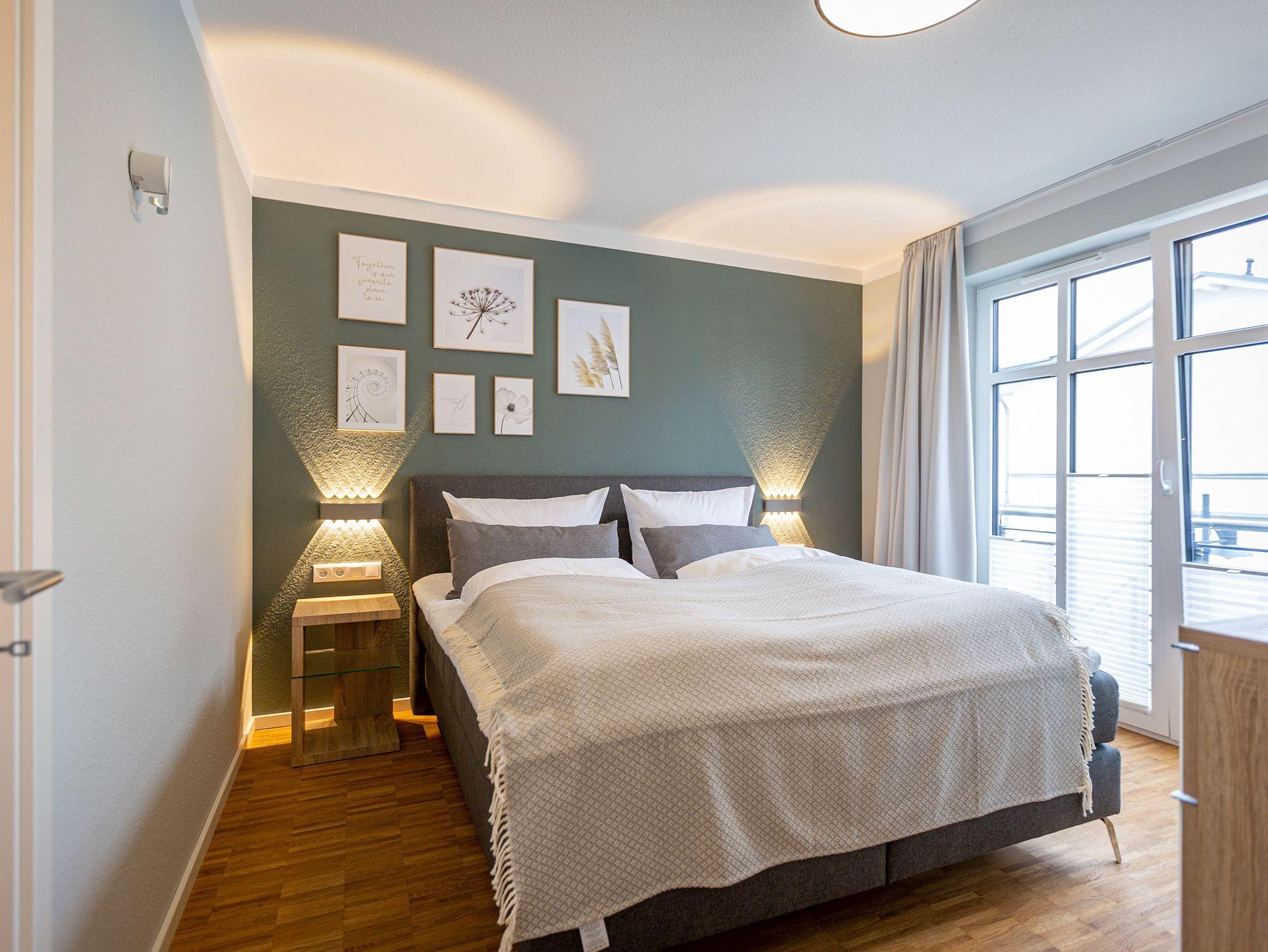 Bodentiefe Fenster lassen viel Licht in dieses moderne und gemütliche Drei-Zimmer-Appartement hinein. Die 76 Quadratmeter im ersten Obergeschoss bestechen mit stylischen Möbeln, mit viel Glas und Holz. Bis zu vier Personen und ein Kleinkind (im Babyreisebett) finden hier viel Platz für ihren Ostseeurlaub. Das Urlaubsdomizil hat ein offenes Wohn-Esszimmer mit einer bequemen Design-Landschaft aus Sofa und Sesseln, Smart-TV und einem Kaminofen. Vom Alltag abschalten? Das gelingt hier garantiert. Vom Wohnzimmer aus treten Sie auf einen West-Balkon mit Gartenmöbeln und zwei Sonnenliegen hinaus. Ob ein gemeinsames Essen unter freiem Himmel oder Entspannen in der Sonne ? hier geht beides. Sonne und Ostseeluft machen hungrig. Die Küche besitzt alles, was man sich für die Zubereitung eines ordentlichen Essens nur wünschen kann. Induktionsherd, Mikrowelle, Geschirrspüler… Alle Geräte sind hochwertig und auf dem neuesten Stand. Geschirr und Töpfe finden Sie in den Schränken. Die beiden Schlafzimmer sind identisch eingerichtet mit jeweils einem komfortablen Boxspringdoppelbett (1,80 m x 2,00 m), Smart-TVs und geräumigen Kleiderschränken. Es gibt zwei Bäder. Das Masterbad hat Tageslicht, Dusche, WC und eine kleine Finnische Sauna. Zudem ist es mit einer Waschmaschine ausgestattet. Das zweite Bad verfügt über eine Dusche und ein WC. Handtücher und Bettwäsche sind im Preis inbegriffen. Auch das WLAN ist kostenfrei. In der Tiefgarage ist für Sie ein Stellplatz reserviert. Im Keller gibt es einen separaten Fahrradraum.