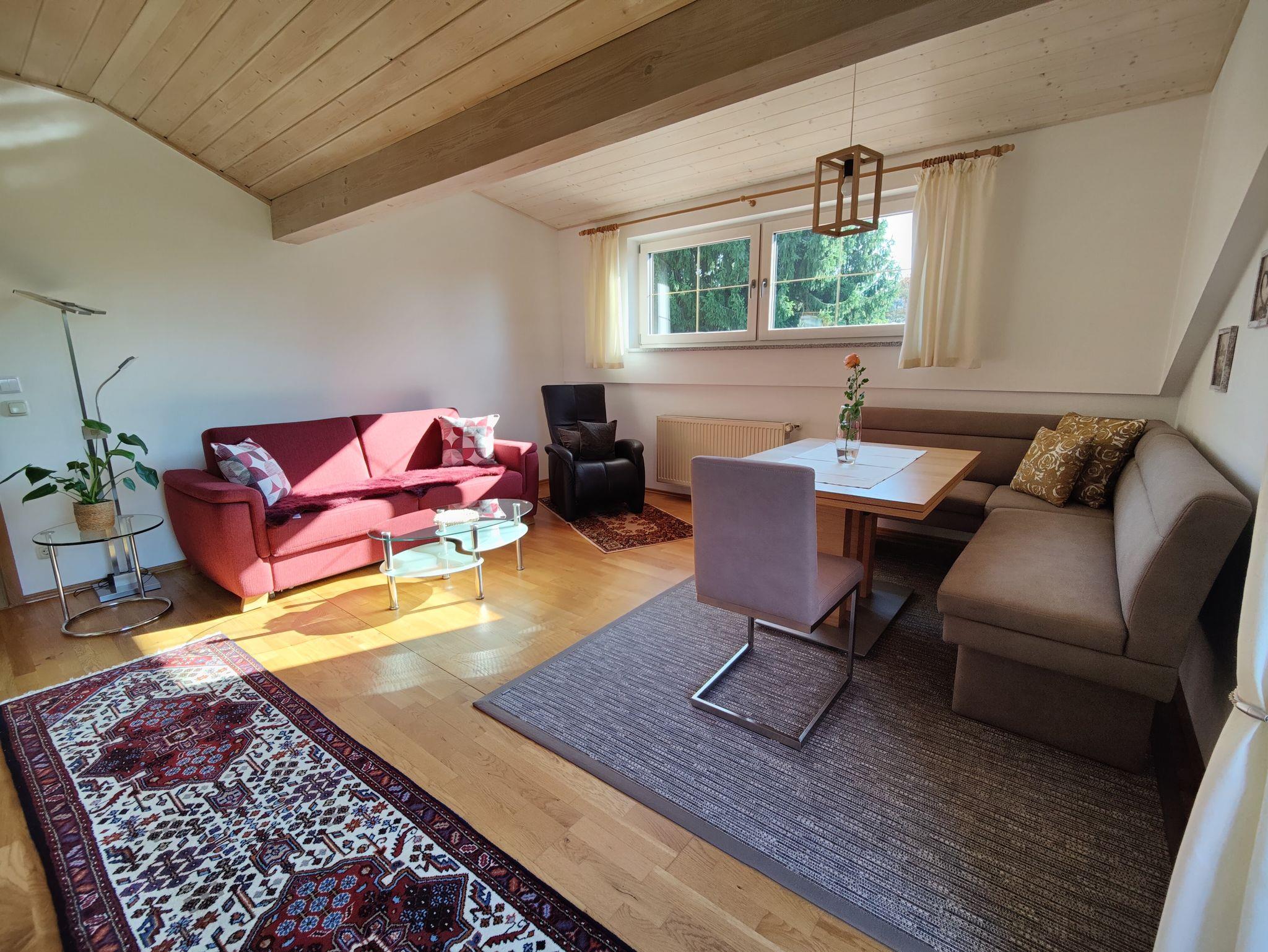 Massivholzboden, Holzdecken und Zugang zum großen Balkon runden das Wohlfühlklima in dieser Wohnung ab.