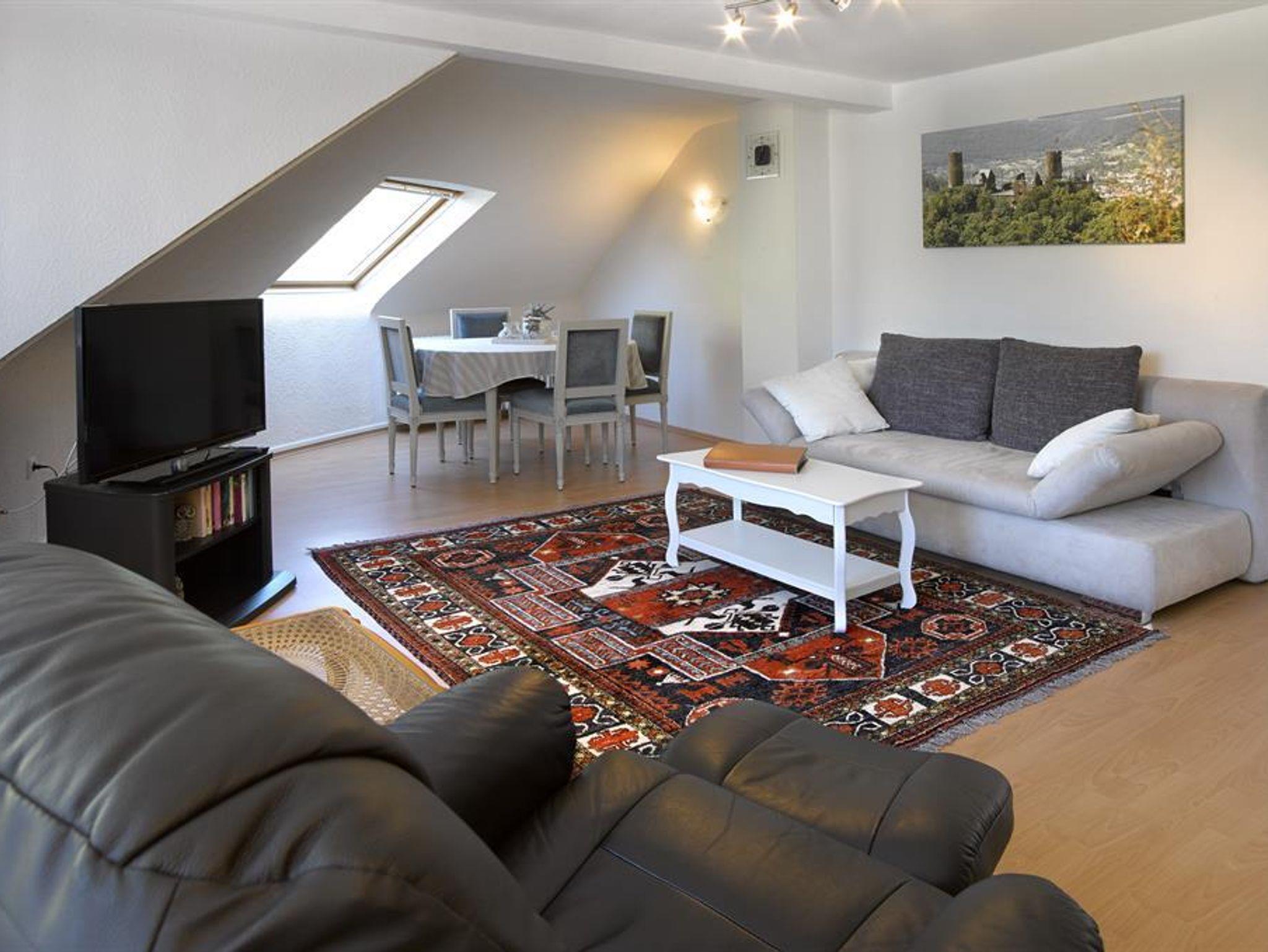 Die Ferienwohnung am Bleidenberg (ca. 90 m²), ist für 4 Personen geeignet. Großes Wohnzimmer mit gemütlichen Sofas, Kaminofen, TV, Hifi-Anlage, Bücherecke und optisch abgeteilter Esstischgruppe mit sechs Stühlen. Nebenan finden Sie die voll ausgestattete Küche mit Geschirrspülmaschine, Kaffeemaschine (Filter) und Bohnen-Kaffeemaschine sowie einer Grundausstattung an Verbrauchsmaterialien. In beiden Schlafzimmern stehen bequeme Boxspringbetten. Vom Balkon aus blicken Sie direkt auf den Bleidenberg-Weinberg. Das Bad ist mit einer ebenerdigen Dusche, Fön, handtuchwärmer, Grundausstattung wie z.B. Haarfön sowie einer Waschmaschine ausgestattet. Zusätzlich verfügt die Wohnung über ein Gäste-WC.
