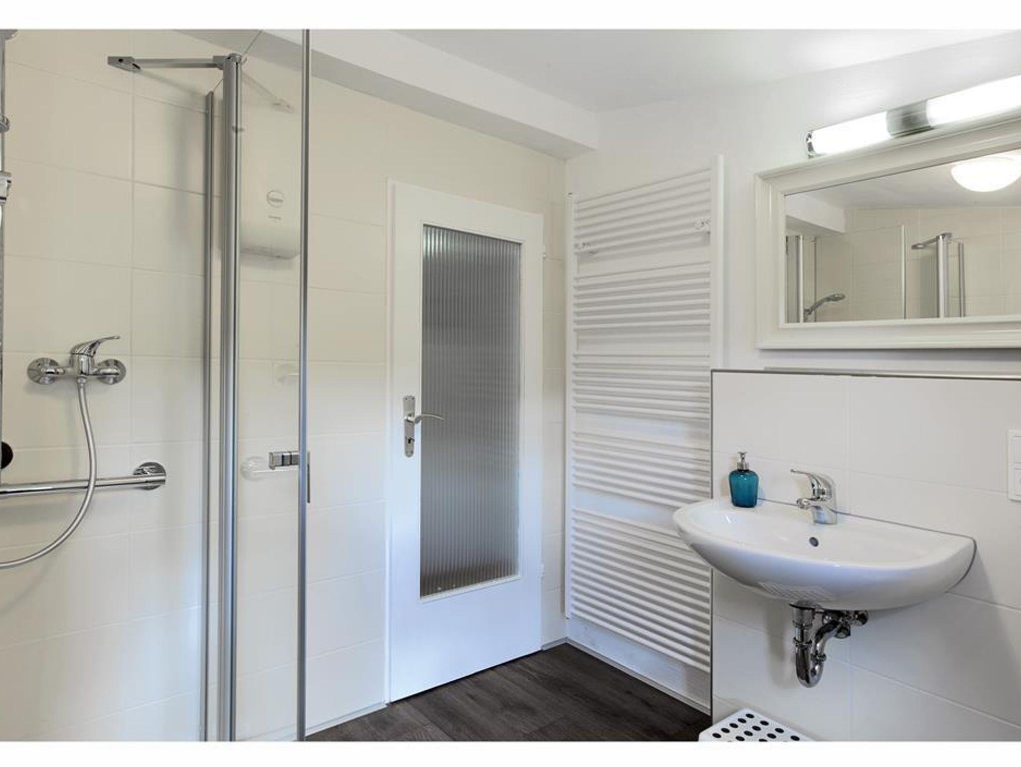 Das Badezimmer hat eine ebenerdige Dusche, ist mit Fön und Waschmaschine ausgestattet.