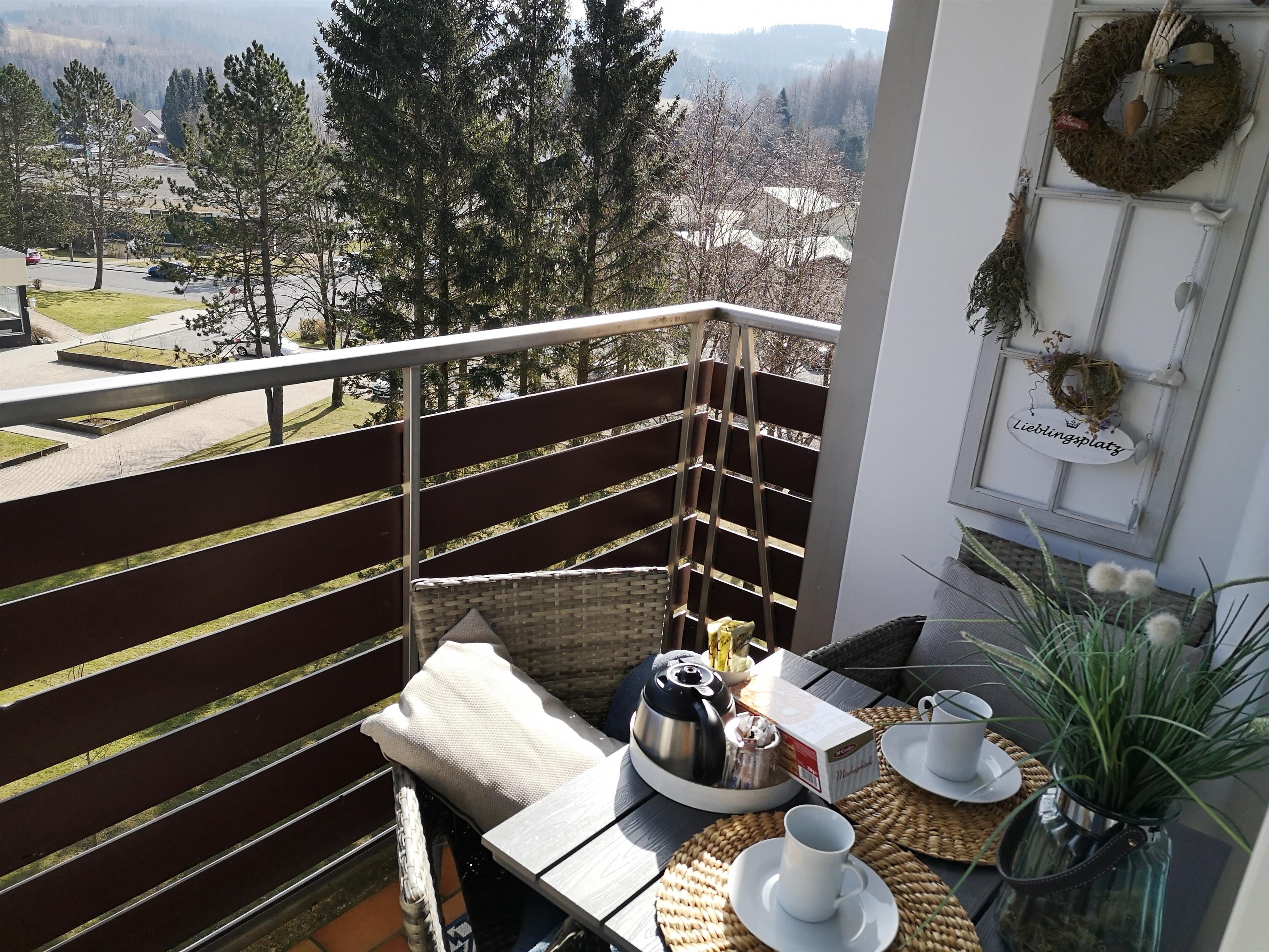 Das helle Badezimmer verfügt über Dusche und praktische Ablageflächen. Ein Balkon mit Outdoor-Möbeln bietet die Möglichkeit, den Tag entspannt an der frischen Harzluft zu beginnen oder ausklingen zu lassen.