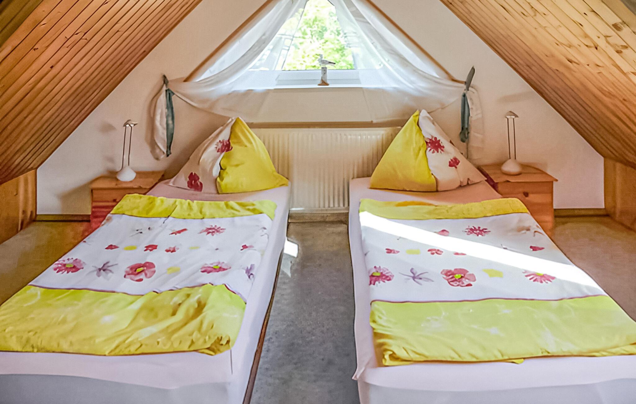 Die gemütliche Ferienwohnung (zwei Wohnebenen) befindet sich im Obergeschoss eines Wohnhauses, Zugang über separate Außentreppe. Ausstattung mit einem kombinierten Wohn-/Schlafraum (Polstersitzecke, Doppelbett, TV, Radio), Schlafraum über Treppe im DG (2 Polsterliegen, keine Tür), Küchenzeile mit 2-Platten-Kocher und Mikrowelle, DU/WC, Zentralheizung. Zur Verfügung stehen Sitz- und Grillecke im Garten, Fahrradabstellraum, TT-Platte und PKW-Stellplatz. Im Gesamtpreis sind enthalten: Endreinigung, Bettwäsche, Wasser- und Energieverbrauch. Handtücher sind bitte selbst mitzubringen. Haustiere: In diesem Objekt ist die Mitreise eines kleinen Hundes bis zu einer Risthöhe von 40 cm erlaubt.