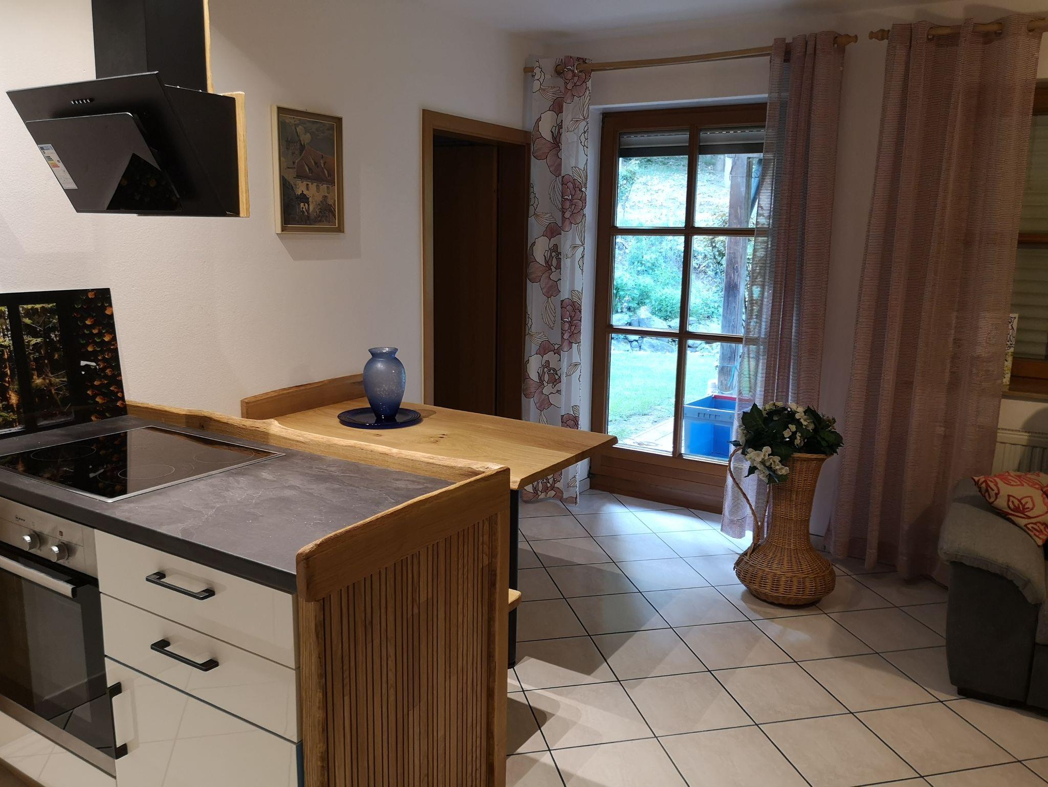 Die Ferienwohnung Fichtenschlag mit 40qm bietet Platz für bis zu 3 Personen. Sie entält eine Wohnküche mit Kaffeemaschine, Toaster; Elektroherd und Spülmaschine, außerdem ein Sofa, eine Essecke und einen Fernseher. IM schlafzimmer ist ein Doppelbett und das Badezimmer ist mit Dusche und WC ausgestattet. Die Terassentür führt auf die überdachte Terasse direkt in den Garten. Besonders im Sommer ist diese Wohnung zu empfehlen. Durch die nähe des Waldes bleibt diese schön kühl.