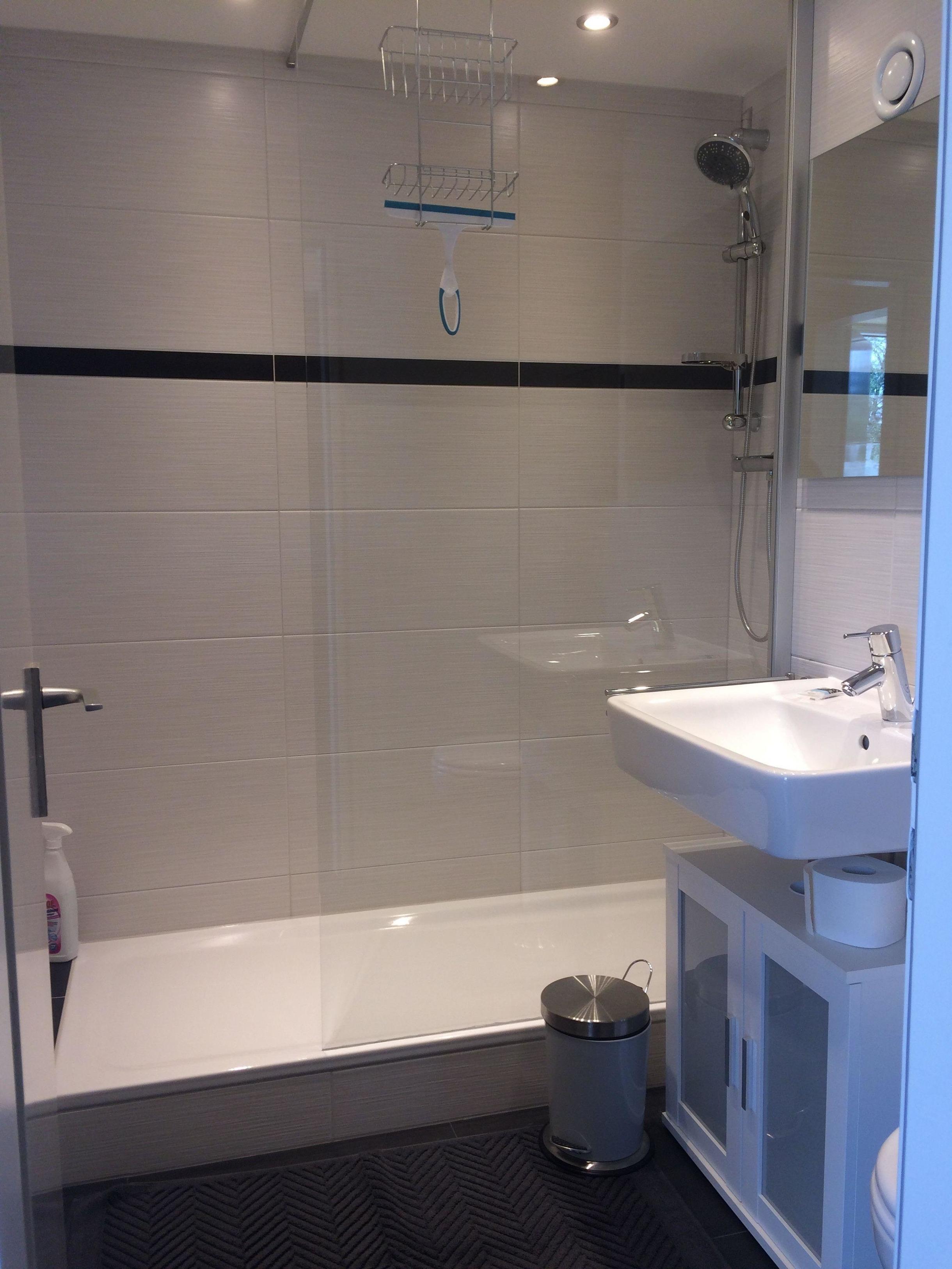 Das Bad hat eine Dusche, Föhn.