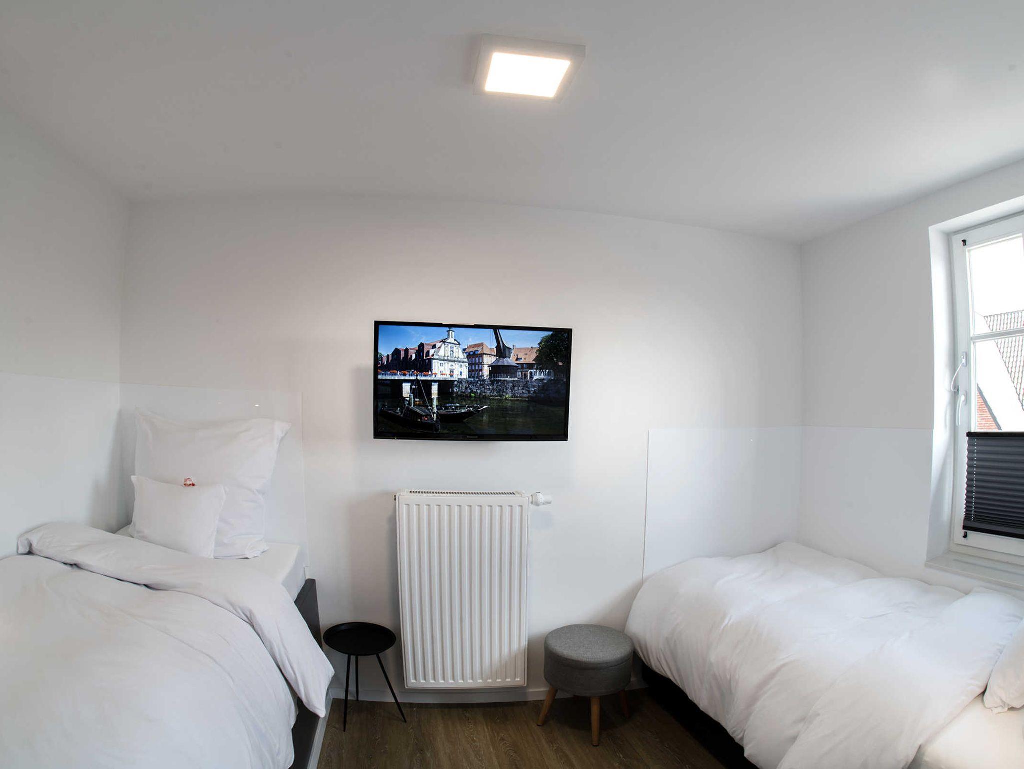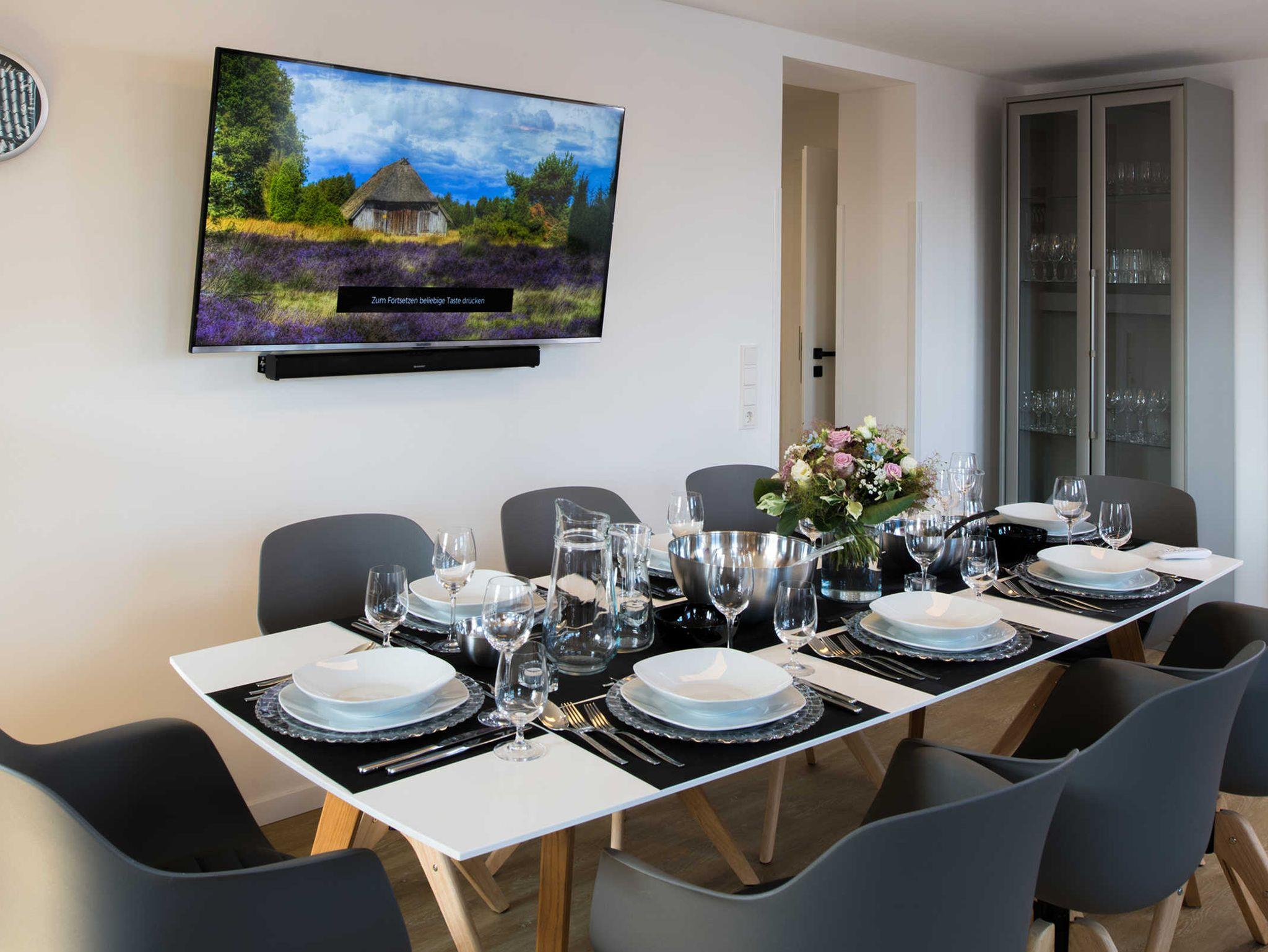 Für Ihr Entertainment steht Ihnen ein 55 Zoll großer Flachbildschirm-Hotel-TV (139 cm Bildschirmdiagonale, Telefunken) zur Verfügung, sowie: eine Soundbar für den Klang und Kopplung Ihres Smartphone/Tablets über Bluetooth, ein Internetradio (ebenfalls Kopplung von Smartphone/Tablets über Bluetooth möglich) und eine QI-Ladestation für QI-fähige Handys (kabelloses laden) + Ladekabel für Apple, Samsung und andere Typen. Der TV Empfang wird über eine SAT-Anlage eingespeist.