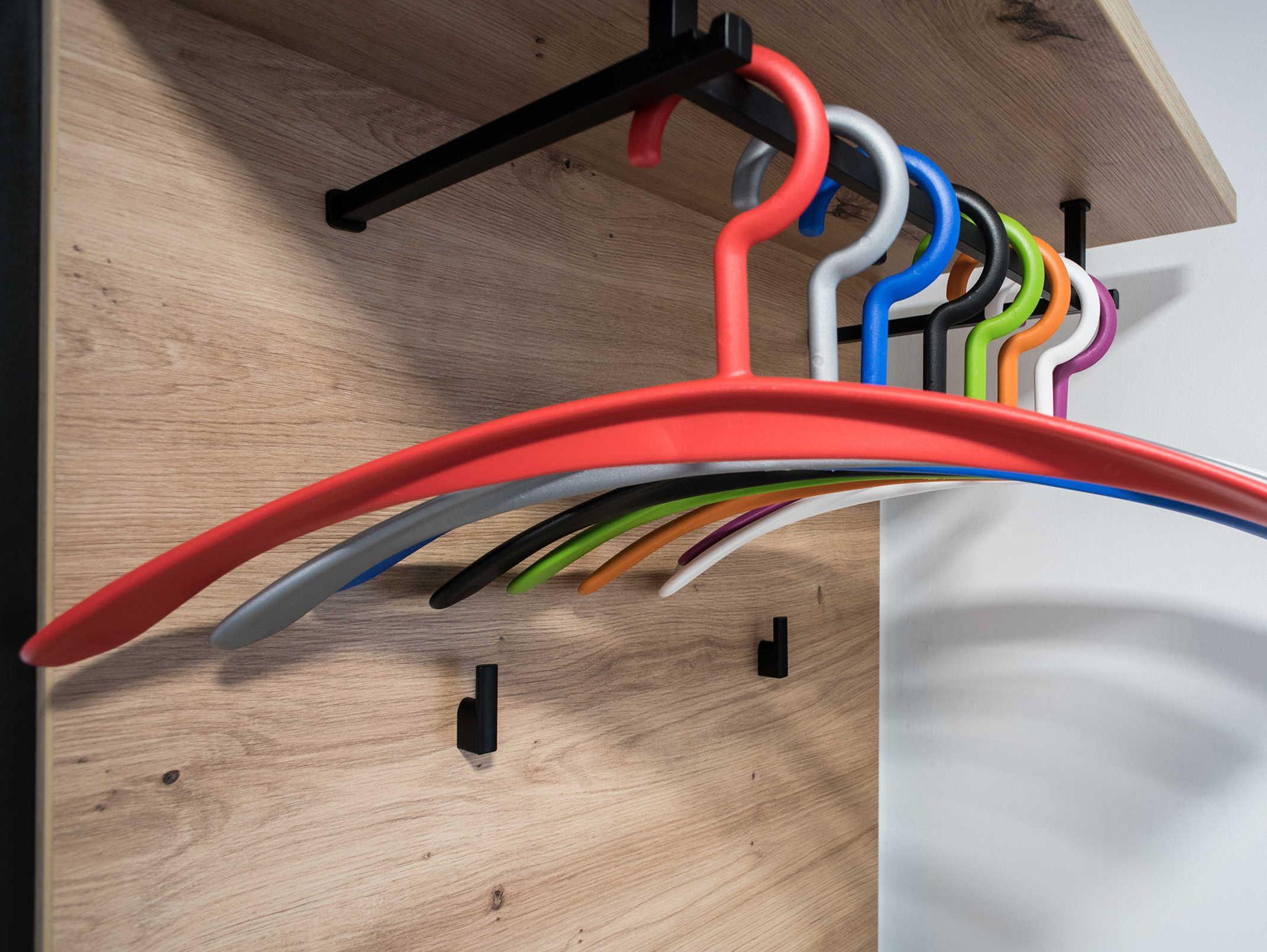 Im Flur befinden sich zwei moderne Garderoben mit genügend Platz für 8 Personen. Ein kleines Schuhregal mit Sitzkissen dient zum Hinsetzen.