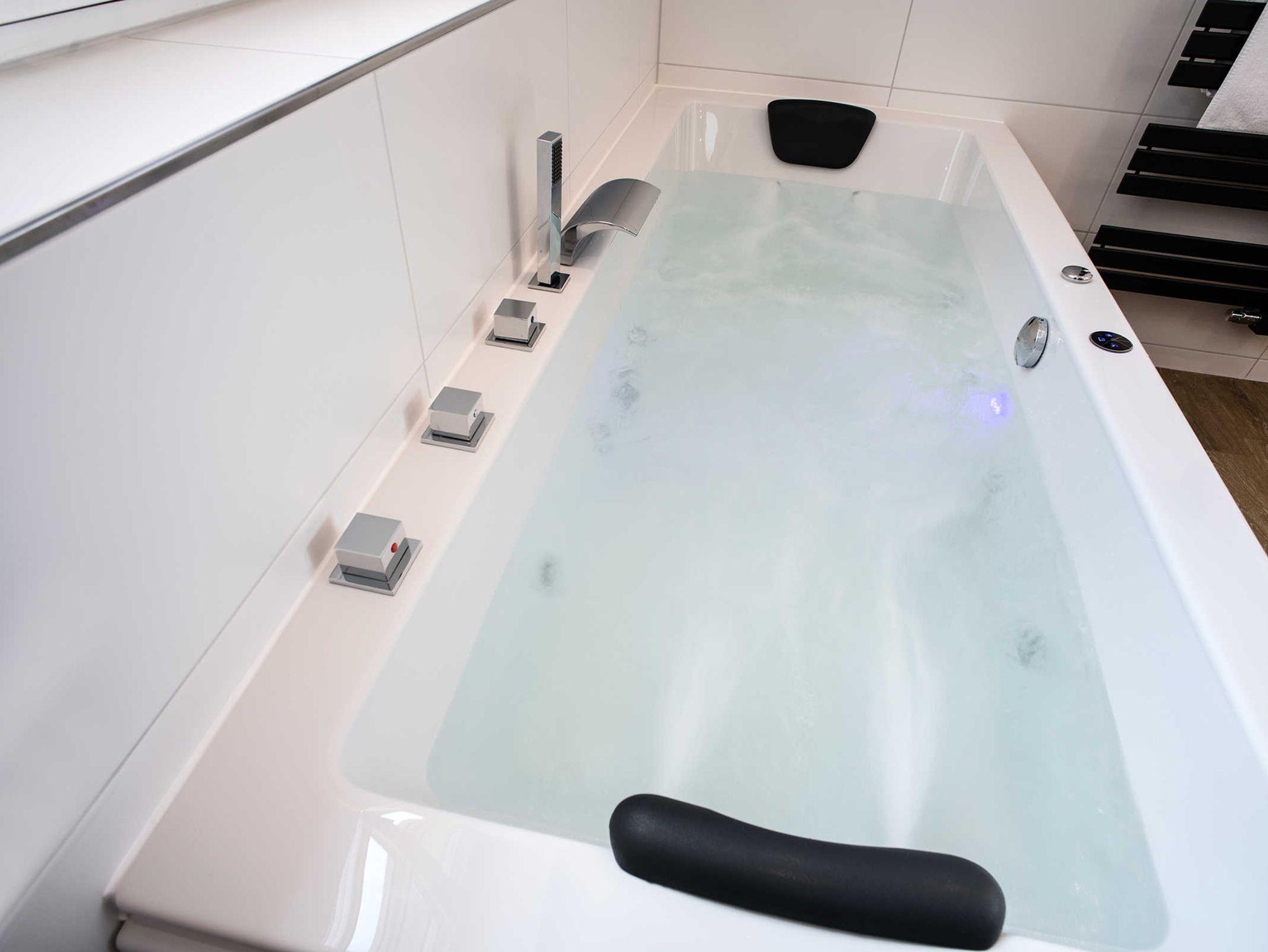Die Highlights sind die 1,00 x 2,00 m große Whirlpoolwanne für zwei Personen sowie die Infrarot-Sauna, ebenfalls für zwei Personen. Bademäntel und Extra-Handtücher für die Sauna/Whirlpoolwanne stehen für 5 €/Person zur Verfügung. Das Badfenster ist mit einem Plissee ausgestattet.