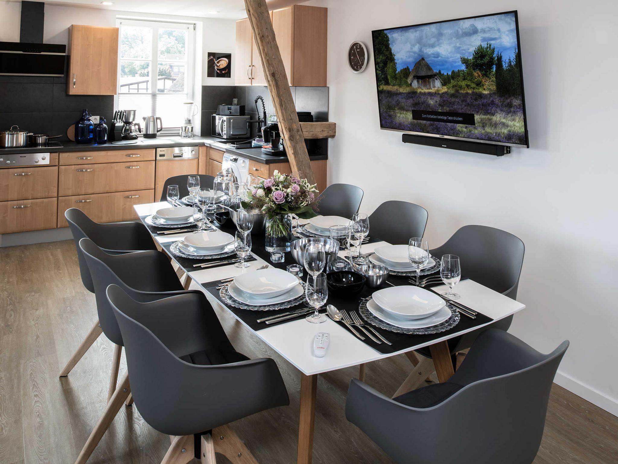 Das Wohnzimmer verfügt über ein Premium-Sofa + Schlaffunktion mit einer Liegefläche von 170 × 200 cm, optional für die siebte bzw. achte Person. Aufgrund einer hochwertigen 16 cm hohen Kaltschaumstoffmatratze und Lattenrost bietet dieses Schlaf-Sofa einen vollwertigen Schlafkomfort. Ein großer Hocker zum Füße hochlegen oder als Auflage des XXL-Tablettes (50 x 70 cm) als „Tischfunktion“. Der Design-Esstisch bietet Platz für acht Personen. In den Essstühlen lässt es sich gemütlich verweilen. Wann hatten Sie Ihren letzten „Spieleabend“? Von der Spielesammlung bis zum Monopolyspiel, Uno und Skatblatt ist alles vorhanden! Die Wohn- und Esszimmerlampen sind jeweils mittels einer Fernbedienung dimmbar.