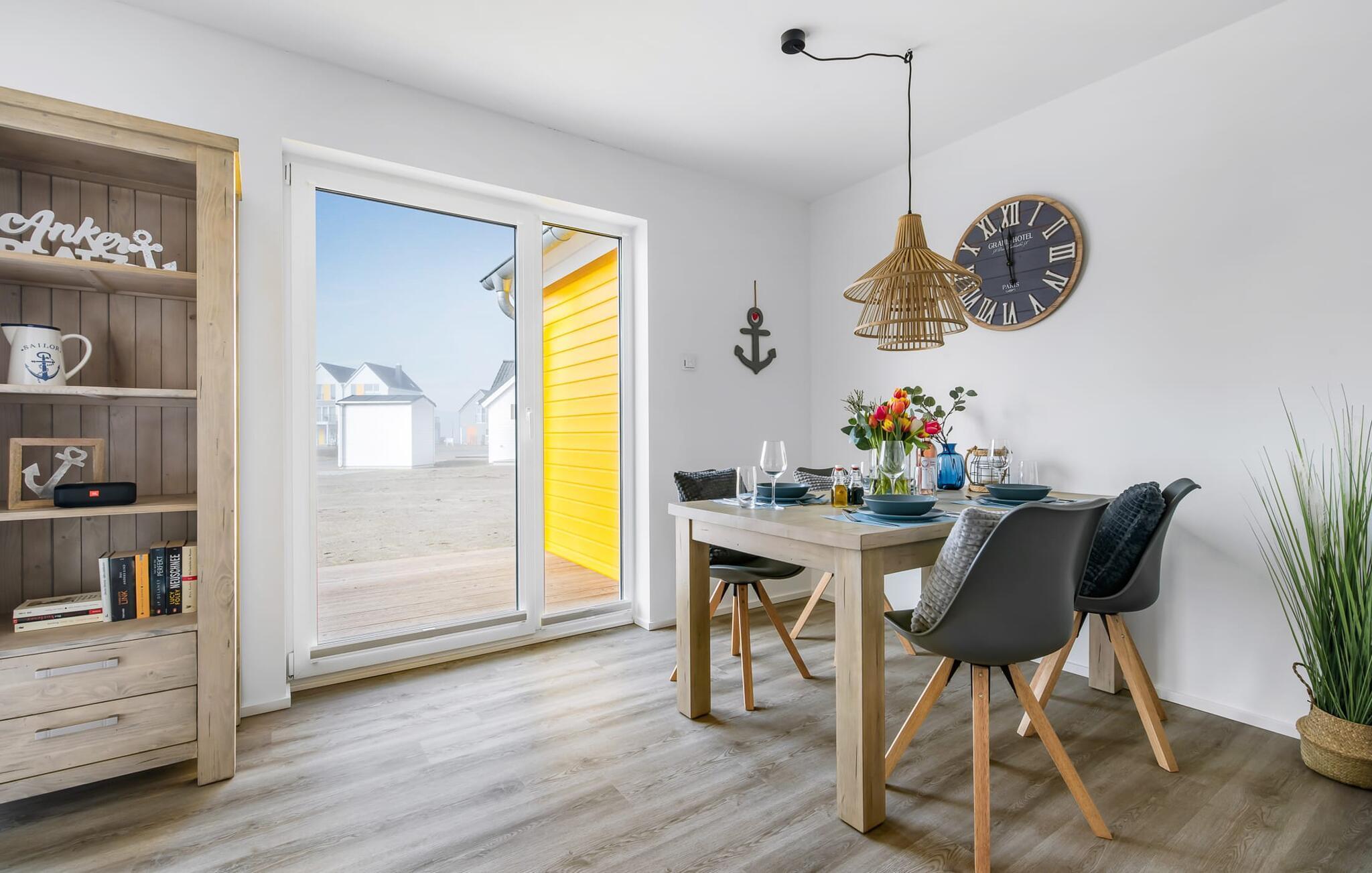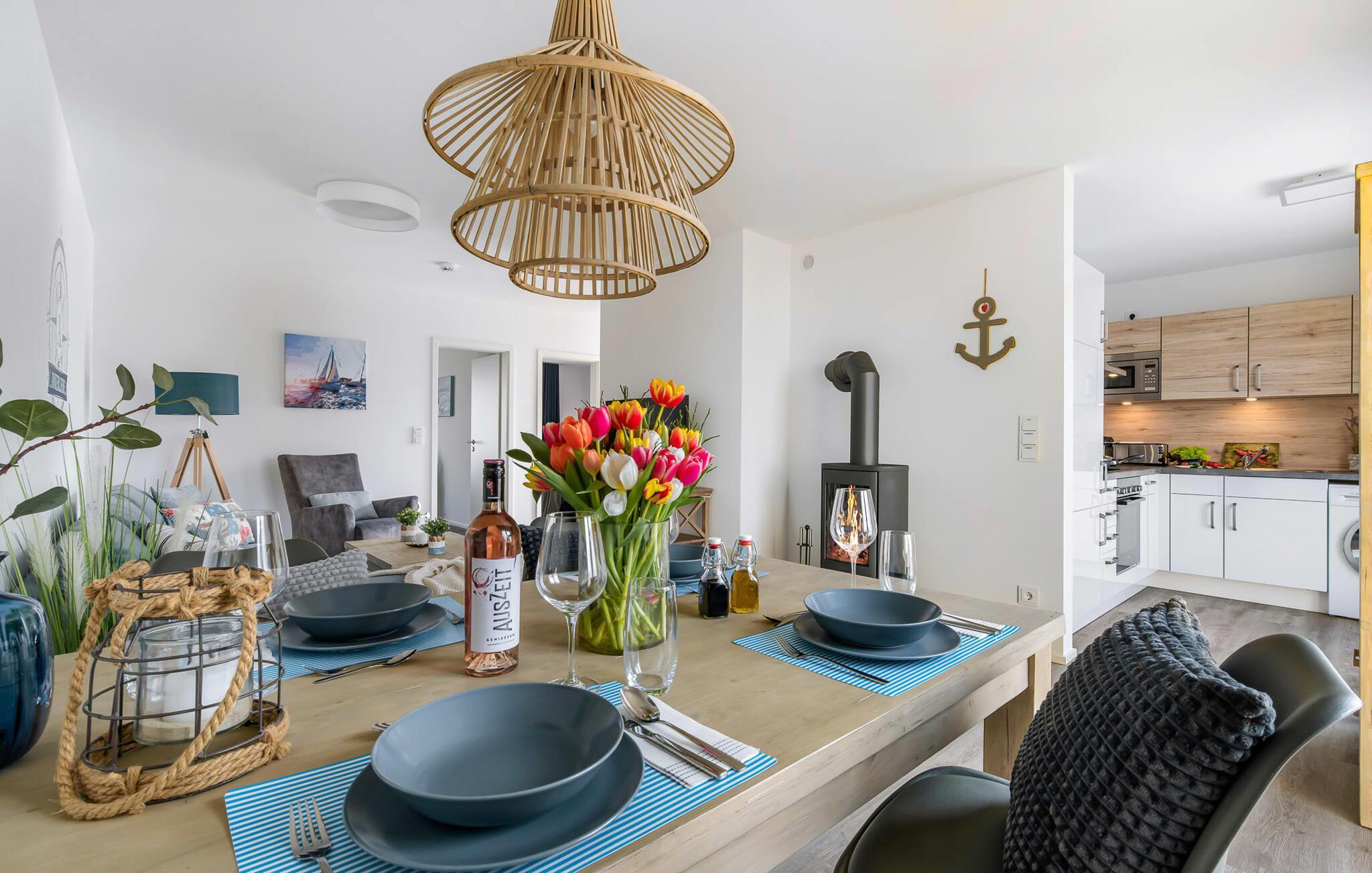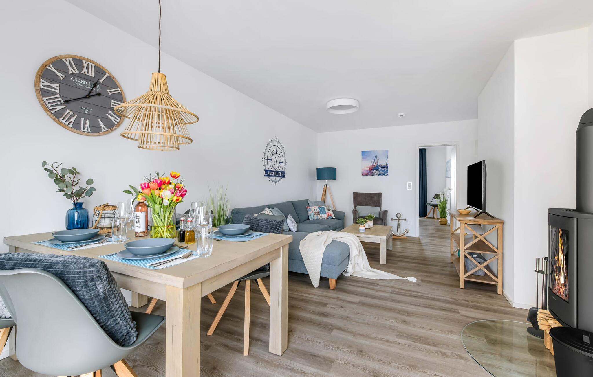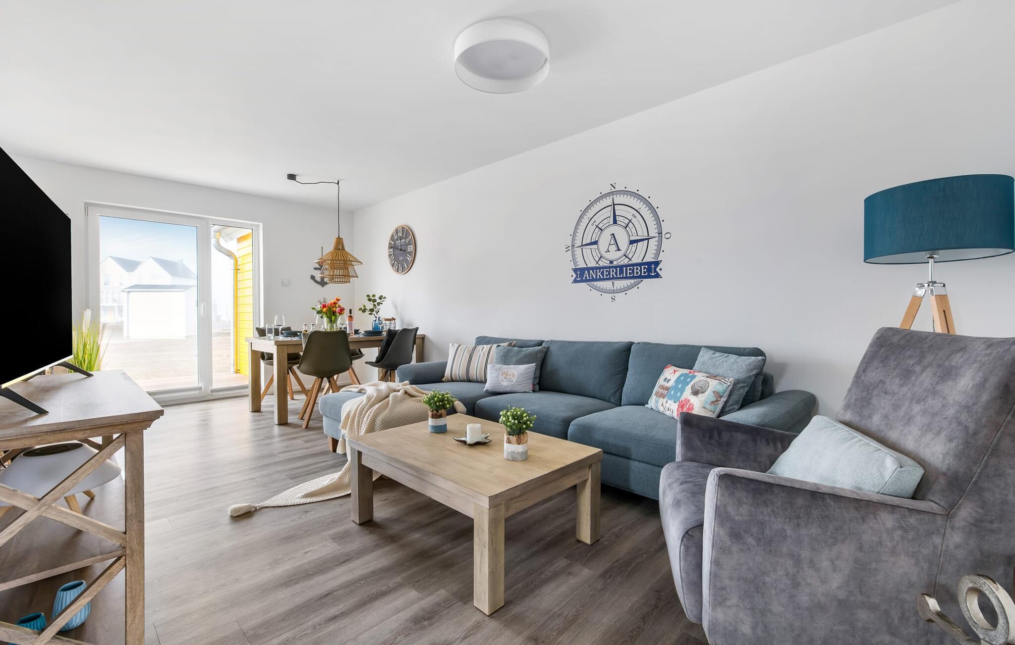 Das Haus ANKERLIEBE ist eine schönes Ferienhaus für vier Personen undwie es der Name vermuten lässtim maritimen Stil gehalten. Liebevoll eingerichtet und dekoriert empfängt den Gast der großzügige und helle Wohn-/Essbereich, der durch seine bodentiefe Fensterfront besticht. Eine gemütliche Wohnlandschaft mit Fernseher und Kaminofen lädt zum Faulenzen ein und lässt den Alltag verblassen. Die integrierte Küche ist professionell ausgestattet und macht Lust auf gemeinsames Köcheln und Genießen. Und das Genießen findet auf der angrenzenden Terrasse statt, die mit komfortablen Outdoormöbeln und einem Grill gesellige Stunden im Freien verspricht.