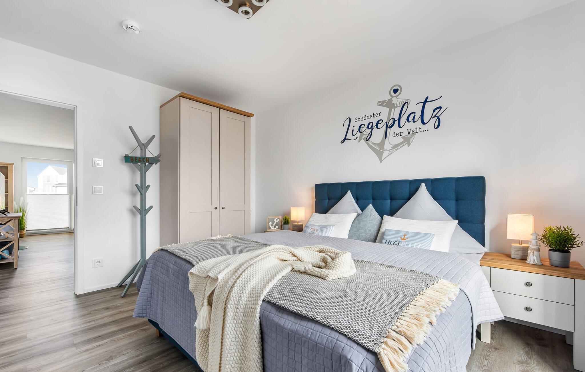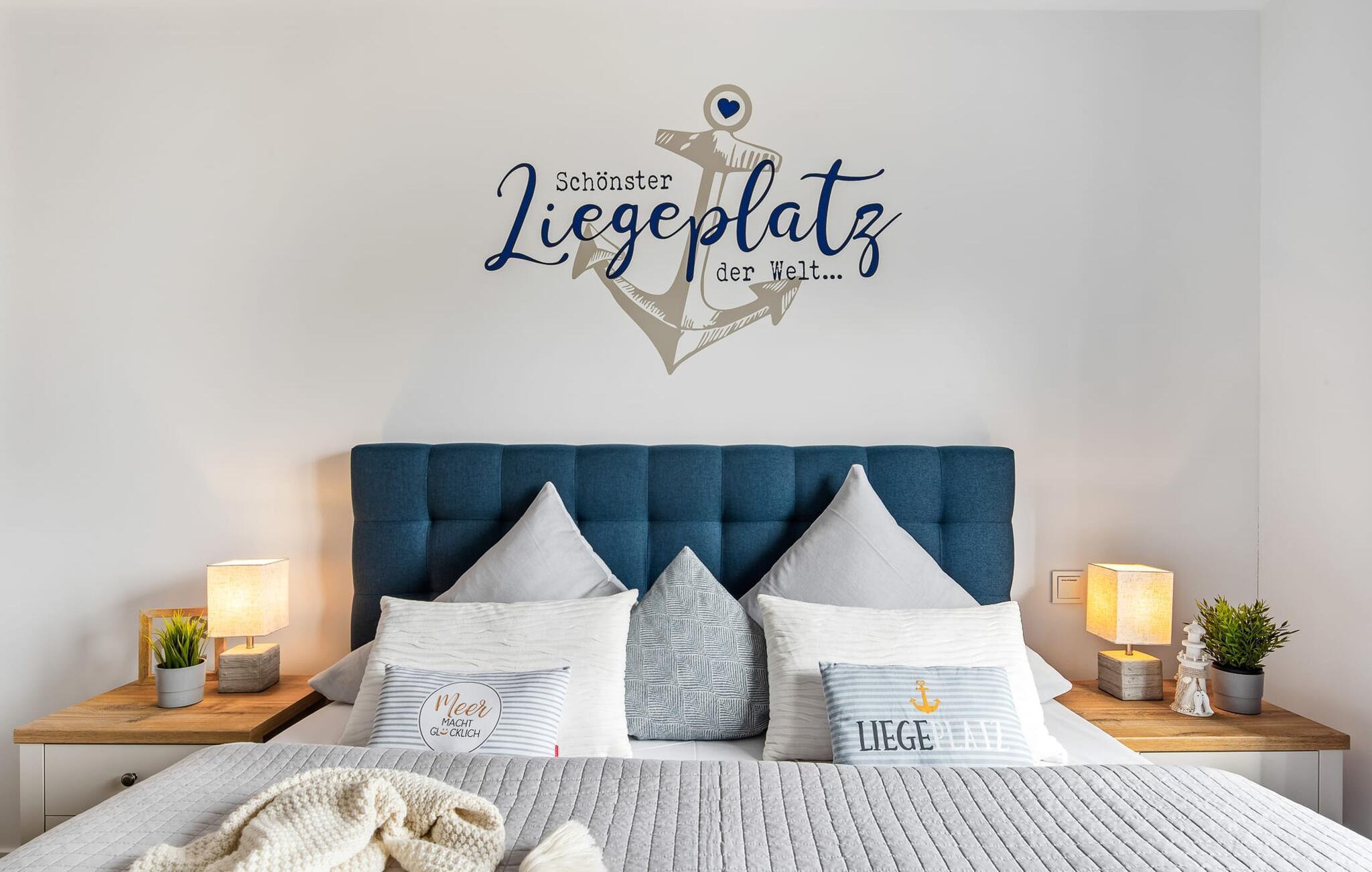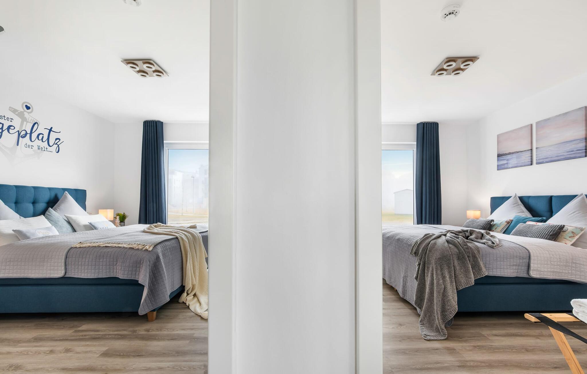 Für die nächtliche Erholung stehen zwei ebenfalls maritim eingerichtete Schlafzimmer mit bodentiefen Fenstern zur Auswahl. Die Gäste können wählen zwischen einem Doppelbett oder zwei Einzelbetten. Egal wie man sich entscheidet, schlafen tut man überall gut.