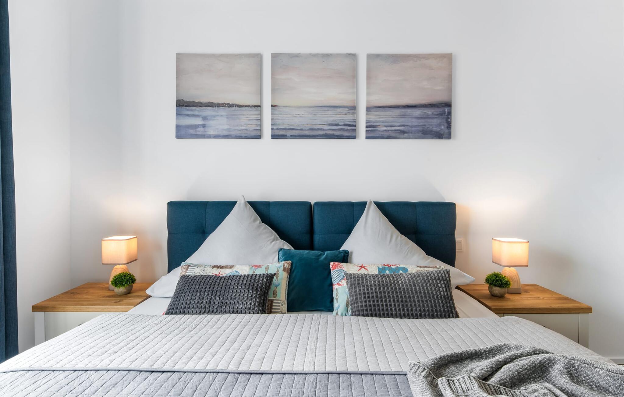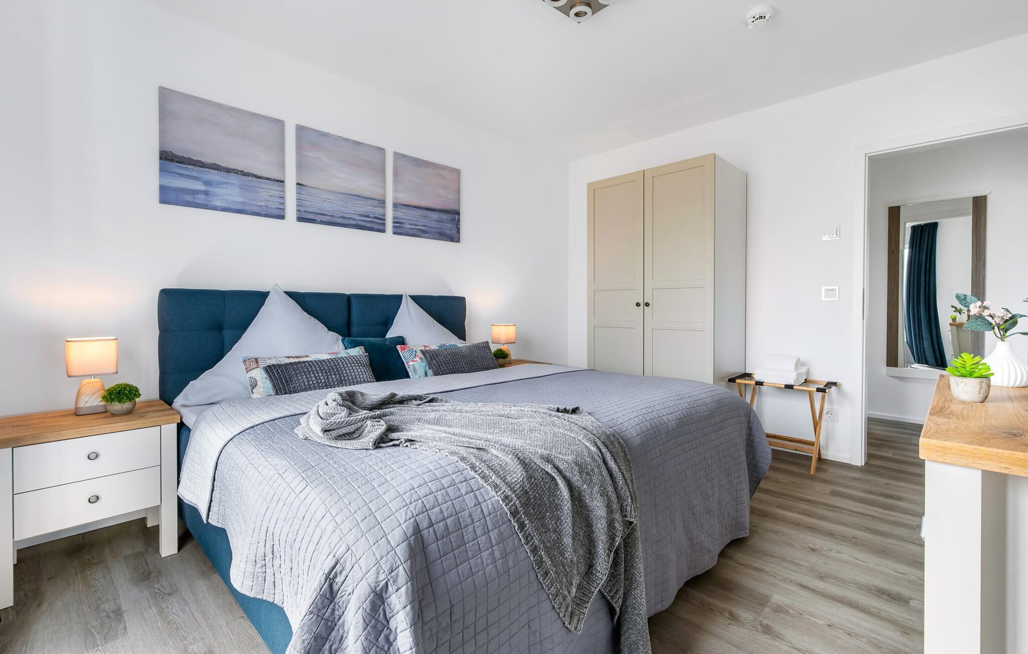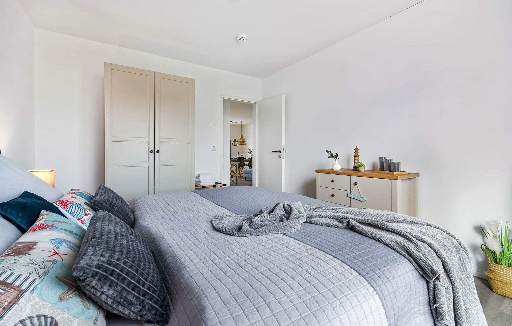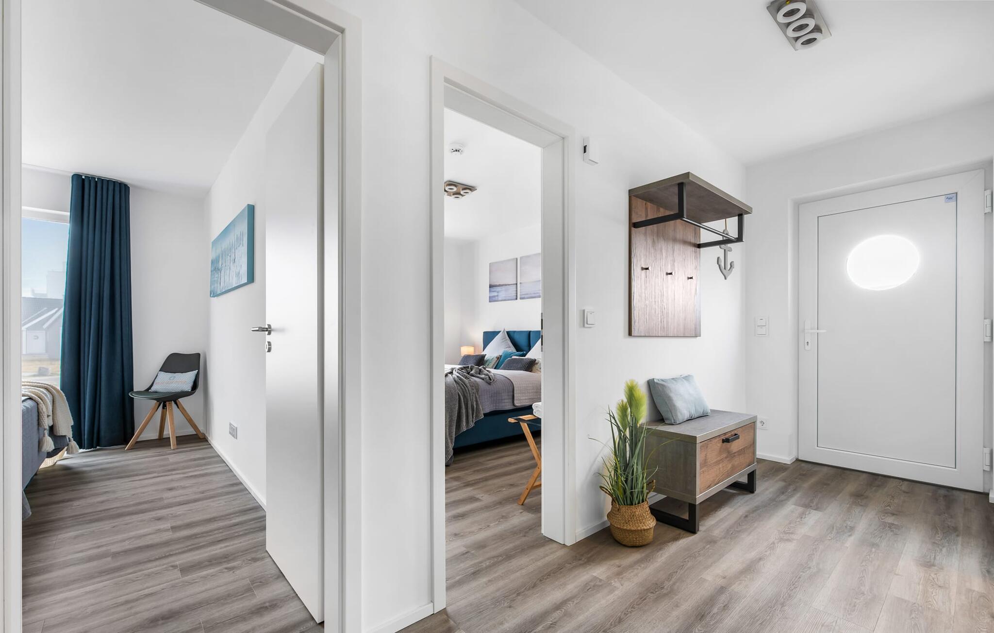 Für die nächtliche Erholung stehen zwei ebenfalls maritim eingerichtete Schlafzimmer mit bodentiefen Fenstern zur Auswahl. Die Gäste können wählen zwischen einem Doppelbett oder zwei Einzelbetten. Egal wie man sich entscheidet, schlafen tut man überall gut.