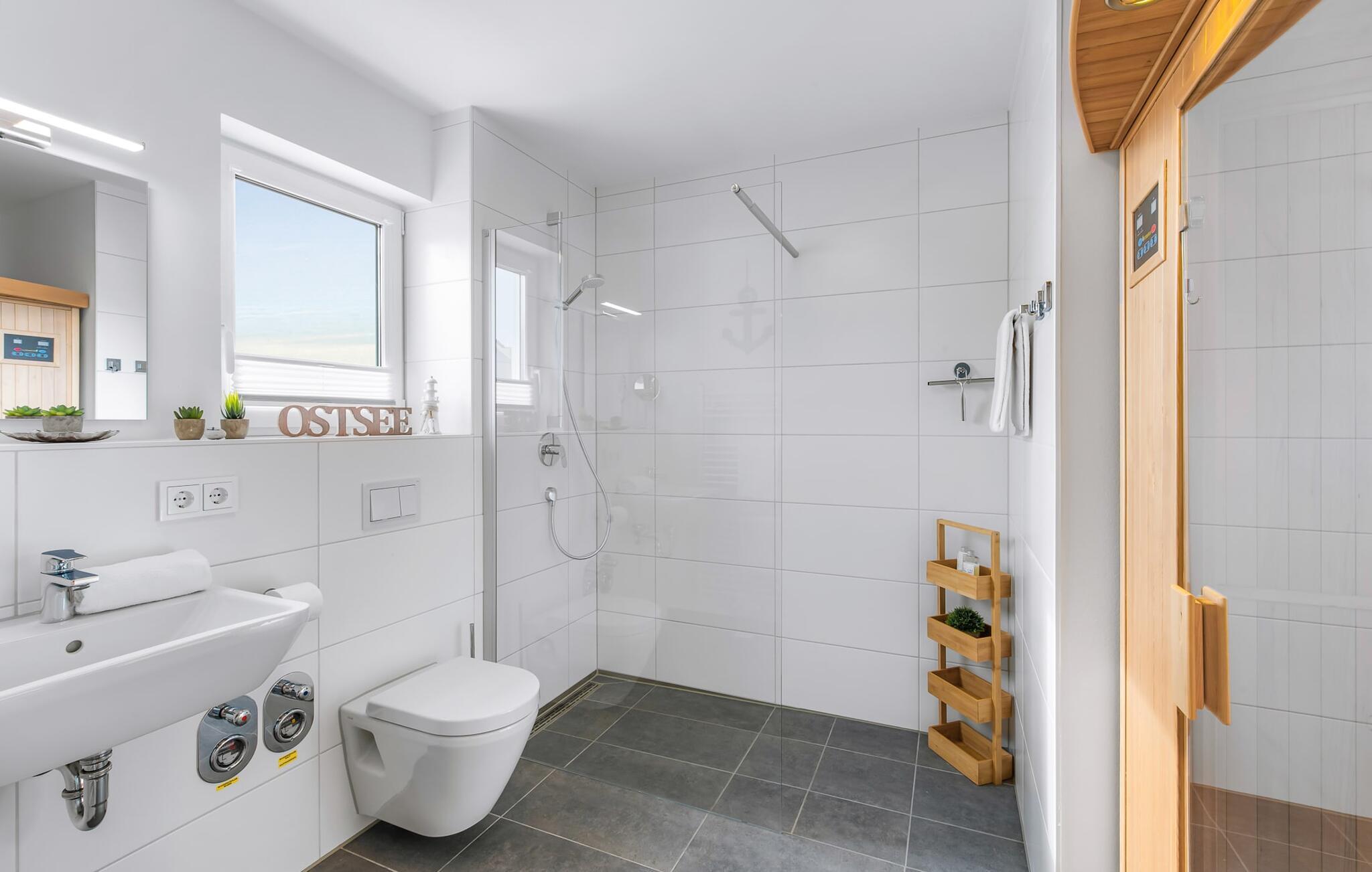 Das Bad bietet alles, was für den Start in einen Tag nötig ist und entpuppt sich als kleine private Wellnessoase. Neben einer ebenerdigen Dusche verwöhnt eine Infrarot-Sauna nach einem anstrengenden Urlaubstag den Gast und sorgt für die totale Entspannung.