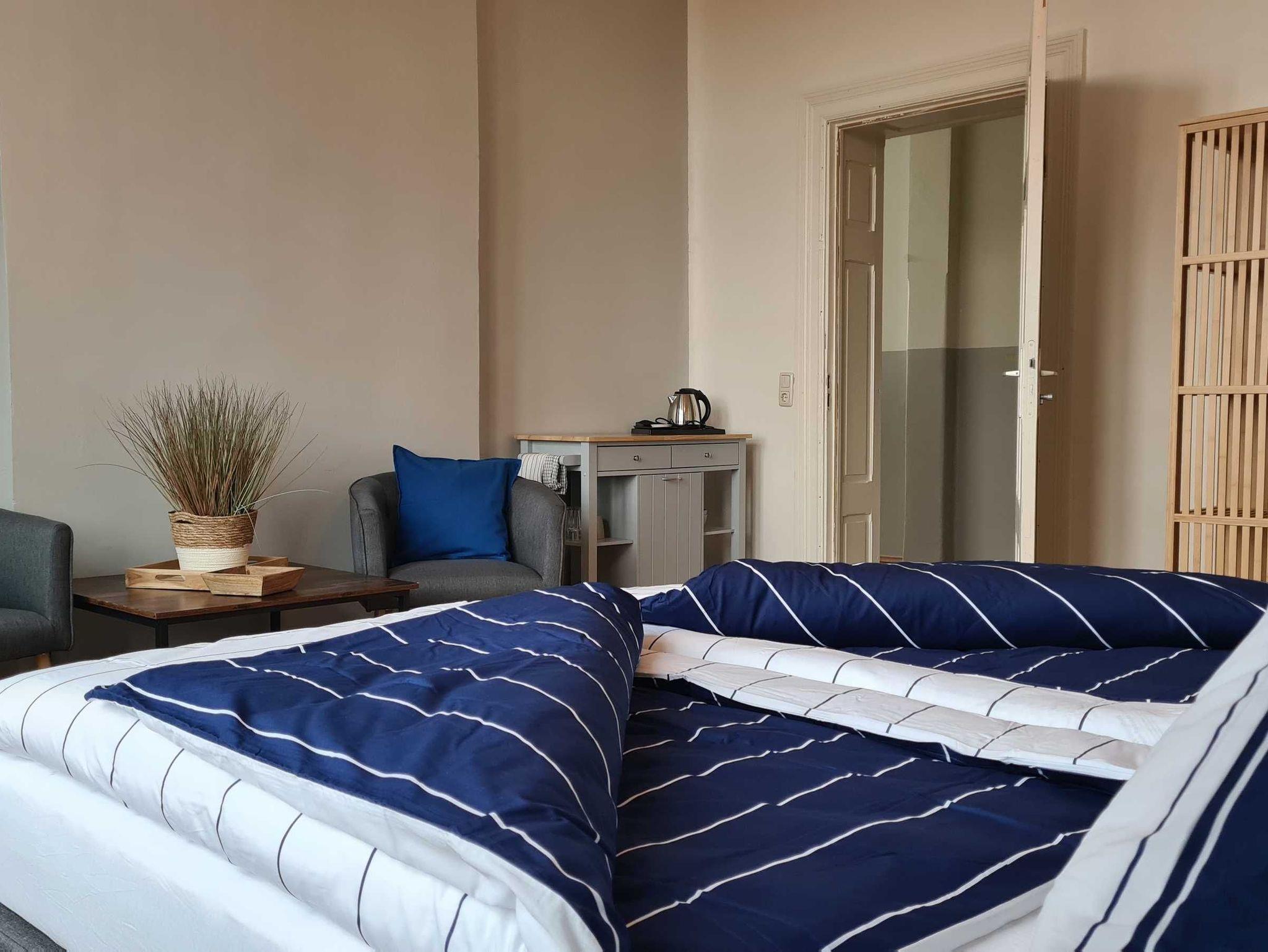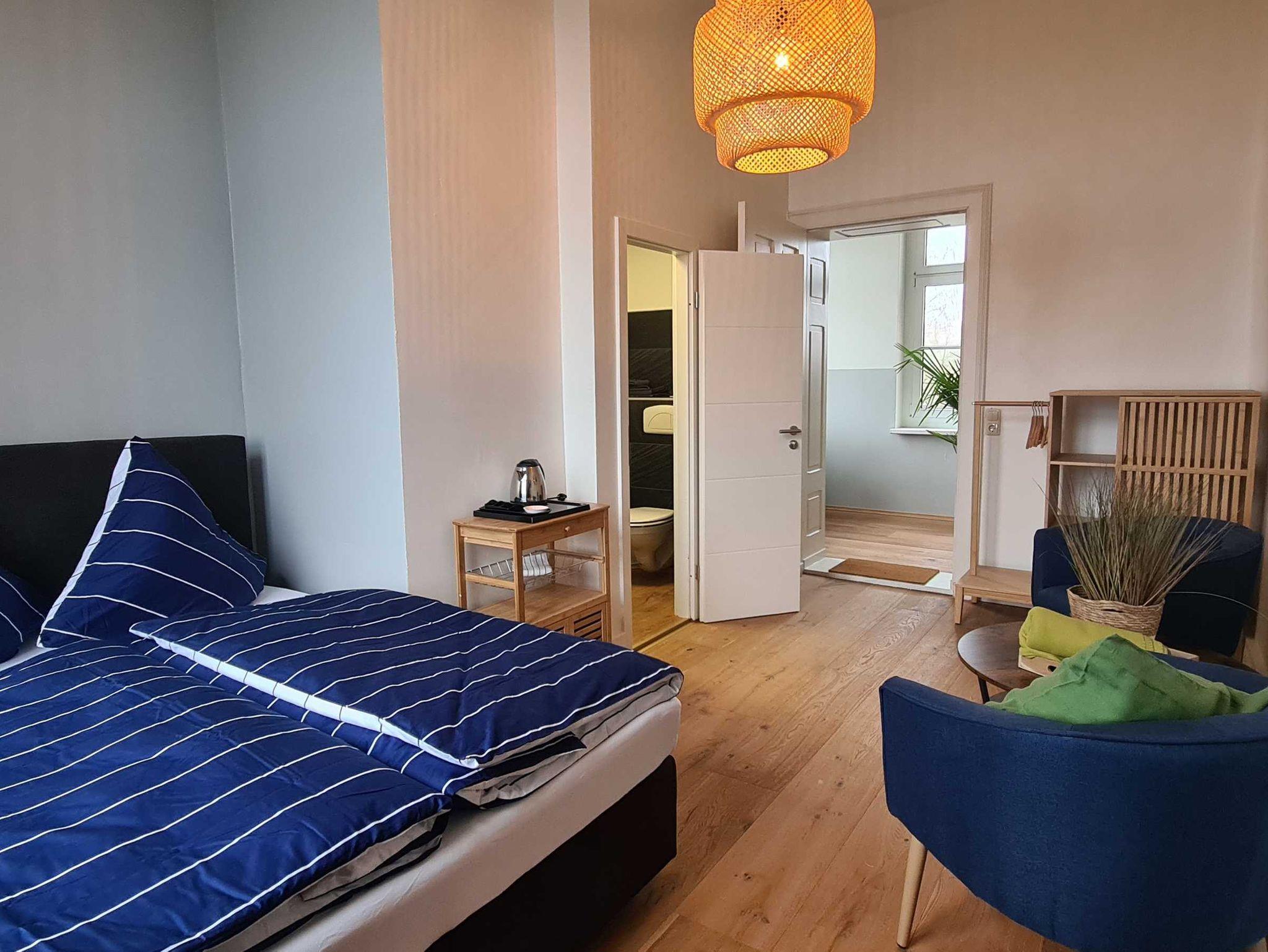 Modernisiertes Doppelzimmer im historischen Alten Lazarett in Anklam, ideal für komfortable Aufenthalte nahe Usedom.